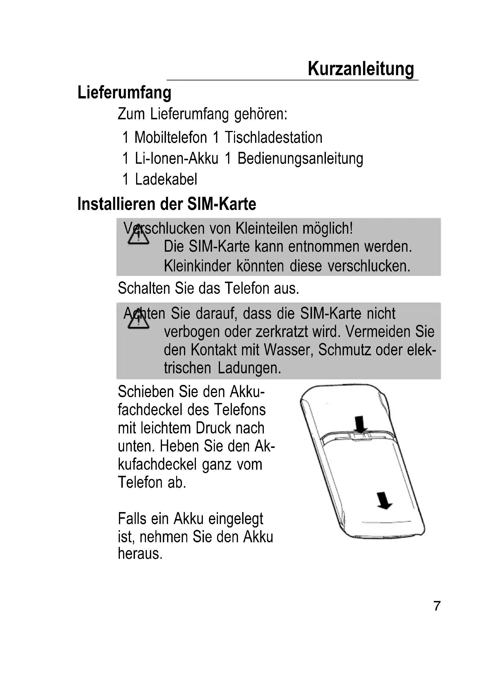 Verschlucken von Kleinteilen möglich! Die SIM-Karte kann entnommen werden. Kleinkinder konnten diese verschlucken.