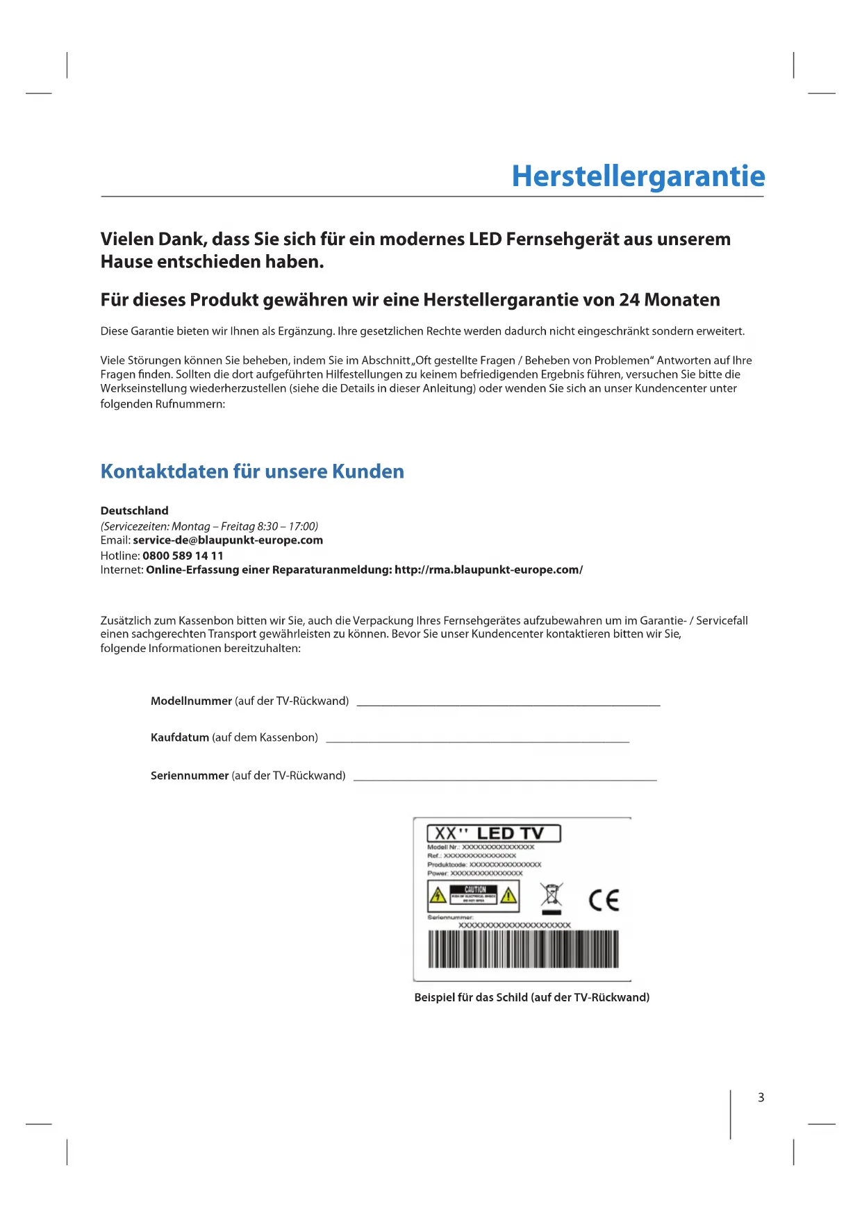 Modell: 23/173I-HT-FHBKUP-DE 23/173I-GB-FHBKUP-DE 32/173G-GB-TCUP-DE 32/173I-HT-1HBKUP-DE 32/173I-GB-1HBKUP-DE 40/173G-GB-FTCUP-DE 40/173I-GB-FHBKUP-DEindesign blank page3 Herstellergarantie Vielen Dank, dass Sie sich für ein modernes LED Fernsehgerät aus unserem Hause entschieden haben. Für dieses Produkt gewähren wir eine Herstellergarantie von 24 Monaten Diese Garantie bieten wir Ihnen als Ergänzung. Ihre gesetzlichen Rechte werden dadurch nicht eingeschränkt sondern erweitert. Viele Störungen können Sie beheben, indem Sie im Abschnitt „Oft gestellte Fragen / Beheben von Problemen“ Antworten auf Ihre Fragen nden. Sollten die dort aufgeführten Hilfestellungen zu keinem befriedigenden Ergebnis führen, versuchen Sie bitte die Werkseinstellung wiederherzustellen (siehe die Details in dieser Anleitung) oder wenden Sie sich an unser Kundencenter unter folgenden Rufnummern: Kontaktdaten für unsere Kunden Zusätzlich zum Kassenbon bitten wir Sie, auch die Verpackung Ihres Fernsehgerätes aufzubewahren um im Garantie- / Servicefall einen sachgerechten Transport gewährleisten zu können. Bevor Sie unser Kundencenter kontaktieren bitten wir Sie, folgende Informationen bereitzuhalten: Modellnummer (auf der TV-Rückwand) __________________________________________________ Kaufdatum (auf dem Kassenbon) __________________________________________________ Seriennummer (auf der TV-Rückwand) __________________________________________________ Deutschland (Servicezeiten: Montag – Freitag 8:30 – 17:00) Email: service-de@blaupunkt-europe.com Hotline: 0800 589 14 11 Internet: Online-Erfassung einer Reparaturanmeldung: http://rma.blaupunkt-europe.com/ Beispiel für das Schild (auf der TV-Rückwand)4 Aufstellen und Sicherheit Bitte lesen Sie vor der Inbetriebnahme Ihres Fernsehgerätes diese Sicherheits- hinweise sorgfältig durch und beachten Sie folgende Hinweise: Zum Heben und Tragen eines Fernsehgerätes mit einem Gewicht von über 20kg sind mindestens 2 Personen erfor-derlich. Achtung! Dieses Fernsehgerät umfasst keine durch den Benutzer reparierbaren Bauteile. Wenden Sie sich bei Störungen an den Hersteller oder den autorisierten Service. Die Berührung einiger Teile im Innereren des Gerätes ist u.U. lebensgefährlich. Schäden die durch unsachgemäße Eingrif-fe entstehen, unterliegen nicht der Gerätegarantie!Die Rückwand bitte nicht abnehmen. Bitte stellen Sie niemals Kerzen oder andere o ene Flammen in die Nähe des Fernsehgerätes, um das Übergreifen von Feuer zu verhindern. Dieses Fernsehgerät ist für den Empfang und die Wieder- gabe von Bild- und Tonsignalen bestimmt. Jede andere Verwendung ist ausdrücklich ausgeschlossen. Der ideale Betrachtungsabstand beträgt etwa das Fün ache der Bildschirmdiagonalen. Fremdlicht auf dem Bildschirm führt zu Re exionen und kann die Bildqualität beeinträch- tigen. Bitte achten Sie auf eine ausreichende Belüftung und sorgen Sie für genügend Abstand in der Schrankwand oder zu anderen Möbelstücken. Das Fernsehgerät ist ausschließlich für den Betrieb in trockenen Räumen bestimmt. Sollten Sie es dennoch im Freien betreiben, sorgen Sie unbedingt dafür, dass es vor Feuchtigkeit (Regen, Spritzwasser) geschützt ist. Setzen Sie das Fernsehgerät keinerlei Feuchtigkeit aus. Stellen Sie keine mit Flüssigkeiten gefüllten Gefäße, wie Vasen oder Ähnliches, auf das Gerät. Das Gefäß könnte umkippen und die elektrische Sicherheit beinträchtigen. Platzieren Sie das Fernsehgerät ausschließlich auf ebenen und stabilen Unterlagen. Legen Sie keine Gegenstände, wie z.B.: Zeitungen, Decken oder Ähnliches, auf oder unter das Fernsehgerät. Achten Sie darauf, dass das Fernsehgerät nicht auf elektri- schen Leitungen steht, da diese dadurch beschädigt werden können. Mobiltelefone oder andere elektrische Funkwellen abstrahlende Geräte wie WLAN- Adapter, Funküberwa-chungskamera o.ä. können elektromagnetische Störungen verursachen und sollten nicht in der Nähe des Fernsehgerä-tes platziert werden. Stellen Sie das Gerät nicht in unmittelbarer Nähe von Heizquellen oder in der prallen Sonne auf, dadurch wird die Kühlung des Gerätes beeinträchtigt. Wärmestaus sind Gefahrenquellen und beinträchtigen die Lebensdauer Ihres Fernsehgeräts erheblich. Lassen Sie sicherheitshalber Abla-gerungen von Zeit zu Zeit von einem Fachmann entfernen. Achten Sie darauf, dass das Netzkabel oder (wenn vorhan- den) der Netzadapter nicht beschädigt wird. Das Fernsehge-rät darf nur mit dem beiliegenden Netzkabel/Netzadapter betrieben werden. Gewitter stellen eine Gefahr für jedes elektrische Gerät dar. Auch wenn das Fernsehgerät ausgeschaltet ist, kann es durch einen Blitzschlag in das Stromnetz und/oder die Antennenleitung beschädigt werden. Bei einem Gewitter sollten Sie daher Erase immer alle zum Gerät führenden Stecker und Kabel trennen. Reinigen Sie den Bildschirm nur mit einem leicht befeuchte- ten und weichen Tuch. Verwenden Sie nur klares Wasser und niemals Reinigungs üssigkeiten oder gar Lösungsmittel. Hinweis: Der Aufbau des Produkts entspricht der Schutzklasse 1. Als Spannungsquelle darf nur eine ordnungsgemäße Netz-steckdose mit Schutzleiter (230V~/50Hz) des ö entlichen Versorgungsnetzes verwendet werden. Schließen Sie keine externen Geräte an, wenn Ihr Fernseh- gerät eingeschaltet ist. Schalten Sie vor dem Anschließen auch die anderen anzuschließenden Geräte aus! Stecken Sie den Netzstecker Ihres Fernsehgerätes erst dann wieder in die Steckdose, wenn Sie die externen Geräte und die Antenne angeschlossen haben! Sorgen Sie dafür, dass der Netzschalter am Gerät und der Netzstecker immer frei zugänglich sind! Nicht für den Einsatz an Bildschirmarbeitsplätzen vorgesehen. Ständige Benutzung von Ohrhörern bei hoher Lautstärke, kann zu einer permanenten Schädigung Ihres Hörvermö-gens führen. Sorgen Sie für eine umweltschonende Entsorgung dieses Gerätes, allen weiteren Bestandteilen und den Batterien. Im Zweif