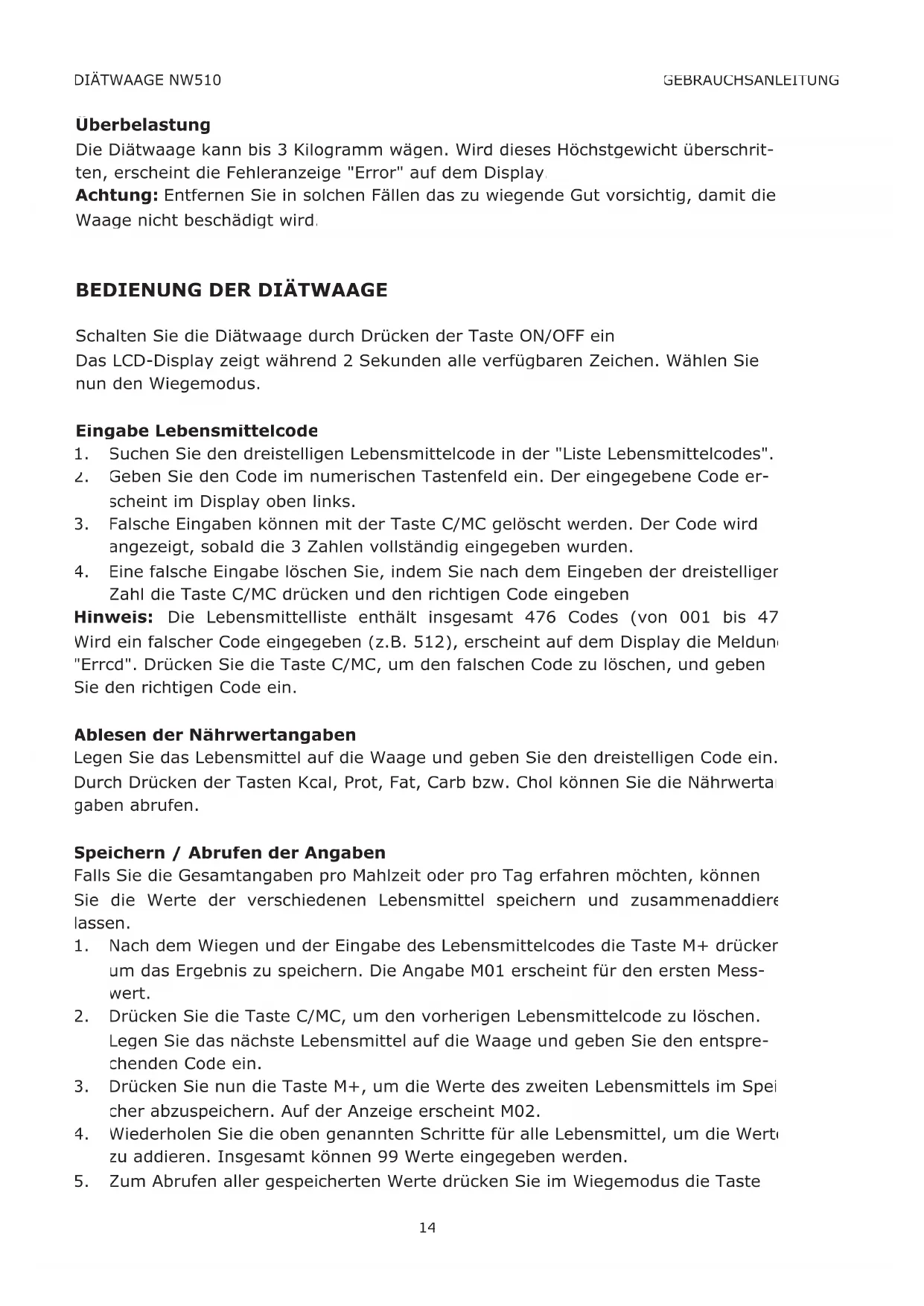Eine falsche Eingabe löschen Sie, indem Sie nach dem Eingeben der dreistelligen Zahl die Taste C/MC drücken und den richtigen Code eingeben. Hinweis: Die Lebensmittelliste enthält insgesamt 476 Codes (von 001 bis 476). Wird ein falscher Code eingegeben (z.B. 512), erscheint auf dem Display die Meldung "Errcd". Drücken Sie die Taste C/MC, um den falschen Code zu löschen, und geben Sie den richtigen Code ein. Ablesen der Nährwertangaben Legen Sie das Lebensmittel auf die Waage und geben Sie den dreistelligen Code ein. Durch Drücken der Tasten Kcal, Prot, Fat, Carb bzw. Chol können Sie die Nährwertan- gaben abrufen. Speichern / Abrufen der Angaben Falls Sie die Gesamtangaben pro Mahlzeit oder pro Tag erfahren möchten, können Sie die Werte der verschiedenen Lebensmittel speichern und zusammenaddieren lassen.