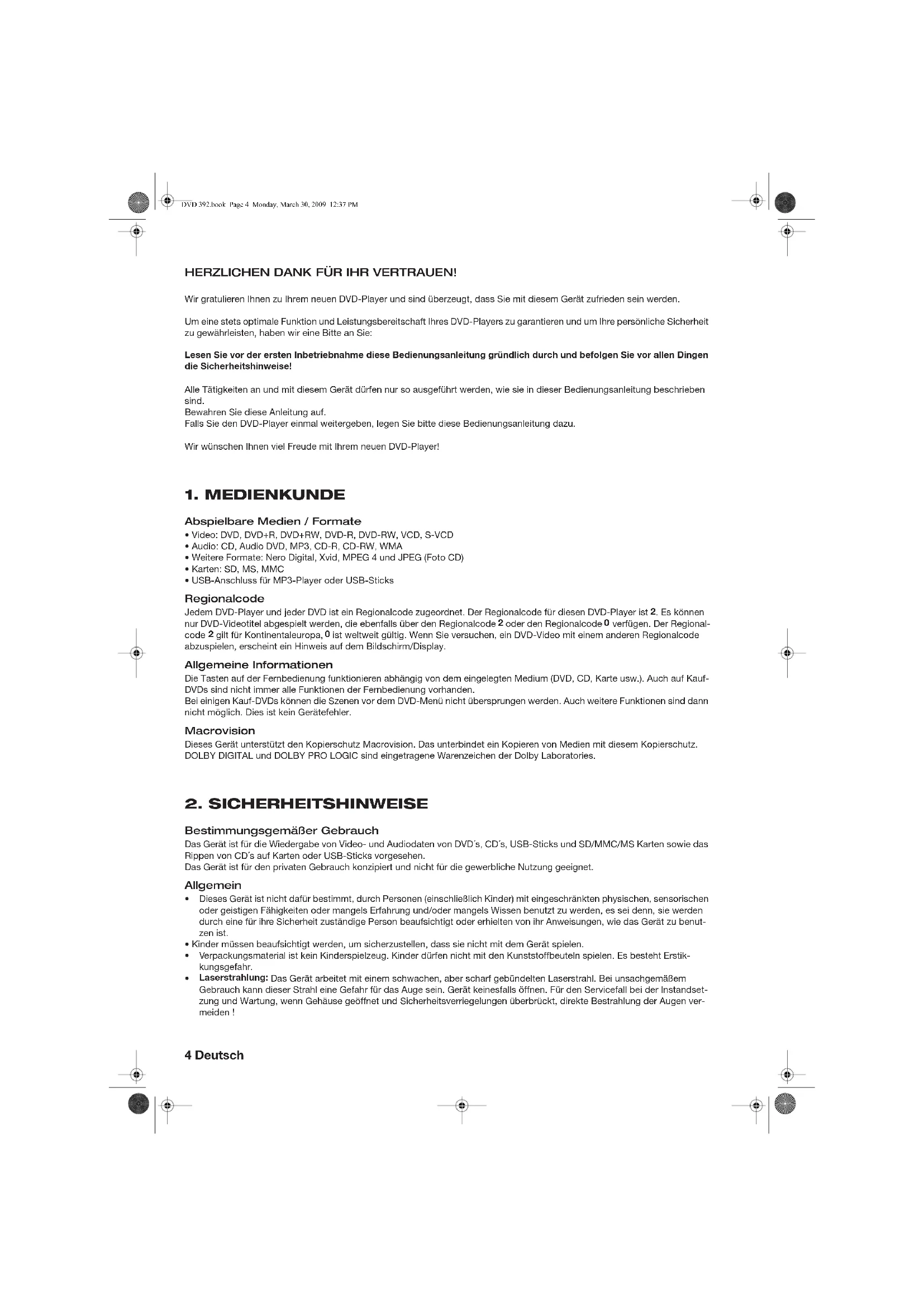 - 17. Technische Daten DVD 392.book Page 3 Monday, March 30, 2009 12:37 PM4 Deutsch HERZLICHEN DANK FÜR IHR VERTRAUEN! Wir gratulieren Ihnen zu Ihrem neuen DVD-Player und sind überzeugt, dass Sie mit diesem Gerät zufrieden sein werden. Um eine stets optimale Funktion und Leistungsbereitschaft Ihres DVD-Players zu garantieren und um Ihre persönliche Sicherheit zu gewährleisten, haben wir eine Bitte an Sie: Lesen Sie vor der ersten Inbetriebnahme diese Bedienungsanleitung gründlich durch und befolgen Sie vor allen Dingen die Sicherheitshinweise! Alle Tätigkeiten an und mit diesem Gerät dürfen nur so ausgeführt werden, wie sie in dieser Bedienungsanleitung beschrieben sind. Bewahren Sie diese Anleitung auf. Falls Sie den DVD-Player einmal weitergeben, legen Sie bitte diese Bedienungsanleitung dazu. Wir wünschen Ihnen viel Freude mit Ihrem neuen DVD-Player! p. 28
