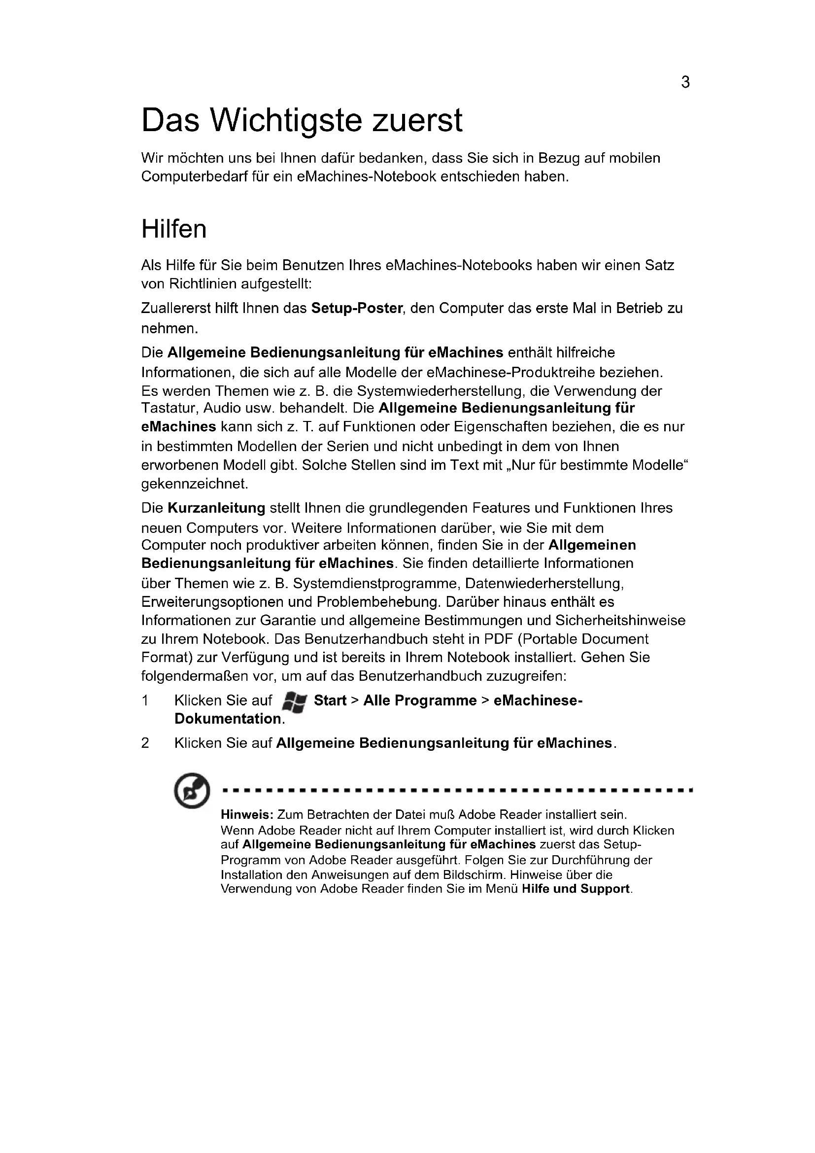 4eMachines Notebook Serie KurzanleitungModellnummer: ________________________________ Seriennummer: ________________________________ Kaufdatum: ___________________________________ Kaufort: ______________________________________ © 2010 Alle Rechte vorbehalten. Kurzanleitung für eMachines Notebook Serie Originalausgabe: 06/20103 Das Wichtigste zuerst Wir möchten uns bei Ihnen dafür bedanken, dass Sie sich in Bezug auf mobilen Computerbedarf für ein eMachines-Notebook entschieden haben. Hilfen Als Hilfe für Sie beim Benutzen Ihres eMachines-Notebooks haben wir einen Satz von Richtlinien aufgestellt: Zuallererst hilft Ihnen das Setup-Poster, den Computer das erste Mal in Betrieb zu nehmen. Die Allgemeine Bedienungsanleitung für eMachines enthält hilfreiche Informationen, die sich auf alle Modelle der eMachinese-Produktreihe beziehen. Es werden Themen wie z. B. die Systemwiederherstellung, die Verwendung der Tastatur, Audio usw. behandelt. Die Allgemeine Bedienungsanleitung für eMachines kann sich z. T. auf Funktionen oder Eigenschaften beziehen, die es nur in bestimmten Modellen der Serien und nicht unbedingt in dem von Ihnen erworbenen Modell gibt. Solche Stellen sind im Text mit „Nur für bestimmte Modelle“ gekennzeichnet. Die Kurzanleitung stellt Ihnen die grundlegenden Features und Funktionen Ihres neuen Computers vor. Weitere Informationen darüber, wie Sie mit dem Computer noch produktiver arbeiten können, finden Sie in der Allgemeinen Bedienungsanleitung für eMachines. Sie finden detaillierte Informationen über Themen wie z. B. Systemdienstprogramme, Datenwiederherstellung, Erweiterungsoptionen und Problembehebung. Darüber hinaus enthält es Informationen zur Garantie und allgemeine Bestimmungen und Sicherheitshinweise zu Ihrem Notebook. Das Benutzerhandbuch steht in PDF (Portable Document Format) zur Verfügung und ist bereits in Ihrem Notebook installiert. Gehen Sie folgendermaßen vor, um auf das Benutzerhandbuch zuzugreifen: 1 Klicken Sie auf Start > Alle Programme > eMachinese- Dokumentation. 2 Klicken Sie auf Allgemeine Bedienungsanleitung für eMachines. Hinweis: Zum Betrachten der Datei muß Adobe Reader installiert sein. Wenn Adobe Reader nicht auf Ihrem Computer installiert ist, wird durch Klicken auf Allgemeine Bedienungsanleitung für eMachines zuerst das Setup- Programm von Adobe Reader ausgeführt. Folgen Sie zur Durchführung der Installation den Anweisungen auf dem Bildschirm. Hinweise über die Verwendung von Adobe Reader finden Sie im Menü Hilfe und Support.4 Deutsch Ihre eMachines-Notebook-Tour Nachdem Sie den Computer wie im Setup-Poster gezeigt aufgestellt haben, finden Sie im Folgenden eine Übersicht über Ihr neues eMachines-Notebook. Ansicht von oben