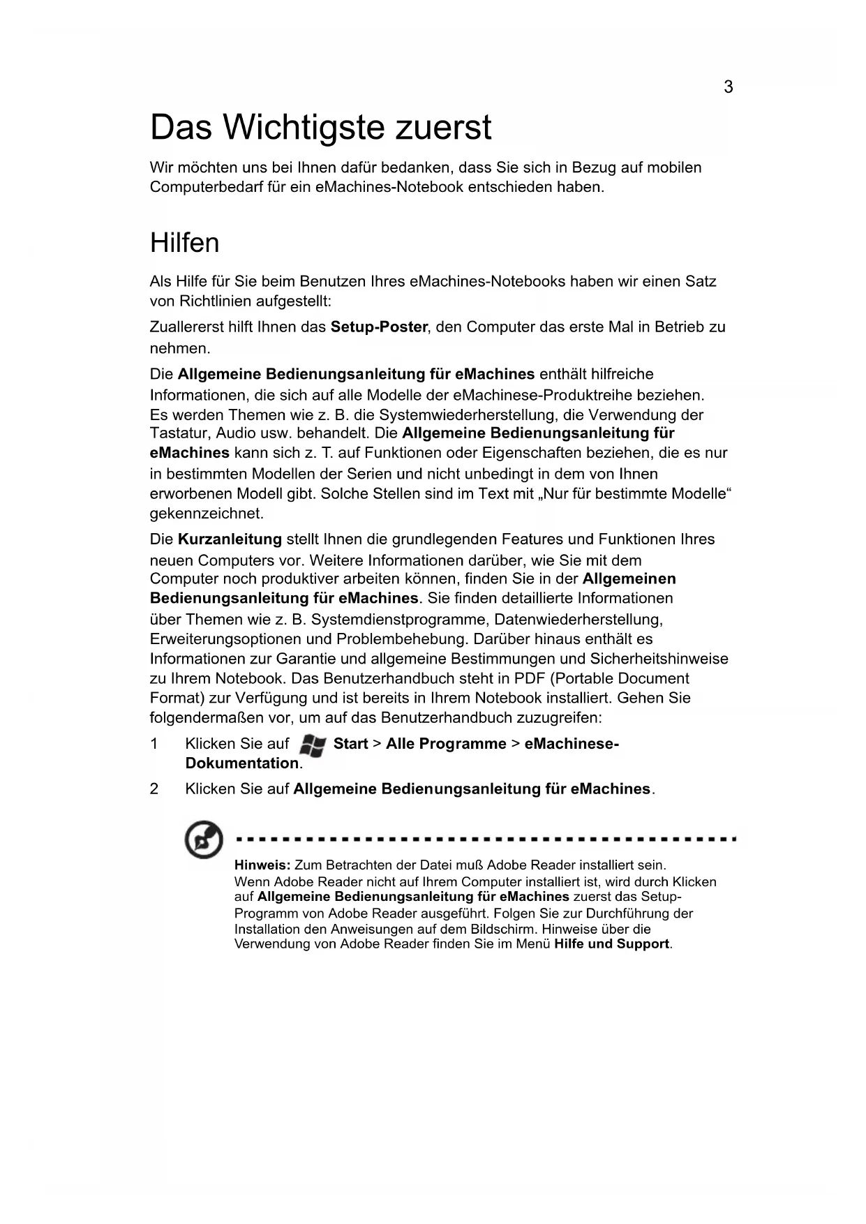 4eMachines Notebook Serie KurzanleitungModellnummer: ________________________________ Seriennummer: ________________________________ Kaufdatum: ___________________________________ Kaufort: ______________________________________ © 2010 Alle Rechte vorbehalten. Kurzanleitung für eMachines Notebook Serie Originalausgabe: 07/20103 Das Wichtigste zuerst Wir möchten uns bei Ihnen dafür bedanken, dass Sie sich in Bezug auf mobilen Computerbedarf für ein eMachines-Notebook entschieden haben. Hilfen Als Hilfe für Sie beim Benutzen Ihres eMachines-Notebooks haben wir einen Satz von Richtlinien aufgestellt: Zuallererst hilft Ihnen das Setup-Poster, den Computer das erste Mal in Betrieb zu nehmen. Die Allgemeine Bedienungsanleitung für eMachines enthält hilfreiche Informationen, die sich auf alle Modelle der eMachinese-Produktreihe beziehen. Es werden Themen wie z. B. die Systemwiederherstellung, die Verwendung der Tastatur, Audio usw. behandelt. Die Allgemeine Bedienungsanleitung für eMachines kann sich z. T. auf Funktionen oder Eigenschaften beziehen, die es nur in bestimmten Modellen der Serien und nicht unbedingt in dem von Ihnen erworbenen Modell gibt. Solche Stellen sind im Text mit „Nur für bestimmte Modelle“ gekennzeichnet. Die Kurzanleitung stellt Ihnen die grundlegenden Features und Funktionen Ihres neuen Computers vor. Weitere Informationen darüber, wie Sie mit dem Computer noch produktiver arbeiten können, finden Sie in der Allgemeinen Bedienungsanleitung für eMachines. Sie finden detaillierte Informationen über Themen wie z. B. Systemdienstprogramme, Datenwiederherstellung, Erweiterungsoptionen und Problembehebung. Darüber hinaus enthält es Informationen zur Garantie und allgemeine Bestimmungen und Sicherheitshinweise zu Ihrem Notebook. Das Benutzerhandbuch steht in PDF (Portable Document Format) zur Verfügung und ist bereits in Ihrem Notebook installiert. Gehen Sie folgendermaßen vor, um auf das Benutzerhandbuch zuzugreifen: 1 Klicken Sie auf Start > Alle Programme > eMachinese- Dokumentation. 2 Klicken Sie auf Allgemeine Bedienungsanleitung für eMachines. Hinweis: Zum Betrachten der Datei muß Adobe Reader installiert sein. Wenn Adobe Reader nicht auf Ihrem Computer installiert ist, wird durch Klicken auf Allgemeine Bedienungsanleitung für eMachines zuerst das Setup- Programm von Adobe Reader ausgeführt. Folgen Sie zur Durchführung der Installation den Anweisungen auf dem Bildschirm. Hinweise über die Verwendung von Adobe Reader finden Sie im Menü Hilfe und Support.4 Deutsch Ihre eMachines-Notebook-Tour Nachdem Sie den Computer wie im Setup-Poster gezeigt aufgestellt haben, finden Sie im Folgenden eine Übersicht über Ihr neues eMachines-Notebook. Ansicht von oben
