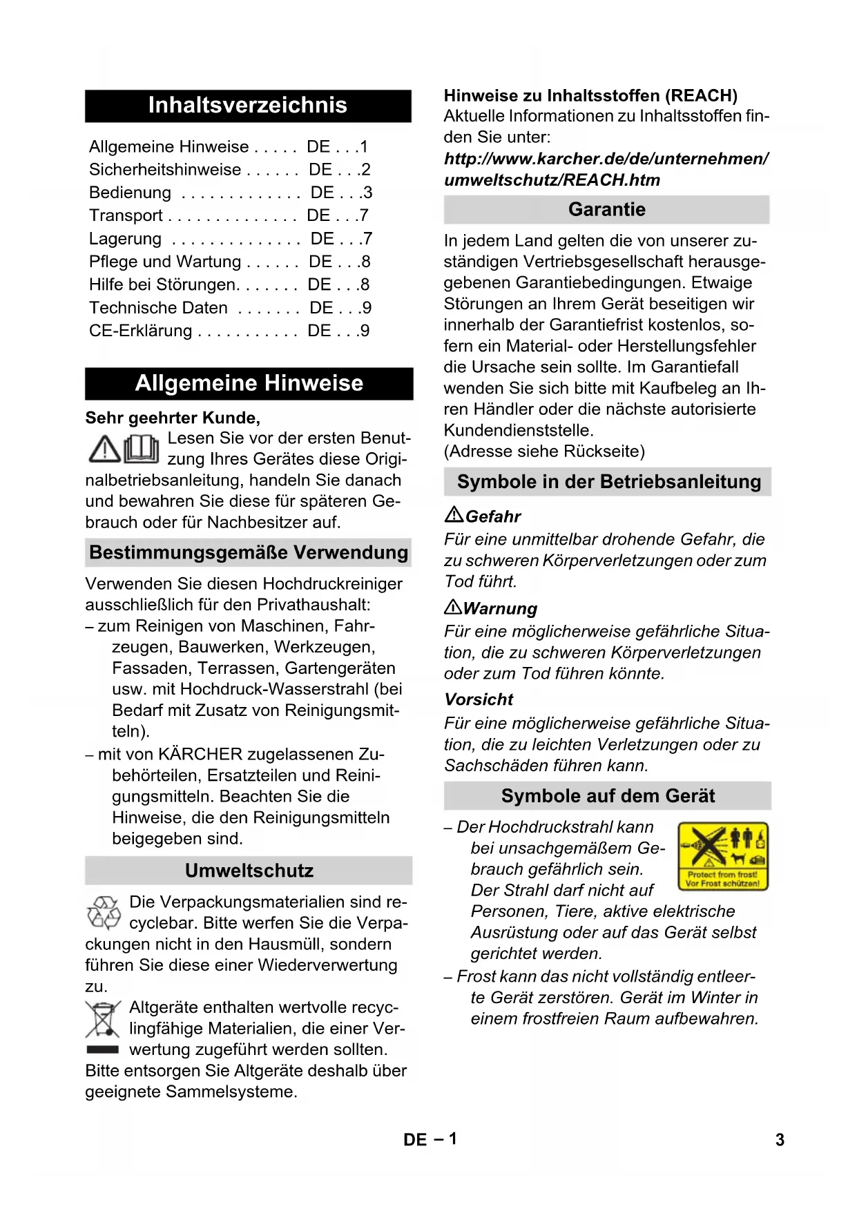 - DE Allgemeine Hinweise Bestimmungsgemäße Verwendung Umweltschutz Garantie Symbole in der Betriebsanleitung Symbole auf dem Gerät 3DE– 2 Gefahr Netzstecker und Steckdose niemals mit feuchten Händen anfassen. Das Gerät nicht in Betrieb setzen, wenn die Netzanschlussleitung oder wichtige Teile des Gerätes, z.B. Hochdruck- schlauch, Handspritzpistole oder Si- cherheitseinrichtungen beschädigt sind. Netzanschlussleitung mit Netzstecker vor jedem Betrieb auf Schäden prüfen. Beschädigte Netzanschlussleitung un- verzüglich durch autorisierten Kunden- dienst/Elektro-Fachkraft austauschen lassen. Hochdruckschlauch vor jedem Betrieb auf Schäden prüfen. Beschädigten Hochdruckschlauch unverzüglich aus- tauschen. Der Betrieb in explosionsgefährdeten Bereichen ist untersagt. Beim Einsatz des Gerätes in Gefahrbe- reichen (z.B. Tankstellen) sind die ent- sprechenden Sicherheitsvorschriften zu beachten. Hochdruckstrahlen können bei unsach- gemäßem Gebrauch gefährlich sein. Der Strahl darf nicht auf Personen, Tie- re, aktive elektrische Ausrüstung oder auf das Gerät selbst gerichtet werden. Den Hochdruckstrahl nicht auf andere oder sich selbst richten, um Kleidung oder Schuhwerk zu reinigen. Keine Gegenstände abspritzen, die ge- sundheitsgefährdende Stoffe (z.B. As- best) enthalten. Fahrzeugreifen/Reifenventile können durch den Hochdruckstrahl beschädigt werden und platzen. Erstes Anzeichen hierfür ist eine Verfärbung des Reifens. Beschädigte Fahrzeugreifen/Reifen- ventile sind lebensgefährlich. Mindes- tens 30 cm Strahlabstand bei der Reinigung einhalten! Explosionsgefahr! Keine brennbaren Flüssigkeiten ver- sprühen. Niemals lösungsmittelhaltige Flüssig- keiten oder unverdünnte Säuren und Lösungsmittel ansaugen! Dazu zählen z.B. Benzin, Farbverdünner oder Heiz- öl. Der Sprühnebel ist hochentzündlich, explosiv und giftig. Kein Aceton, unver- dünnte Säuren und Lösungsmittel ver- wenden, da sie die am Gerät verwendeten Materialien angreifen. 몇 Warnung Netzstecker und Kupplung einer Ver- längerungsleitung müssen wasserdicht sein und dürfen nicht im Wasser liegen. Ungeeignete Verlängerungsleitungen können gefährlich sein. Verwenden Sie im Freien nur dafür zugelassene und entsprechend gekennzeichnete Verlän- gerungsleitungen mit ausreichendem Leitungsquerschnitt: p. 9