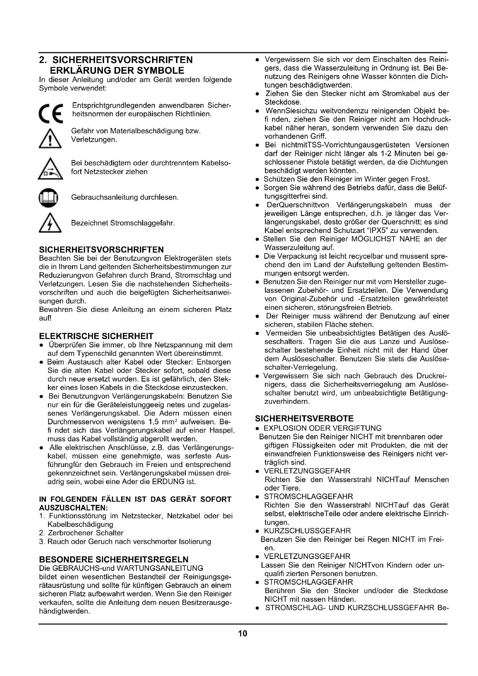 BESONDERE SICHERHEITSREGELN Die GEBRAUCHS-und WARTUNGSANLEITUNG bildet einen wesentlichen Bestandteil der Reinigungsge- rätausrüstung und sollte für künftigen Gebrauch an einem sicheren Platz aufbewahrt werden. Wenn Sie den Reiniger verkaufen, sollte die Anleitung dem neuen Besitzerausge- händigtwerden. Vergewissern Sie sich vor dem Einschalten des Reini- gers, dass die Wasserzuleitung in Ordnung ist. Bei Be- nutzung des Reinigers ohne Wasser könnten die Dich- tungen beschädigtwerden. Ziehen Sie den Stecker nicht am Stromkabel aus der Steckdose. WennSiesichzu weitvondemzu reinigenden Objekt be- ^ nden, ziehen Sie den Reiniger nicht am Hochdruck- kabel näher heran, sondern verwenden Sie dazu den vorhandenen Griff. Bei nichtmitTSS-Vorrichtungausgerüsteten Versionen darf der Reiniger nicht länger als 1-2 Minuten bei ge- schlossener Pistole betätigt werden, da die Dichtungen beschädigt werden könnten. Schützen Sie den Reiniger im Winter gegen Frost. Sorgen Sie während des Betriebs dafür, dass die Belüf- tungsgitterfrei sind. DerQuerschnittvon Verlängerungskabeln muss der jeweiligen Länge entsprechen, d.h. je länger das Ver- längerungskabel, desto größer der Querschnitt; es sind Kabel entsprechend Schutzart “IPX5” zu verwenden. Stellen Sie den Reiniger MÖGLICHST NAHE an der Wasserzuleitung auf. Die Verpackung ist leicht recycelbar und mussent spre- chend den im Land der Aufstellung geltenden Bestim- mungen entsorgt werden. Benutzen Sie den Reiniger nur mit vom Hersteller zuge- lassenen Zubehör- und Ersatzteilen. Die Verwendung von Original-Zubehör und -Ersatzteilen gewährleistet einen sicheren, störungsfreien Betrieb. Der Reiniger muss während der Benutzung auf einer sicheren, stabilen Fläche stehen. Vermeiden Sie unbeabsichtigtes Betätigen des Auslö- seschalters. Tragen Sie die aus Lanze und Auslöse- schalter bestehende Einheit nicht mit der Hand über dem Auslöseschalter. Benutzen Sie stets die Auslöse- schalter-Verriegelung. Vergewissern Sie sich nach Gebrauch des Druckrei- nigers, dass die Sicherheitsverriegelung am Auslöse- schalter benutzt wird, um unbeabsichtigte Betätigung- zuverhindern. SICHERHEITSVERBOTE