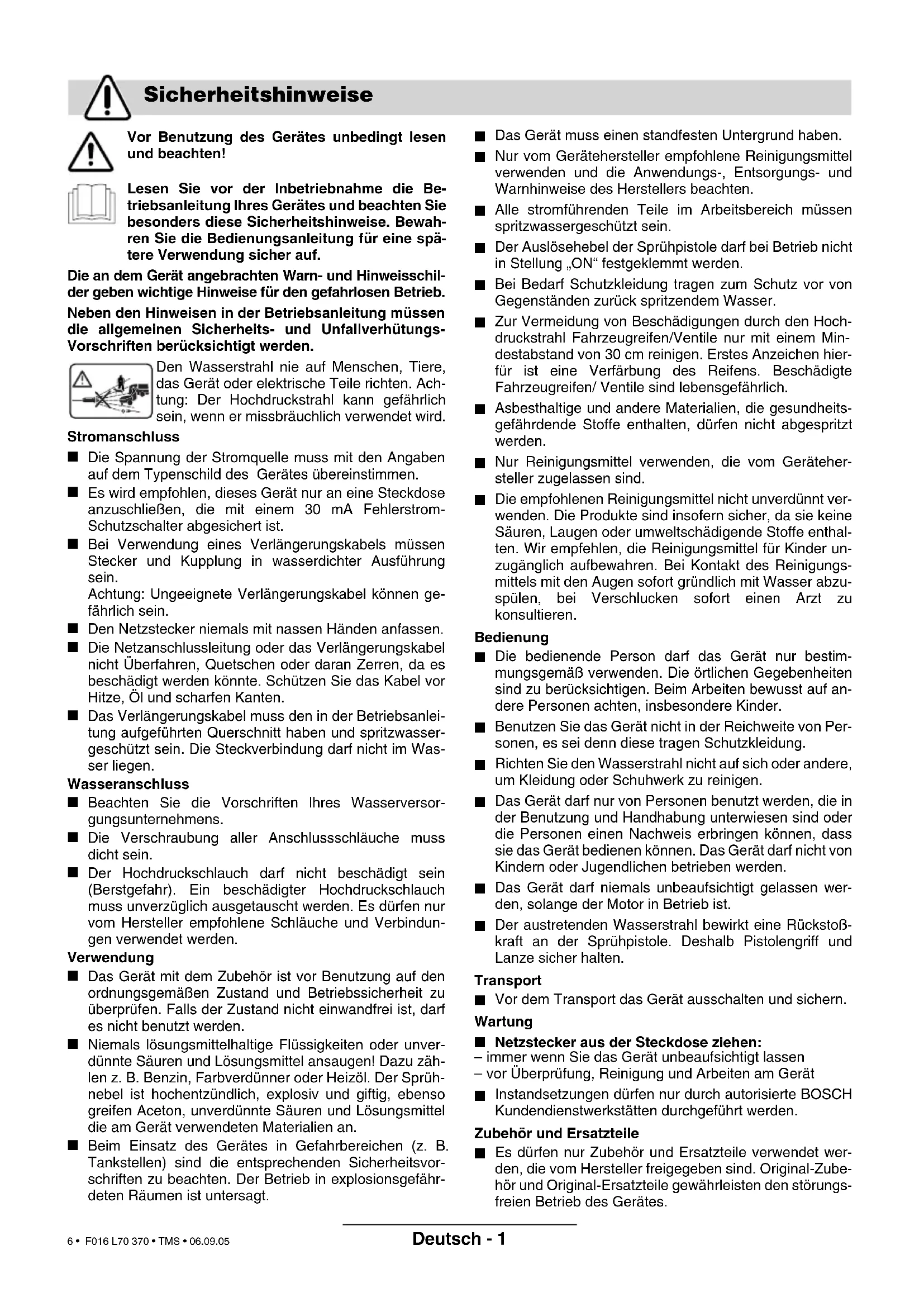 Vor Benutzung des Gerätes unbedingt lesen und beachten! Lesen Sie vor der Inbetriebnahme die Be- triebsanleitung lhres Gerätes und beachten Sie besonders diese Sicherheitshinweise. Bewah- ren Sie die Bedienungsanleitung für eine spä- tere Verwendung sicher auf. Die an dem Gerät angebrachten Warn- und Hinweisschil- der geben wichtige Hinweise für den gefahrlosen Betrieb. Neben den Hinweisen in der Betriebsanleitung müssen die allgemeinen Sicherheits- und Unfallverhütungs- Vorschriften berücksichtigt werden. Den Wasserstrahl nie auf Menschen, Tiere, das Gerät oder elektrische Teile richten. Ach- tung: Der Hochdruckstrahl kann gefährlich sein, wenn er missbräuchlich verwendet wird. Stromanschluss
