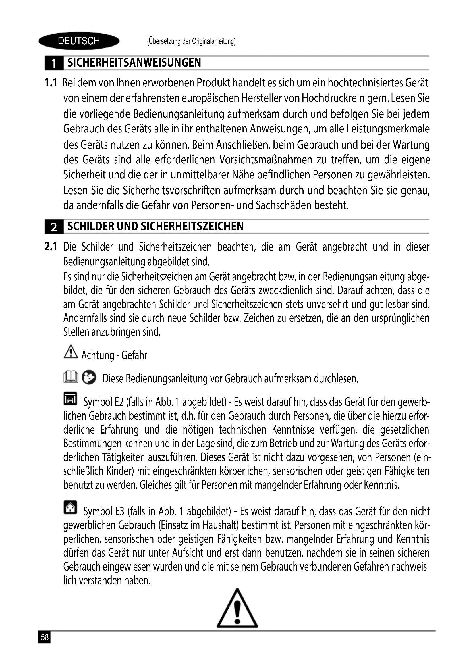 Die Schilder und Sicherheitszeichen beachten, die am Gerät angebracht und in dieser Bedienungsanleitung abgebildet sind. Es sind nur die Sicherheitszeichen am Gerät angebracht bzw. in der Bedienungsanleitung abge- bildet, die für den sicheren Gebrauch des Geräts zweckdienlich sind. Darauf achten, dass die am Gerät angebrachten Schilder und Sicherheitszeichen stets unversehrt und gut lesbar sind. Andernfalls sind sie durch neue Schilder bzw. Zeichen zu ersetzen, die an den ursprünglichen Stellen anzubringen sind. Achtung - Gefahr Diese Bedienungsanleitung vor Gebrauch aufmerksam durchlesen. Symbol E2 (falls in Abb. 1 abgebildet) - Es weist darauf hin, dass das Gerät für den gewerb- lichen Gebrauch bestimmt ist, d.h. für den Gebrauch durch Personen, die über die hierzu erfor- derliche Erfahrung und die nötigen technischen Kenntnisse verfügen, die gesetzlichen Bestimmungen kennen und in der Lage sind, die zum Betrieb und zur Wartung des Geräts erfor