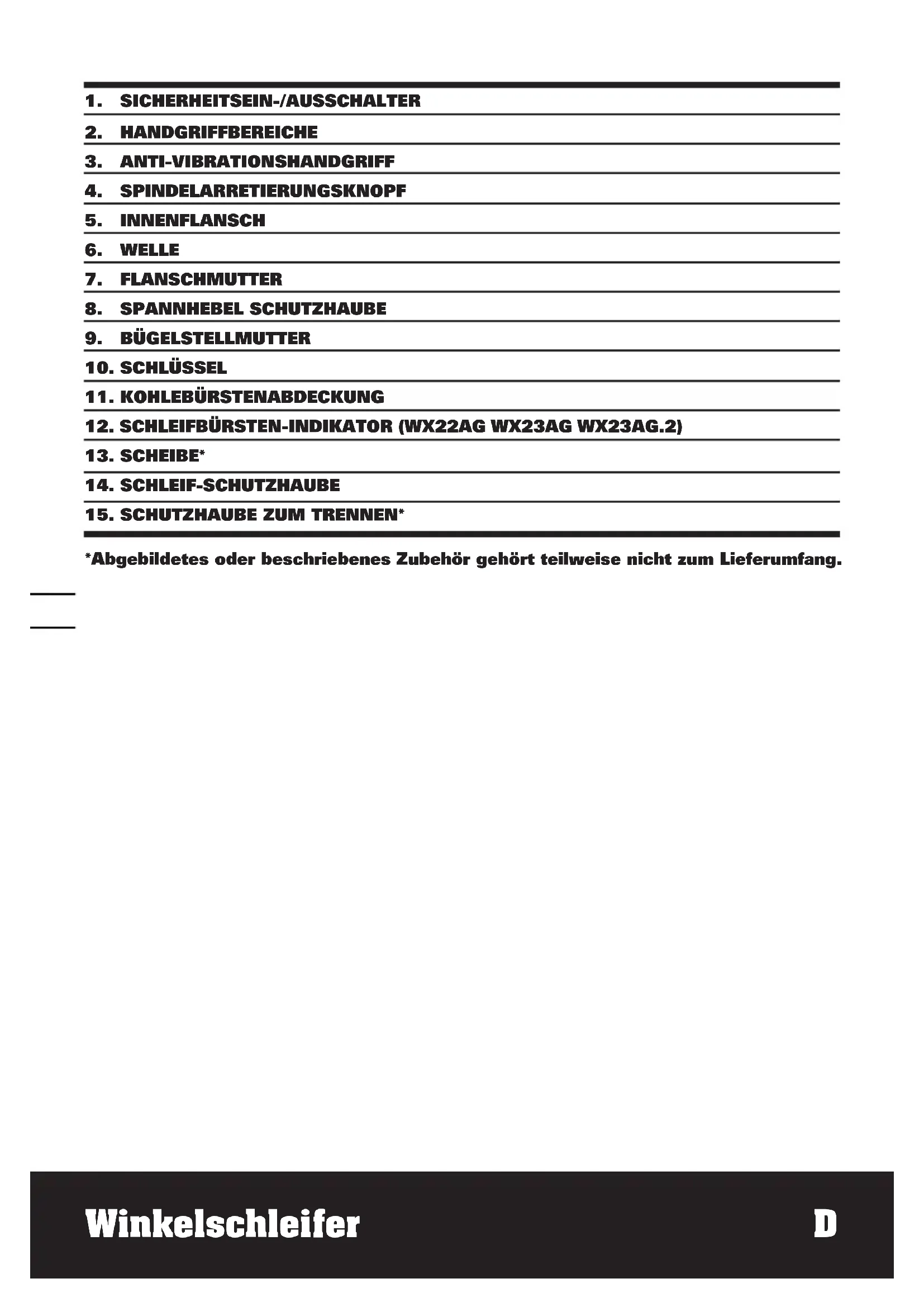 WARNUNG: Um genau zu sein, sollte ein Abschätzung des Belastungsgrades aller Arbeitsabschnitte während tatsächlicher Verwendung berücksichtigt werden, z.B. die Zeiten, wenn das Werkzeug ausgeschaltet ist, und wenn es sich im Leerlauf befindet und eigentlich nicht eingesetzt wird. Auf diese Weise kann der Belastungsgrad während der gesamten Arbeitszeit wesentlich gemindert werden. Minimieren Sie Ihr Risiko, dem Sie bei Vibrationen ausgesetzt sind. Pflegen Sie dieses Werkzeug diesen Anweisungen entsprechend und achten Sie auf eine gute Einfettung (wo erforderlich). Bei regelmäßiger Verwendung dieses Werkzeugs sollten Sie in Antivibrationszubehör investieren. Vermeiden Sie den Einsatz von Werkzeugen bei Temperaturen von 10ºC oder darunter. Machen Sie einen Arbeitsplan, um die Verwendung von hochvibrierenden Werkzeugen auf mehrere Tage zu verteilen. ZUBEHÖRTEILE Schlüssel 1 Anti-vibrationshandgriff 1 Metall-Trennscheiben (WX22AG WX23AG WX23AG.1) 1 Wir empfehlen Ihnen, sämtliche Zubehörteile beim selben Fachhändler zu beziehen, bei dem Sie auch Ihr Elektrowerkzeug gekauft haben. Verwenden Sie nur hochwertige Zubehörteile von namhaften Herstellern. Weitere Informationen finden Sie auf der Verpackung der Zubehörteile. Auch Ihr Fachhändler berät Sie gerne.1918 Winkelschleifer D SICHERHEITSHINWEISE FÜR ALLE ANWENDUNGEN: Gemeinsame Warnhinweise zum Schleifen, Trennschleifen.: a) Dieses Elektrowerkzeug ist zu verwenden als Schleifer, Trennschleifmaschine. Beachten Sie alle Warnhinweise, Anweisungen, Darstellungen und Daten, die Sie mit dem Gerät erhalten. Wenn Sie die folgenden Anweisungen nicht beachten, kann es zu elektrischem Schlag, Feuer und/ oder schweren Verletzungen kommen. b) Dieses Elektrowerkzeug ist nicht geeignet zum Sandpapierschleifen, Arbeiten mit Drahtbürsten, Polieren. Verwendungen, für die das Elektrowerkzeug nicht vorgesehen ist, können Gefährdungen und Verletzungen verursachen. c) Verwenden Sie kein Zubehör, das vom Hersteller nicht speziell für dieses Elektrowerkzeug vorgesehen und empfohlen wurde. Nur weil Sie das Zubehör an Ihrem Elektrowerkzeug befestigen können, garantiert das keine sichere Verwendung. d) Die zulässige Drehzahl des Einsatzwerkzeugs muss mindestens so hoch sein wie die auf dem Elektrowerkzeug angegebene Höchstdrehzahl. Zubehör, das sich schneller als zulässig dreht, kann zerstört werden. e) Außendurchmesser und Dicke des Einsatzwerkzeugs müssen den Maßangaben Ihres Elektrowerkzeugs entsprechen. Falsch bemessene Einsatzwerkzeuge können nicht ausreichend abgeschirmt oder kontrolliert werden. f) Gewindemontage von Zubehör muss mit dem Schleifspindelgewinde übereinstimmen. Bei mittels Flanschs montiertem Zubehör muss das Loch des Zubehörs mit dem Durchmesser des Flanschs übereinstimmen. Einsatzwerkzeuge, die nicht genau auf die Schleifspindel des Elektrowerkzeugs passen, drehen sich ungleichmäßig, vibrieren sehr stark und können zum Verlust der Kontrolle führen. g) Verwenden Sie keine beschädigten Einsatzwerkzeuge. Kontrollieren Sie vor jeder Verwendung Einsatzwerkzeuge wie Schleifscheiben auf Absplitterungen und Risse, Schleifteller auf Risse, Verschleiß oder starke Abnutzung, Drahtbürste für lose oder brüchige Drähte. Wenn das Elektrowerkzeug oder das Einsatzwerkzeug herunterfällt, überprüfen Sie, ob es beschädigt ist, oder verwenden Sie ein unbeschädigtes Einsatzwerkzeug. Wenn Sie das Einsatzwerkzeug kontrolliert und eingesetzt haben, halten Sie und in der Nähe befindliche Personen sich außerhalb der Ebene des rotierenden Einsatzwerkzeugs und lassen Sie das Gerät eine Minute lang mit Höchstdrehzahl laufen. Beschädigte Einsatzwerkzeuge brechen meist in dieser Testzeit. h) Tragen Sie persönliche Schutzausrüstung. Verwenden Sie je nach Anwendung Vollgesichtsschutz, Augenschutz oder Schutzbrille. Soweit angemessen, tragen Sie Staubmaske, Gehörschutz, Schutzhandschuhe oder Spezialschürze, die kleine Schleif- und Materialpartikel von Ihnen fernhält. Die Augen sollen vor herumfliegenden Fremdkörpern geschützt werden, die bei verschiedenen Anwendungen entstehen. Staub- oder Atemschutzmaske müssen den bei der Anwendung entstehenden Staub filtern. Wenn Sie lange lautem Lärm ausgesetzt sind, können Sie einen Hörverlust erleiden.
