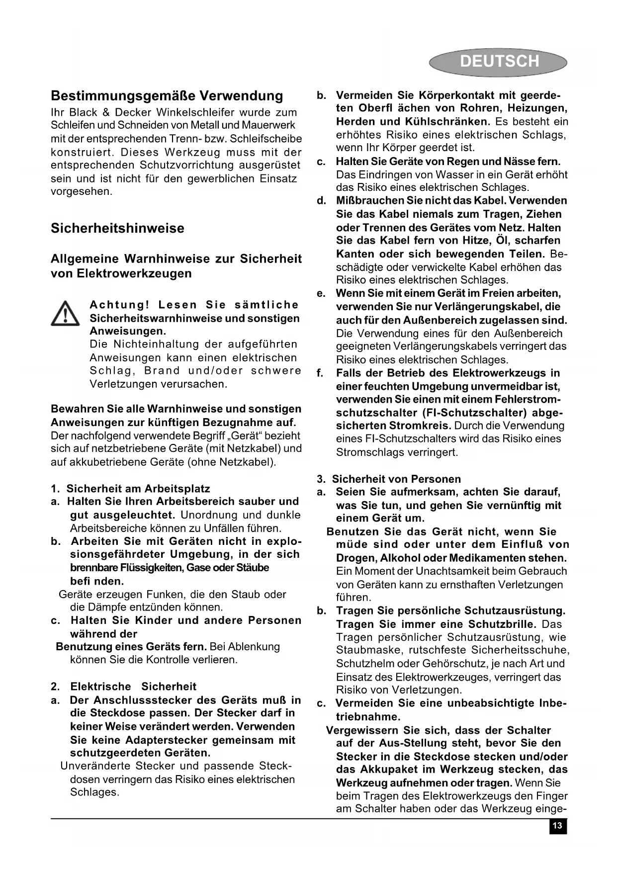 Garantie Black & Decker vertraut auf die Qualität der eigenen Geräte und bietet dem Käufer eine außergewöhnliche Garantie. Diese Garantiezusage versteht sich unbeschadet der gesetzlichen Gewährleistungsansprüche und schränkt diese keinesfalls ein. Sie gilt in sämtlichen Mitgliedsstaaten der Europäischen Union und der Europäischen Freihandelszone EFTA. Tritt innerhalb von 24 Monaten ab Kaufdatum an einem Gerät von Black & Decker ein auf Material- oder Verarbeitungsfehler zurückzuführender Mangel auf, garantiert Black & Decker den Austausch defekter Teile, die Reparatur von Geräten mit üblichem Verschleiß bzw. Den Austausch eines mangelhaften Geräts, ohne dass dem Kunden dabei mehr als unvermeidlich Unannehmlichkeiten entstehen, allerdings vorbehaltlich folgender Ausnahmen: wenn das Gerät gewerblich, berufl ich oder im Verleihgeschäft benutzt wurde. wenn das Gerät mißbräuchlich verwendet oder mit mangelnder Sorgfalt behandelt wurde. wenn das Gerät durch irgendwelche Fremdeinwirkung beschädigt wurde. wenn ein unbefugter Reparaturversuch durch anderes Personal als das einer Vertragswerkstatt oder des Black & Decker-Kundendienstes unternommen wurde. Zur Inanspruchnahme dieser Garantie ist dem Verkäufer bzw. der Vertragswerkstatt ein Kaufnachweis vorzulegen. Der Kaufnachweis muß Kaufdatum und Gerätetyp bescheinigen. Die Adresse des zuständigen Büros von Black & Decker steht in dieser Anleitung, darüber läßt sich die nächstgelegene Vertragswerkstatt ermitteln. Außerdem ist eine Liste der Vertragswerkstätten und aller Kundendienststellen von Black & Decker sowie der zuständigen Ansprechpartner im Internet zu fi nden unter: www.2helpU.com22 FRANÇAIS Utilisation prévue Votre meuleuse d’angle Black & Decker a été conçue pour meuler et découper le métal et le béton avec des disques de tronçonnage ou de meulage spécifi ques. Équipé du carter de protection approprié, cet outil est réservé à un usage domestique. Instructions de sécurité Consignes de sécurité générales pour les outils électriques Attention! Prenez connaissance de tous les avertissements de sécurité et de toutes les instructions. Le non-respect de cette consigne peut entraîner une électrocution, un incendie et/ou de gravis blessures. Conservez tous les avertissements et instructions pour référence future. La notion d’« outil électroportatif » mentionnée par la suite se rapporte à des outils électriques raccordés au secteur (avec câble de raccordement) ou fonctionnant sur piles (sans fi l).
