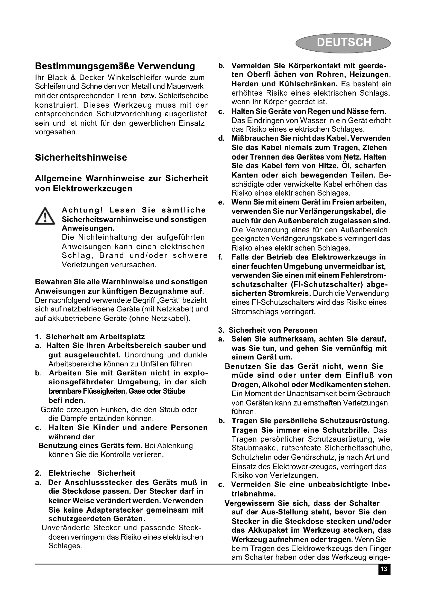 Garantie Black & Decker vertraut auf die Qualität der eigenen Geräte und bietet dem Käufer eine außergewöhnliche Garantie. Diese Garantiezusage versteht sich unbeschadet der gesetzlichen Gewährleistungsansprüche und schränkt diese keinesfalls ein. Sie gilt in sämtlichen Mitgliedsstaaten der Europäischen Union und der Europäischen Freihandelszone EFTA. Tritt innerhalb von 24 Monaten ab Kaufdatum an einem Gerät von Black & Decker ein auf Material- oder Verarbeitungsfehler zurückzuführender Mangel auf, garantiert Black & Decker den Austausch defekter Teile, die Reparatur von Geräten mit üblichem Verschleiß bzw. Den Austausch eines mangelhaften Geräts, ohne dass dem Kunden dabei mehr als unvermeidlich Unannehmlichkeiten entstehen, allerdings vorbehaltlich folgender Ausnahmen: wenn das Gerät gewerblich, berufl ich oder im Verleihgeschäft benutzt wurde. wenn das Gerät mißbräuchlich verwendet oder mit mangelnder Sorgfalt behandelt wurde. wenn das Gerät durch irgendwelche Fremdeinwirkung beschädigt wurde. wenn ein unbefugter Reparaturversuch durch anderes Personal als das einer Vertragswerkstatt oder des Black & Decker-Kundendienstes unternommen wurde. Zur Inanspruchnahme dieser Garantie ist dem Verkäufer bzw. der Vertragswerkstatt ein Kaufnachweis vorzulegen. Der Kaufnachweis muß Kaufdatum und Gerätetyp bescheinigen. Die Adresse des zuständigen Büros von Black & Decker steht in dieser Anleitung, darüber läßt sich die nächstgelegene Vertragswerkstatt ermitteln. Außerdem ist eine Liste der Vertragswerkstätten und aller Kundendienststellen von Black & Decker sowie der zuständigen Ansprechpartner im Internet zu fi nden unter: www.2helpU.com22 FRANÇAIS Utilisation prévue Votre meuleuse d’angle Black & Decker a été conçue pour meuler et découper le métal et le béton avec des disques de tronçonnage ou de meulage spécifi ques. Équipé du carter de protection approprié, cet outil est réservé à un usage domestique. Instructions de sécurité Consignes de sécurité générales pour les outils électriques Attention! Prenez connaissance de tous les avertissements de sécurité et de toutes les instructions. Le non-respect de cette consigne peut entraîner une électrocution, un incendie et/ou de gravis blessures. Conservez tous les avertissements et instructions pour référence future. La notion d’« outil électroportatif » mentionnée par la suite se rapporte à des outils électriques raccordés au secteur (avec câble de raccordement) ou fonctionnant sur piles (sans fi l).