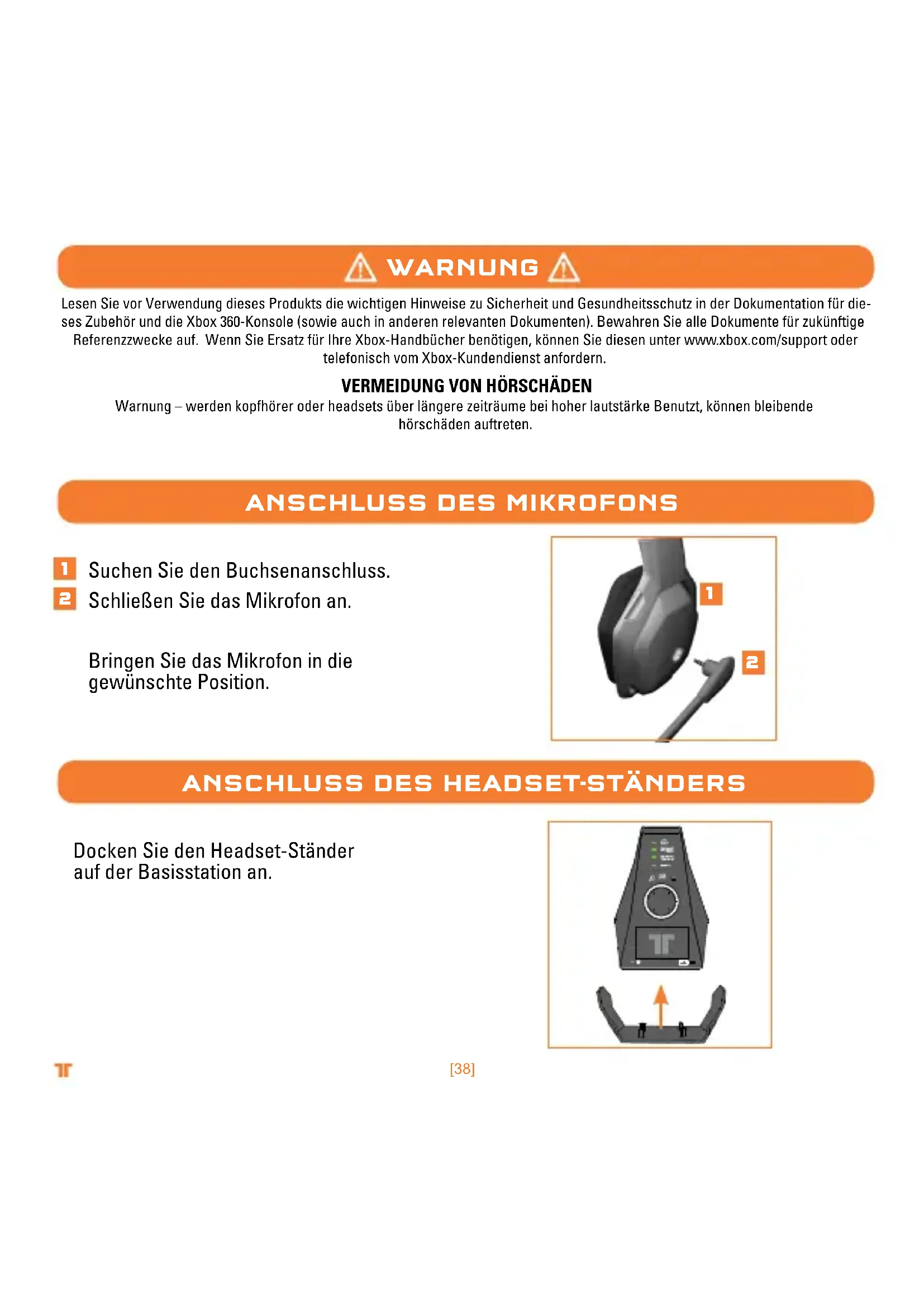 Docken Sie den Headset-Ständer auf der Basisstation an. Warnung Lesen Sie vor Verwendung dieses Produkts die wichtigen Hinweise zu Sicherheit und Gesundheitsschutz in der Dokumentation für die- ses Zubehör und die Xbox 360-Konsole (sowie auch in anderen relevanten Dokumenten). Bewahren Sie alle Dokumente für zukünftige Referenzzwecke auf. Wenn Sie Ersatz für Ihre Xbox-Handbücher benötigen, können Sie diesen unter www.xbox.com/support oder telefonisch vom Xbox-Kundendienst anfordern.