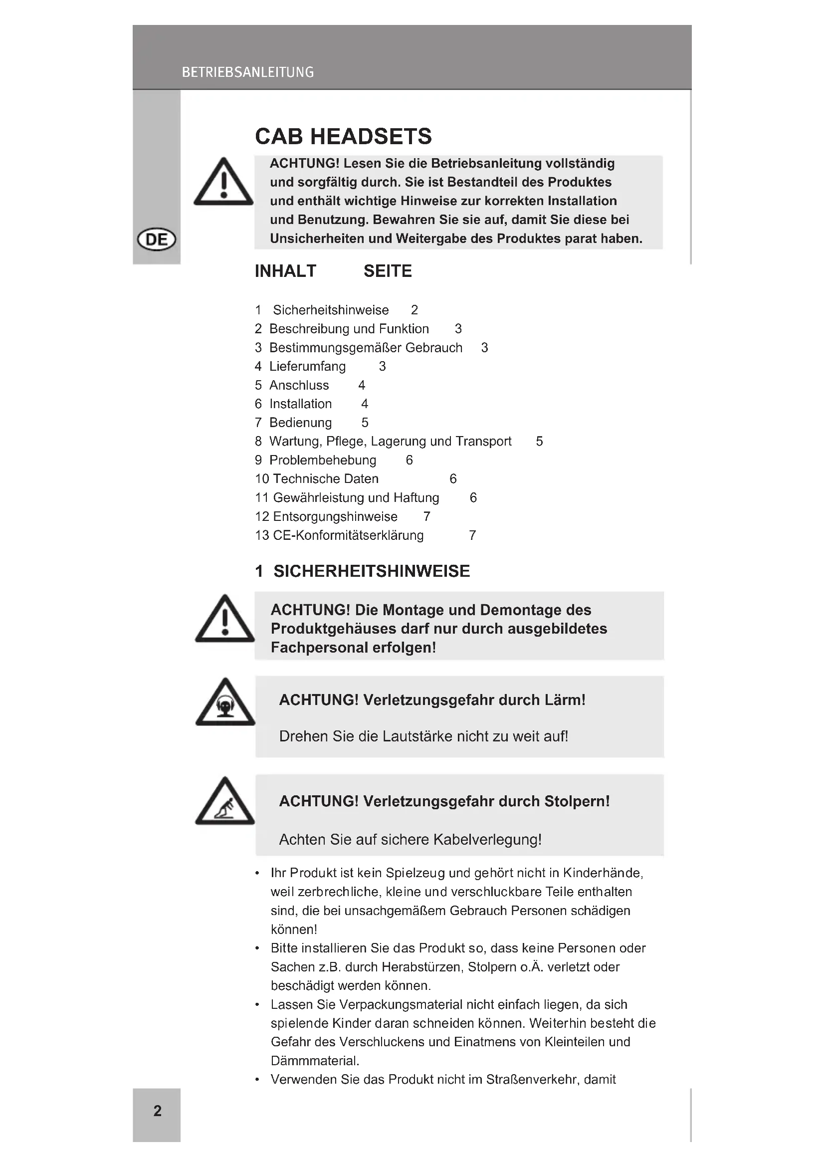 El δηγίεςΧρηςης Fi MAnuAAlinEn pt MAnuAl cs MAnuál RUРуководствоользователя ZH 手册 KO 매뉴얼2 BetrieBsanleitung ACHTUNG! Lesen Sie die Betriebsanleitung vollständig und sorgfältig durch. Sie ist Bestandteil des Produktes und enthält wichtige Hinweise zur korrekten Installation und Benutzung. Bewahren Sie sie auf, damit Sie diese bei Unsicherheiten und Weitergabe des Produktes parat haben. CAB HEADSETS INHALT SEITE 1 Sicherheitshinweise 2 2 Beschreibung und Funktion 3 3 Bestimmungsgemäßer Gebrauch 3 4 Lieferumfang 3 5 Anschluss 4 6 Installation 4 7 Bedienung 5 8Wartung,Pege,LagerungundTransport 5 9 Problembehebung 6 10TechnischeDaten 6 11 Gewährleistung und Haftung 6 12 Entsorgungshinweise 7 13 CE-Konformitätserklärung 7 1 SICHERHEITSHINWEISE ACHTUNG! Die Montage und Demontage des Produktgehäuses darf nur durch ausgebildetes Fachpersonal erfolgen!