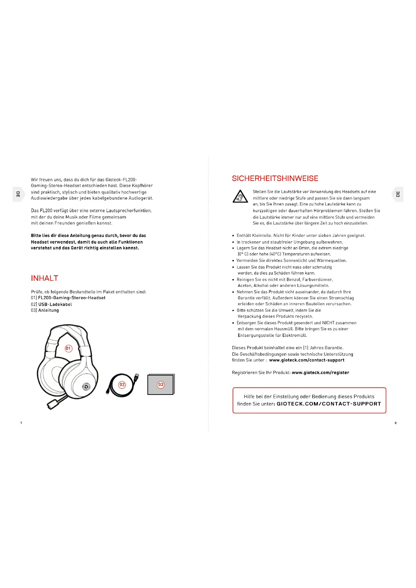 Wir freuen uns, dass du dich für das Gioteck-FL200- Gaming-Stereo-Headset entschieden hast. Diese Kopfhörer sind praktisch, stylisch und bieten qualitativ hochwertige Audiowiedergabe über jedes kabelgebundene Audiogerät. Das FL200 verfügt über eine externe Lautsprecherfunktion, mit der du deine Musik oder Filme gemeinsam mit deinen Freunden genießen kannst. Bitte lies dir diese Anleitung genau durch, bevor du das Headset verwendest, damit du auch alle Funktionen verstehst und das Gerät richtig einstellen kannst. INHALT Prüfe, ob folgende Bestandteile im Paket enthalten sind: 01] FL200-Gaming-Stereo-Headset 02] USB-Ladekabel 03] Anleitung Stellen Sie die Lautstärke vor Verwendung des Headsets auf eine mittlere oder niedrige Stufe und passen Sie sie dann langsam an, bis Sie Ihnen zusagt. Eine zu hohe Lautstärke kann zu kurzzeitigen oder dauerhaften Hörproblemen führen. Stellen Sie die Lautstärke immer nur auf eine mittlere Stufe und vermeiden Sie es, die Lautstärke über längere Zeit zu hoch einzustellen.