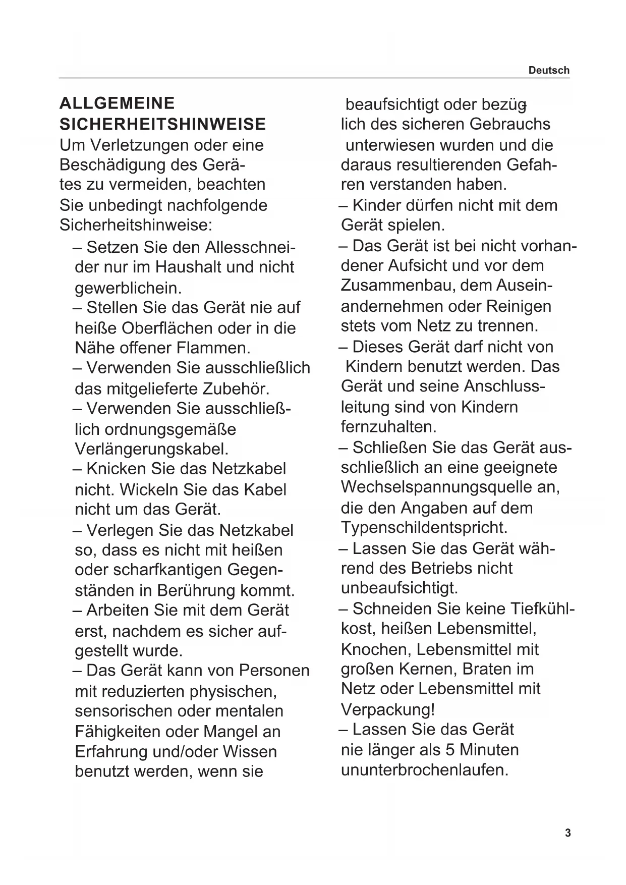 Kullanım kılavuzu .................................923 ALLGEMEINE SICHERHEITSHINWEISE Um Verletzungen oder eine Beschädigung des Gerä- tes zu vermeiden, beachten Sie unbedingt nachfolgende Sicherheitshinweise: – Setzen Sie den Allesschnei- der nur im Haushalt und nicht gewerblich ein. – Stellen Sie das Gerät nie auf heiße Oberächen oder in die Nähe oener Flammen. – Verwenden Sie ausschließlich das mitgelieferte Zubehör. – Verwenden Sie ausschließ- lich ordnungsgemäße Verlängerungskabel. – Knicken Sie das Netzkabel nicht. Wickeln Sie das Kabel nicht um das Gerät. – Verlegen Sie das Netzkabel so, dass es nicht mit heißen oder scharfkantigen Gegen- ständen in Berührung kommt. – Arbeiten Sie mit dem Gerät erst, nachdem es sicher auf- gestellt wurde. – Das Gerät kann von Personen mit reduzierten physischen, sensorischen oder mentalen Fähigkeiten oder Mangel an Erfahrung und/oder Wissen benutzt werden, wenn sie beaufsichtigt oder bezüg