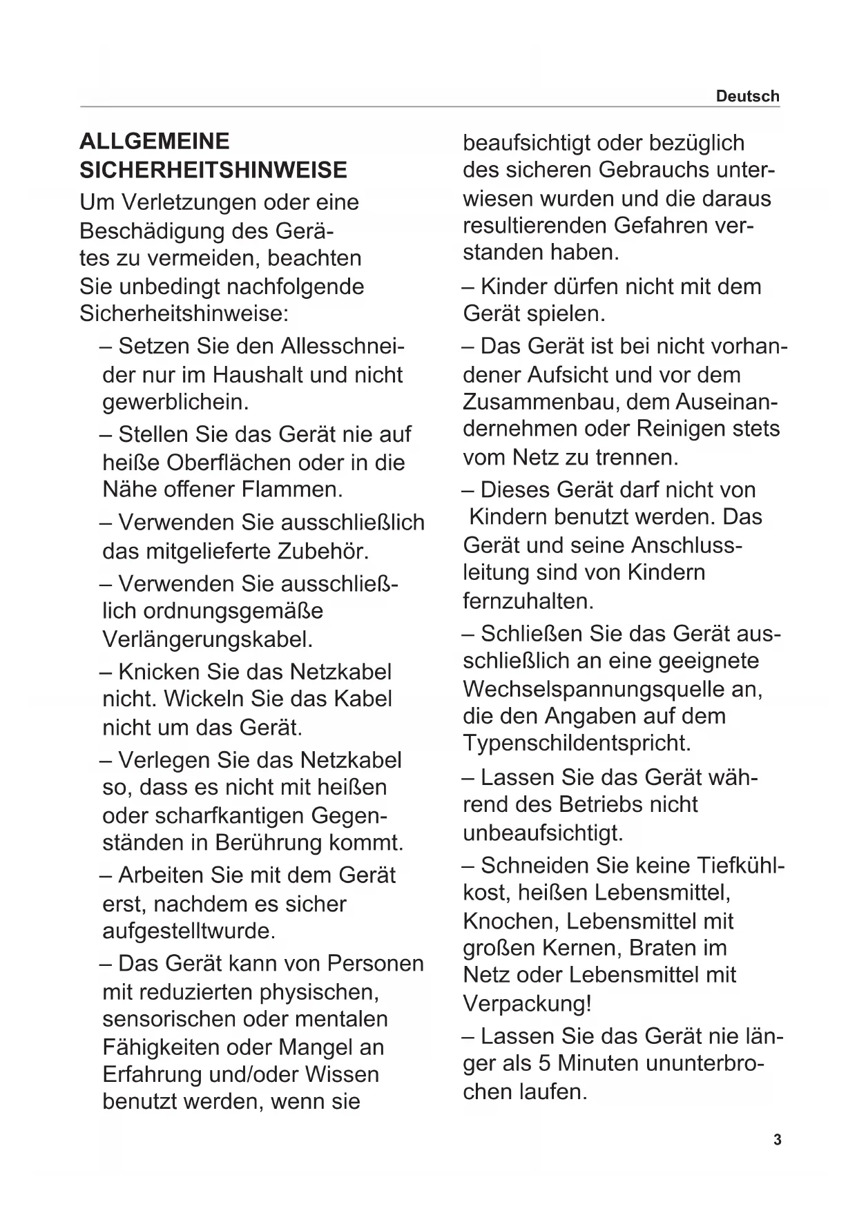 Kullanım kılavuzu ................................ 923 Deutsch ALLGEMEINE SICHERHEITSHINWEISE Um Verletzungen oder eine Beschädigung des Gerä- tes zu vermeiden, beachten Sie unbedingt nachfolgende Sicherheitshinweise: – Setzen Sie den Allesschnei- der nur im Haushalt und nicht gewerblich ein. – Stellen Sie das Gerät nie auf heiße Oberächen oder in die Nähe oener Flammen. – Verwenden Sie ausschließlich das mitgelieferte Zubehör. – Verwenden Sie ausschließ- lich ordnungsgemäße Verlängerungskabel. – Knicken Sie das Netzkabel nicht. Wickeln Sie das Kabel nicht um das Gerät. – Verlegen Sie das Netzkabel so, dass es nicht mit heißen oder scharfkantigen Gegen- ständen in Berührung kommt. – Arbeiten Sie mit dem Gerät erst, nachdem es sicher aufgestellt wurde. – Das Gerät kann von Personen mit reduzierten physischen, sensorischen oder mentalen Fähigkeiten oder Mangel an Erfahrung und/oder Wissen benutzt werden, wenn sie beaufsichtigt oder bezüglich des sicheren Gebrauchs unter