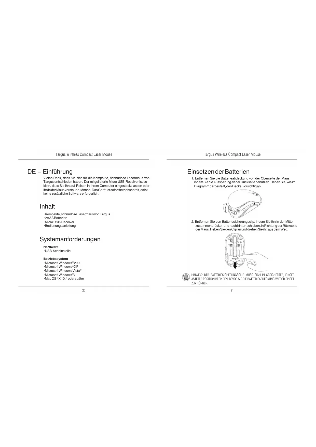 DE – Einführung Vielen Dank, dass Sie sich für die Kompakte, schnurlose Lasermaus von Targus entschieden haben. Der mitgelieferte Micro USB-Receiver ist so klein, dass Sie ihn auf Reisen in Ihrem Computer eingesteckt lassen oder ihn in der Maus verstauen können. Das Gerät ist sofort betriebsbereit, es ist keine zusätzliche Software erforderlich. Systemanforderungen Hardware