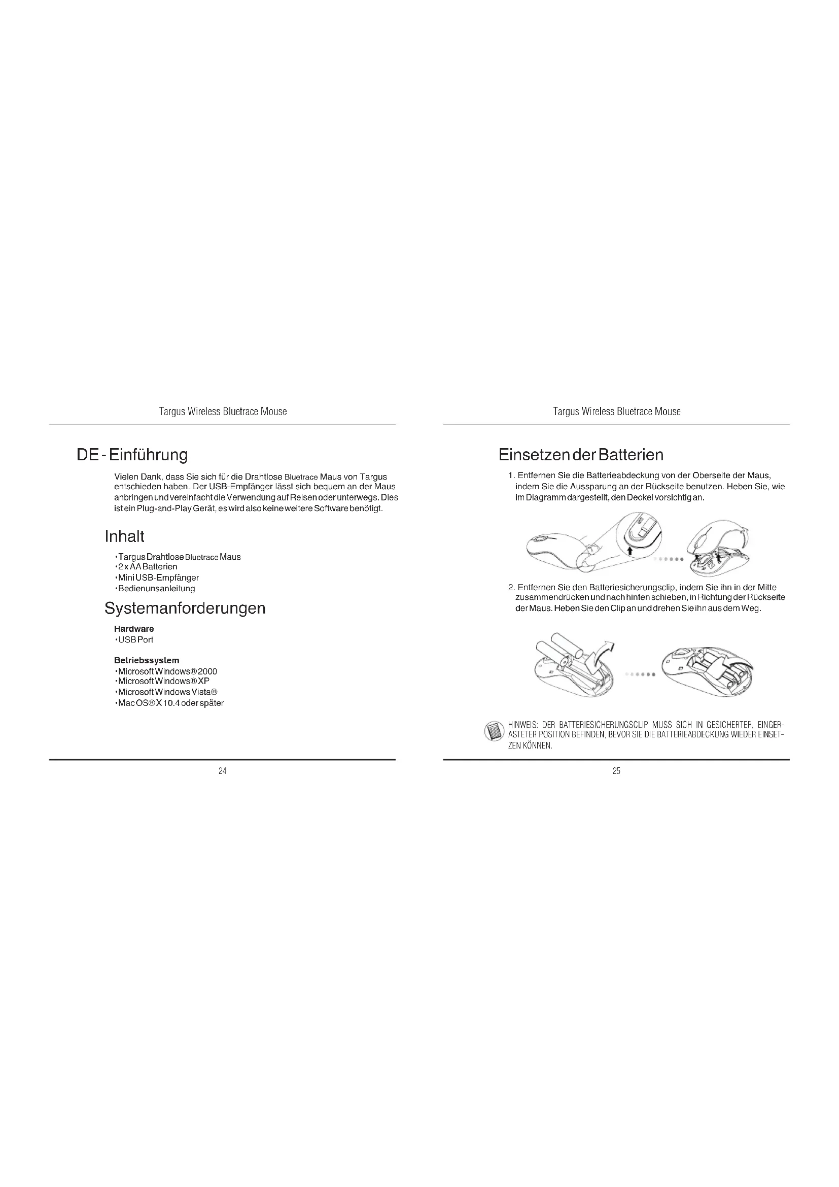 DE - Einführung Vielen Dank, dass Sie sich für die Drahtlose Bluetrace Maus von Targus entschieden haben. Der USB-Empfänger lässt sich bequem an der Maus anbringen und vereinfacht die Verwendung auf Reisen oder unterwegs. Dies ist ein Plug-and-Play Gerät, es wird also keine weitere Software benötigt. Systemanforderungen Hardware