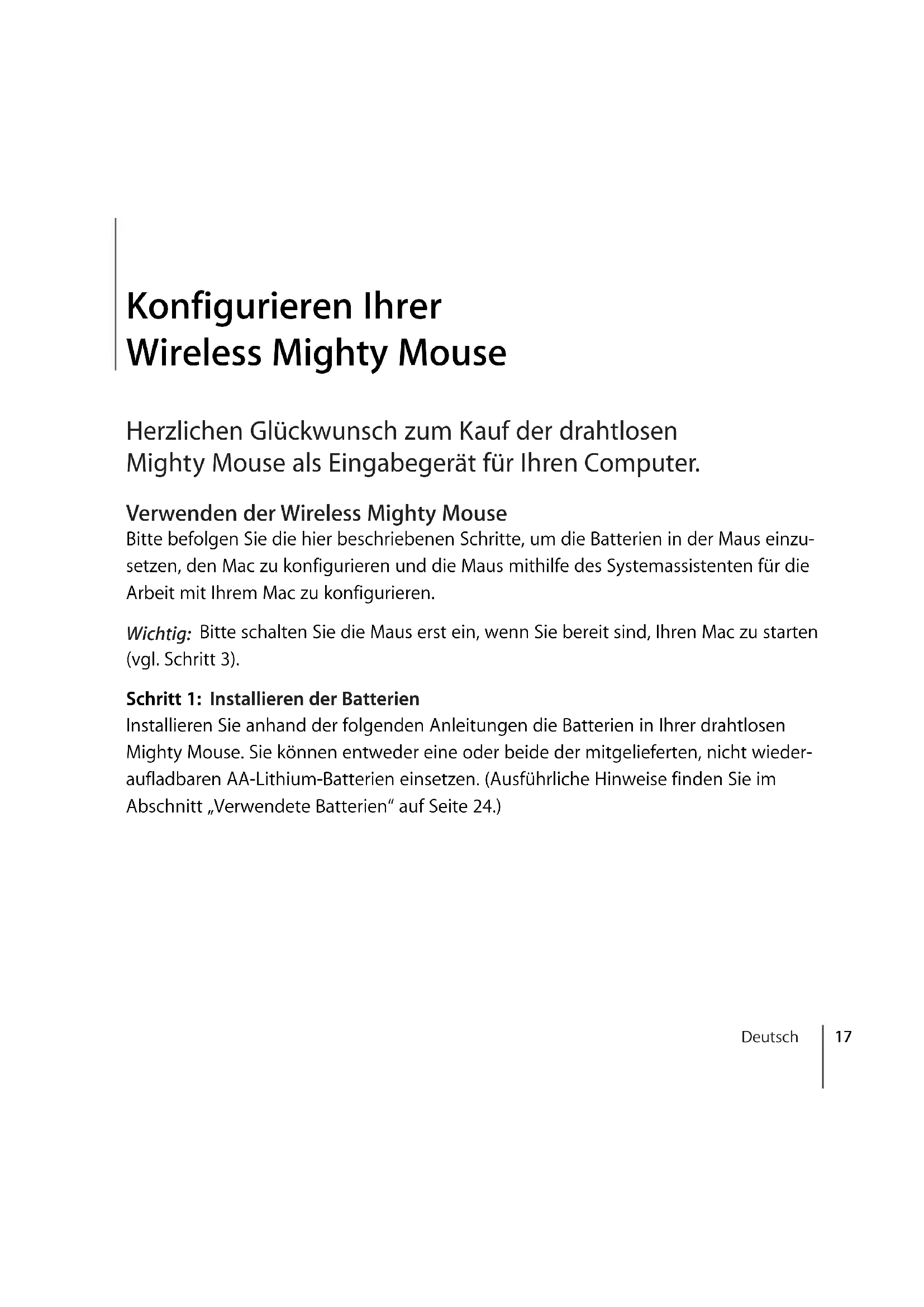 VerwendenderWirelessMightyMouse Bitte befolgen Sie die hier beschriebenen Schritte, um die Batterien in der Maus einzu- setzen, den Mac zu konfigurieren und die Maus mithilfe des Systemassistenten für die Arbeit mit Ihrem Mac zu konfigurieren.