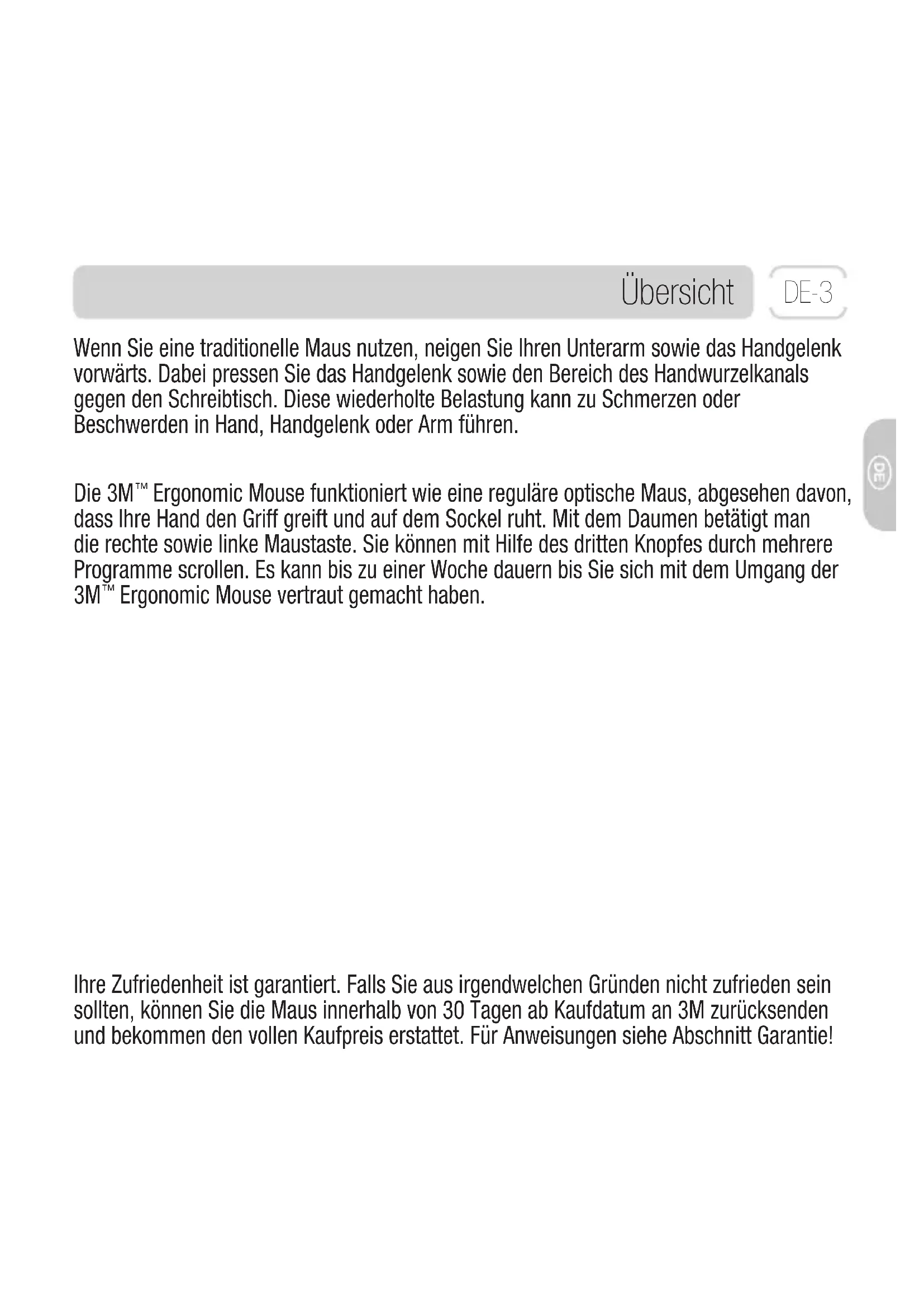Ergonomic Mouse vertraut gemacht haben. Ihre Zufriedenheit ist garantiert. Falls Sie aus irgendwelchen Gründen nicht zufrieden sein sollten, können Sie die Maus innerhalb von 30 Tagen ab Kaufdatum an 3M zurücksenden und bekommen den vollen Kaufpreis erstattet. Für Anweisungen siehe Abschnitt Garantie! DE - 3Spezifikationen DRITTE MAUSTASTE Erlaubt Srcollen in verschiedenen Anwendungen LINKE MAUSTASTE