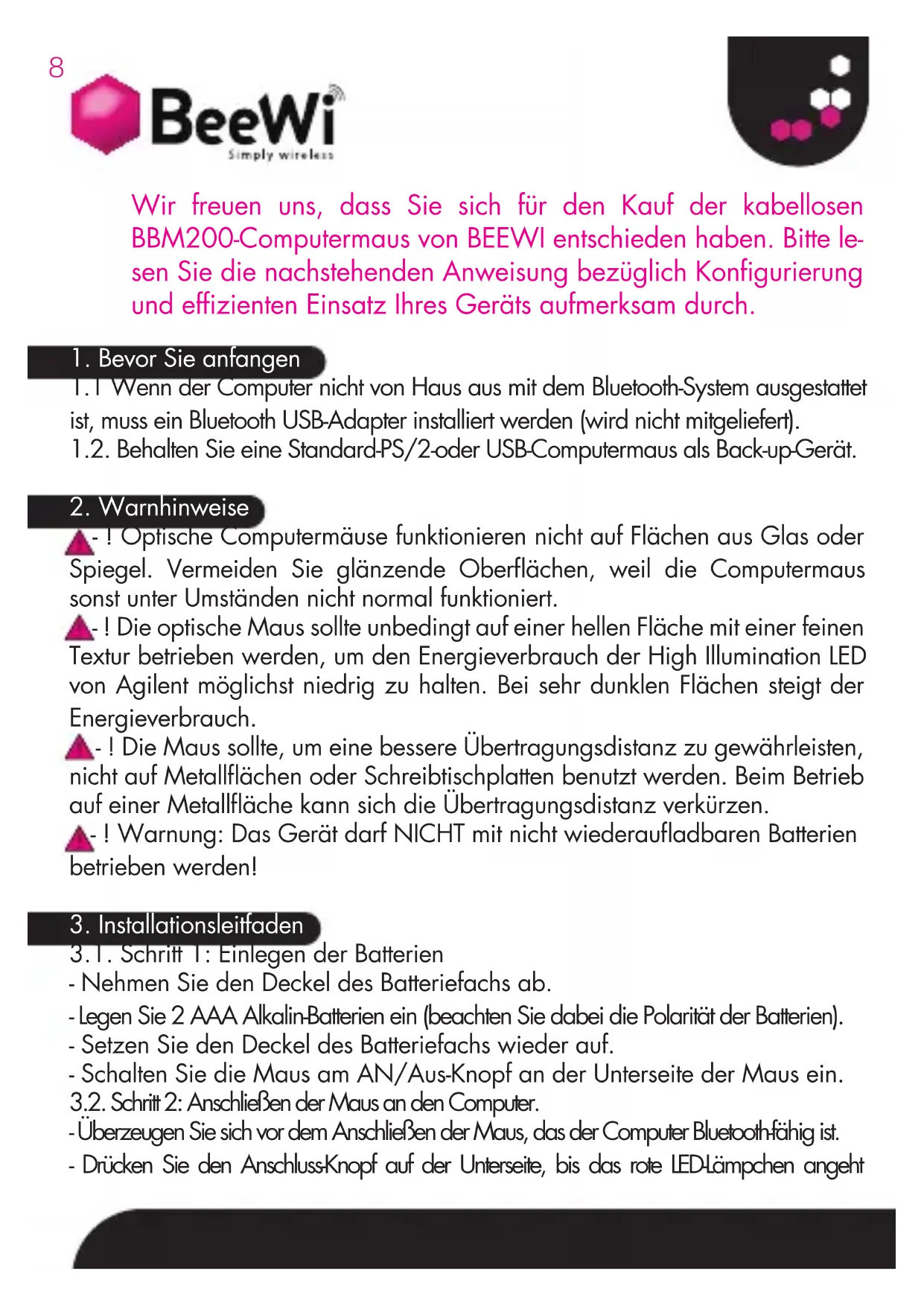 3.1. Schritt 1: Einlegen der Batterien - Nehmen Sie den Deckel des Batteriefachs ab. - Legen Sie 2 AAA Alkalin-Batterien ein (beachten Sie dabei die Polarität der Batterien). - Setzen Sie den Deckel des Batteriefachs wieder auf. - Schalten Sie die Maus am AN/Aus-Knopf an der Unterseite der Maus ein. 3.2. Schritt 2: Anschließen der Maus an den Computer. - Überzeugen Sie sich vor dem Anschließen der Maus, das der Computer Bluetooth-fähig ist. - Drücken Sie den Anschluss-Knopf auf der Unterseite, bis das rote LED-Lämpchen angeht Wir freuen uns, dass Sie sich für den Kauf der kabellosen BBM200-Computermaus von BEEWI entschieden haben. Bitte le- sen Sie die nachstehenden Anweisung bezüglich Konfigurierung und effizienten Einsatz Ihres Geräts aufmerksam durch.9 (abwechselnd helles, dezentes Licht und Aus, bereit zum Pairing) - Pairing: Starten Sie die Bluetooth Utility Software auf dem Computer und befolgen Sie die Anweisungen in Bezug auf Aufspüren und Pairing mit anderen Geräten. - Bitte beachten: die Maus erfordert keine Eingabe eines Pairing-Codes; wenn die Bluetooth Utility Software einen Code verlangt, muss lediglich der Pairing- Code im Utility-Fenster deaktiviert werden.