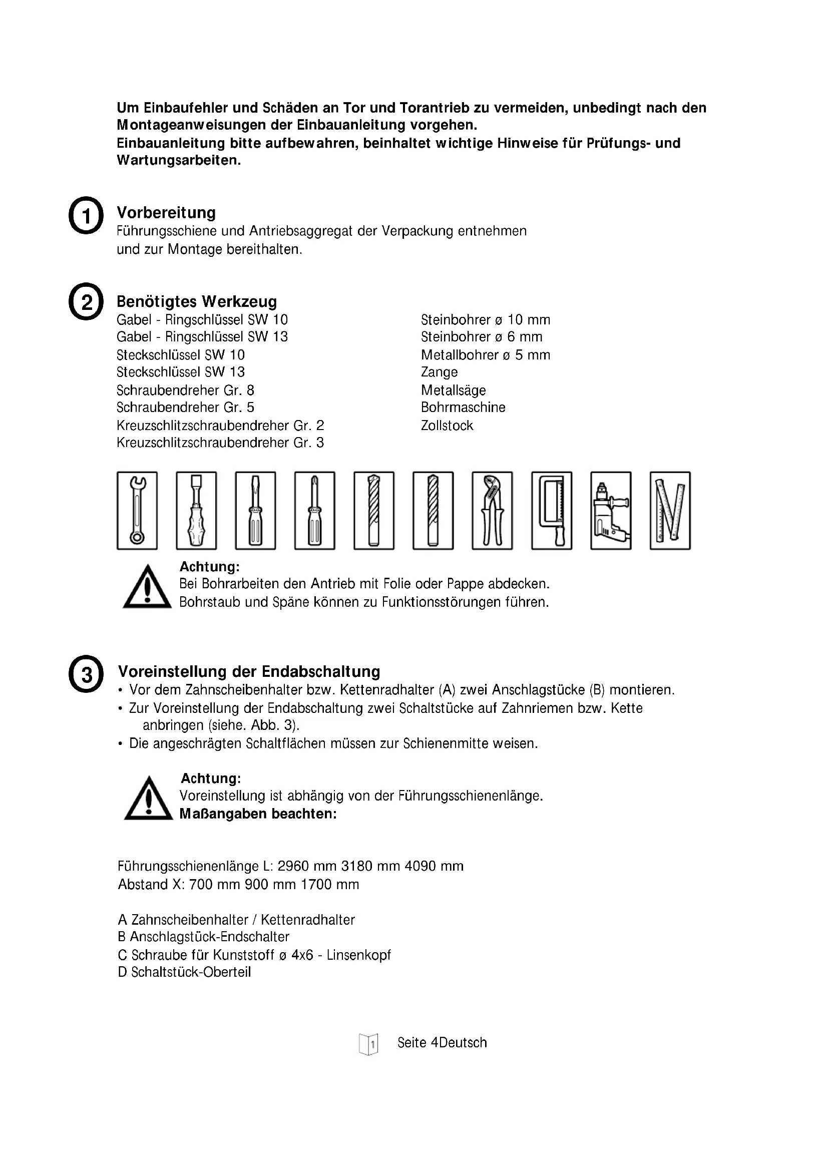Seite 4 - 15 Seite 4 - 8 Seite 8 - 13 Seite 13 Seite 14 Seite 15 Seite 15 Page 16 - 27 Page 16 - 20 Page 20 - 25 Page 25 Page 26 Page 27 Page 27 Page 28 - 39 Page 28 - 32 Page 32 - 35 Page 35 Page 36 Page 37 Page 37 Blz. 40 - 51 Blz. 40 - 44 Blz. 44 - 49 Blz. 49 Blz. 50 Blz. 51 Blz. 51 Pagina 52 - 63 Pagina 52 - 56 Pagina 56 - 61 Pagina 61 Pagina 62 Pagina 63 Pagina 63Seite 4Deutsch Um Einbaufehler und Schäden an Tor und Torantrieb zu vermeiden, unbedingt nach den Montageanweisungen der Einbauanleitung vorgehen. Einbauanleitung bitte aufbewahren, beinhaltet wichtige Hinweise für Prüfungs- und Wartungsarbeiten. Benötigtes Werkzeug Gabel - Ringschlüssel SW 10 Gabel - Ringschlüssel SW 13 Steckschlüssel SW 10 Steckschlüssel SW 13 Schraubendreher Gr. 8 Schraubendreher Gr. 5 Kreuzschlitzschraubendreher Gr. 2 Kreuzschlitzschraubendreher Gr. 3 Steinbohrer ø 10 mm Steinbohrer ø 6 mm Metallbohrer ø 5 mm Zange Metallsäge Bohrmaschine Zollstock
