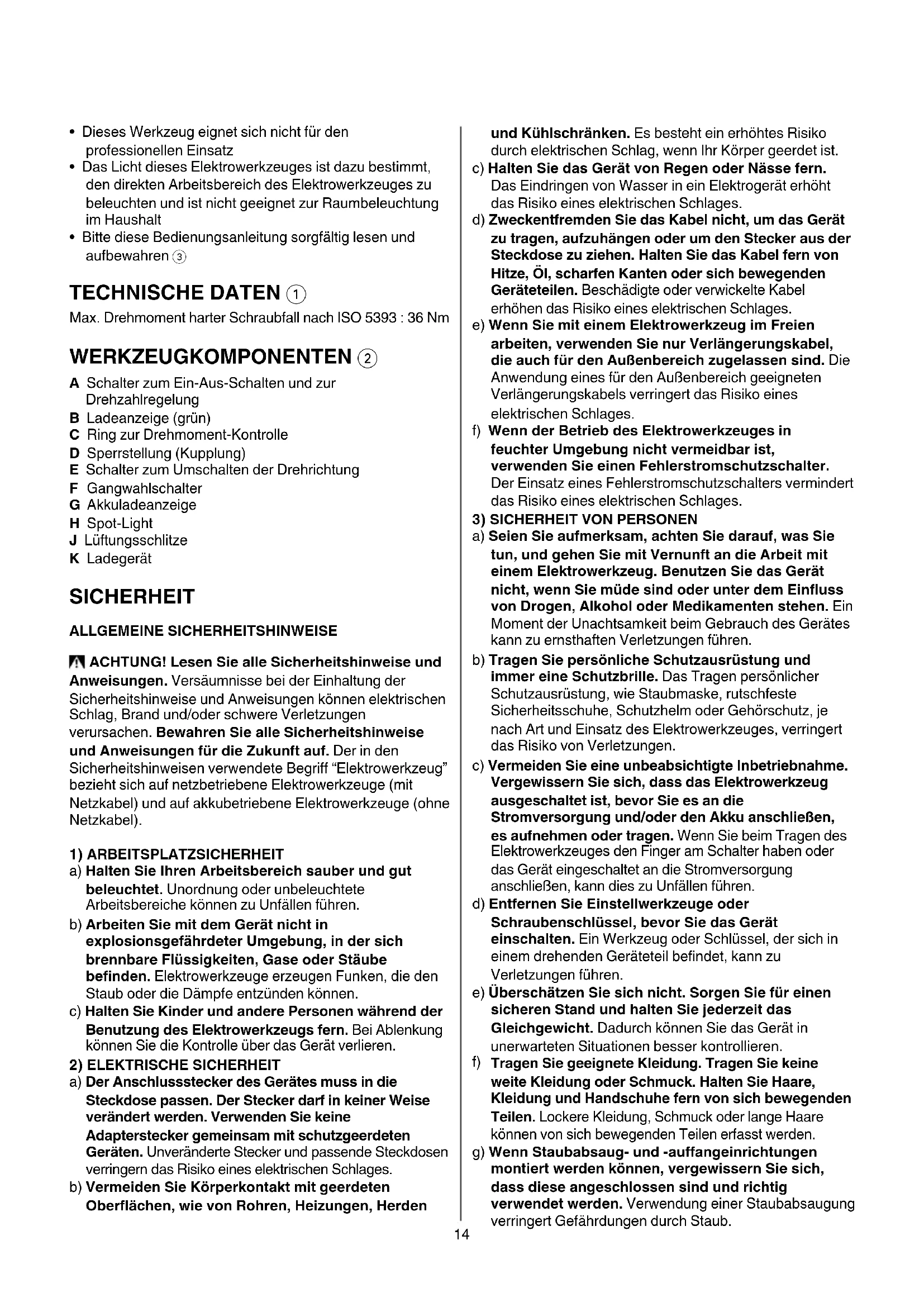 - Bitte diese Bedienungsanleitung sorgfältig lesen und aufbewahren 3 TECHNISCHE DATEN 1 Max. Drehmoment harter Schraubfall nach ISO 5393 : 36 Nm WERKZEUGKOMPONENTEN 2 A Schalter zum Ein-Aus-Schalten und zur Drehzahlregelung B Ladeanzeige (grün) C Ring zur Drehmoment-Kontrolle D Sperrstellung (Kupplung) E Schalter zum Umschalten der Drehrichtung F Gangwahlschalter G Akkuladeanzeige H Spot-Light J Lüftungsschlitze K Ladegerät SICHERHEIT ALLGEMEINE SICHERHEITSHINWEISE ACHTUNG! Lesen Sie alle Sicherheitshinweise und Anweisungen. Versäumnisse bei der Einhaltung der Sicherheitshinweise und Anweisungen können elektrischen Schlag, Brand und/oder schwere Verletzungen verursachen. Bewahren Sie alle Sicherheitshinweise und Anweisungen für die Zukunft auf. Der in den Sicherheitshinweisen verwendete Begriff “Elektrowerkzeug” bezieht sich auf netzbetriebene Elektrowerkzeuge (mit Netzkabel) und auf akkubetriebene Elektrowerkzeuge (ohne Netzkabel).
