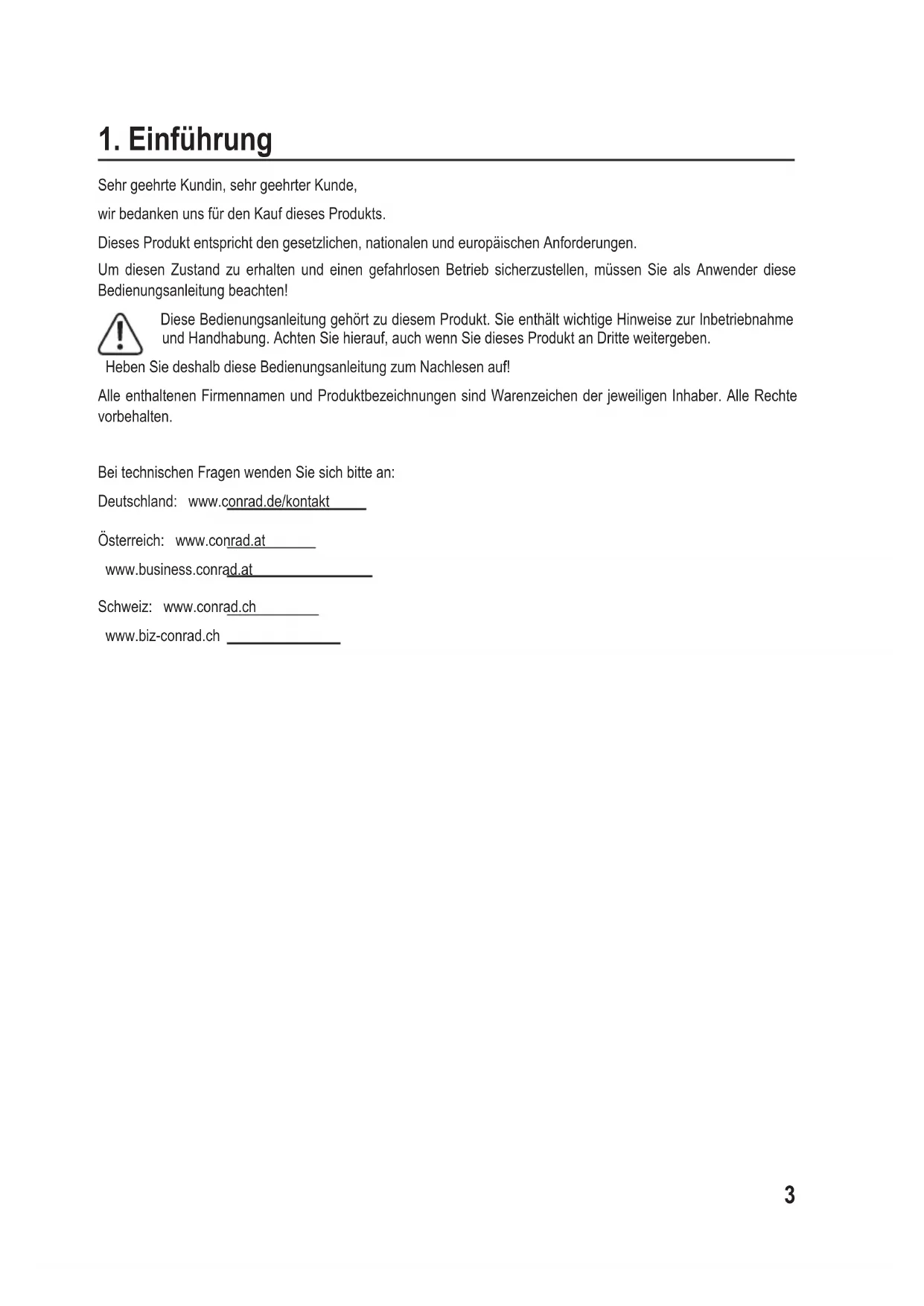Sehr geehrte Kundin, sehr geehrter Kunde, wir bedanken uns für den Kauf dieses Produkts. Dieses Produkt entspricht den gesetzlichen, nationalen und europäischen Anforderungen. Um diesen Zustand zu erhalten und einen gefahrlosen Betrieb sicherzustellen, müssen Sie als Anwender diese Bedienungsanleitung beachten! Diese Bedienungsanleitung gehört zu diesem Produkt. Sie enthält wichtige Hinweise zur Inbetriebnahme und Handhabung. Achten Sie hierauf, auch wenn Sie dieses Produkt an Dritte weitergeben. Heben Sie deshalb diese Bedienungsanleitung zum Nachlesen auf! Alle enthaltenen Firmennamen und Produktbezeichnungen sind Warenzeichen der jeweiligen Inhaber. Alle Rechte vorbehalten. Bei technischen Fragen wenden Sie sich bitte an: Deutschland: www.conrad.de/kontakt Österreich: www.conrad.at www.business.conrad.at Schweiz: www.conrad.ch www.biz-conrad.ch4