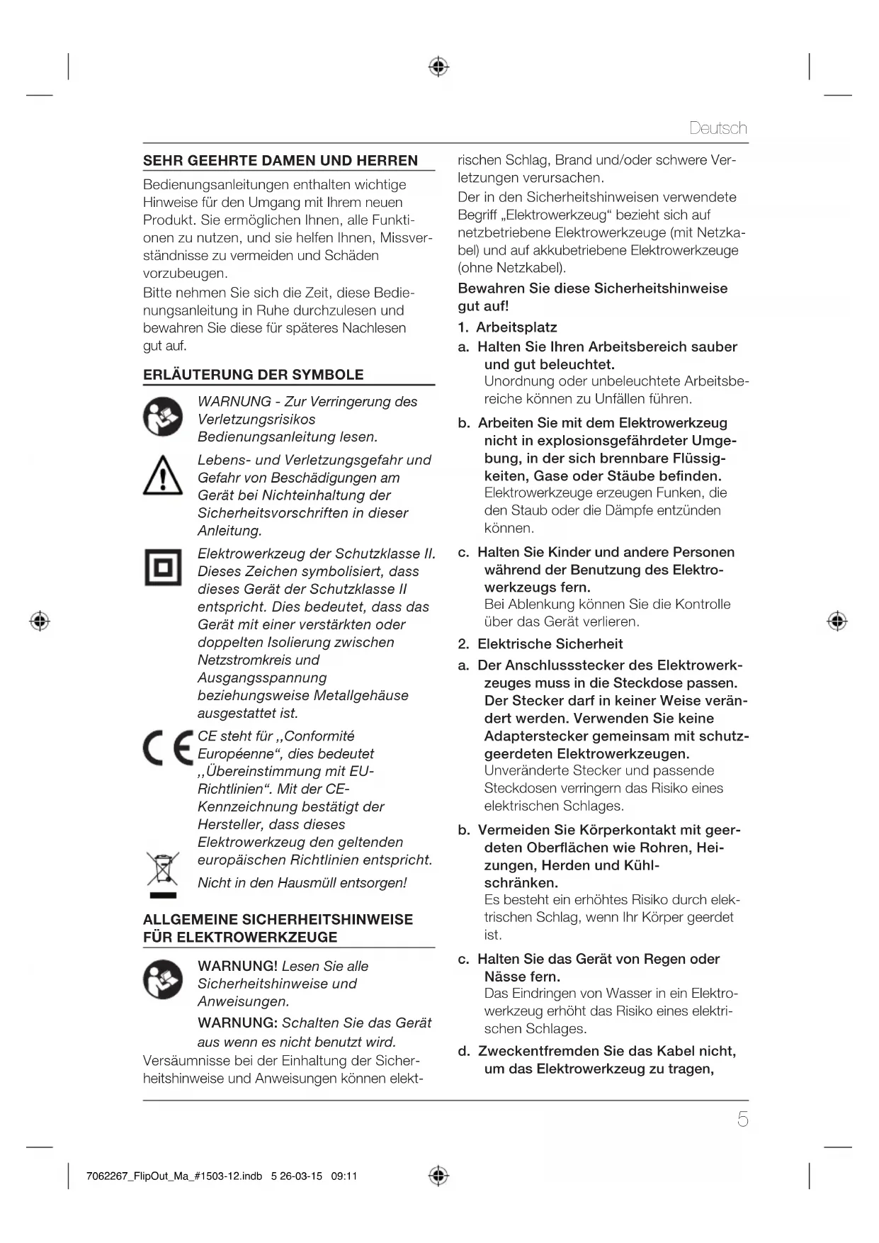a. Der Anschlussstecker des Elektrowerk‑ zeuges muss in die Steckdose passen. Der Stecker darf in keiner Weise verän‑ dert werden. Verwenden Sie keine Adapterstecker gemeinsam mit schutz‑ geerdeten Elektrowerkzeugen. Unveränderte Stecker und passende Steckdosen verringern das Risiko eines elektrischen Schlages. b. Vermeiden Sie Körperkontakt mit geer‑ deten Oberächen wie Rohren, Hei‑ zungen, Herden und Kühl‑ schränken. Es besteht ein erhöhtes Risiko durch elek- trischen Schlag, wenn Ihr Körper geerdet ist. c. Halten Sie das Gerät von Regen oder Nässe fern. Das Eindringen von Wasser in ein Elektro- werkzeug erhöht das Risiko eines elektri- schen Schlages. d. Zweckentfremden Sie das Kabel nicht, um das Elektrowerkzeug zu tragen, 7062267_FlipOut_Ma_#1503-12.indb 5 26-03-15 09:11Deutsch