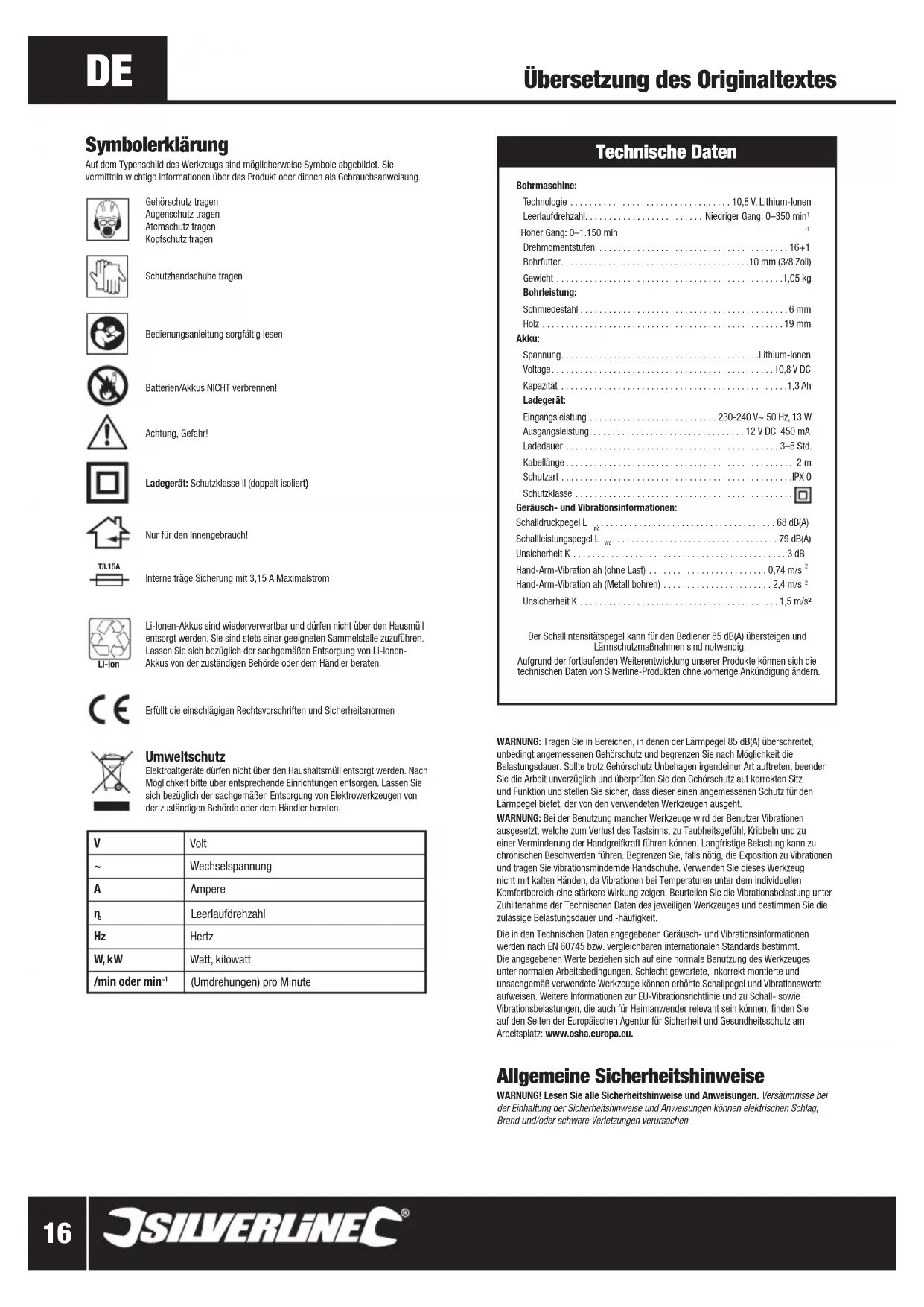 Unsicherheit K ..........................................1,5 m/s² Der Schallintensitätspegel kann für den Bediener 85 dB(A) übersteigen und Lärmschutzmaßnahmen sind notwendig.Aufgrund der fortlaufenden Weiterentwicklung unserer Produkte können sich die technischen Daten von Silverline-Produkten ohne vorherige Ankündigung ändern. Symbolerklärung Auf dem Typenschild des Werkzeugs sind möglicherweise Symbole abgebildet. Sie vermitteln wichtige Informationen über das Produkt oder dienen als Gebrauchsanweisung. Gehörschutz tragen Augenschutz tragenAtemschutz tragenKopfschutz tragen Schutzhandschuhe tragenBedienungsanleitung sorgfältig lesenBatterien/Akkus NICHT verbrennen!Achtung, Gefahr!Ladegerät: Schutzklasse II (doppelt isoliert)Nur für den Innengebrauch!Interne träge Sicherung mit 3,15 A MaximalstromLi-Ionen-Akkus sind wiederverwertbar und dürfen nicht über den Hausmüll entsorgt werden. Sie sind stets einer geeigneten Sammelstelle zuzuführen. Lassen Sie sich bezüglich der sachgemäßen Entsorgung von Li-Ionen-Akkus von der zuständigen Behörde oder dem Händler beraten.Erfüllt die einschlägigen Rechtsvorschriften und Sicherheitsnormen Umweltschutz Elektroaltgeräte dürfen nicht über den Haushaltsmüll entsorgt werden. Nach Möglichkeit bitte über entsprechende Einrichtungen entsorgen. Lassen Sie sich bezüglich der sachgemäßen Entsorgung von Elektrowerkzeugen von der zuständigen Behörde oder dem Händler beraten.Li-ion T-130˚ T3.15A V Volt ~ Wechselspannung A Ampere