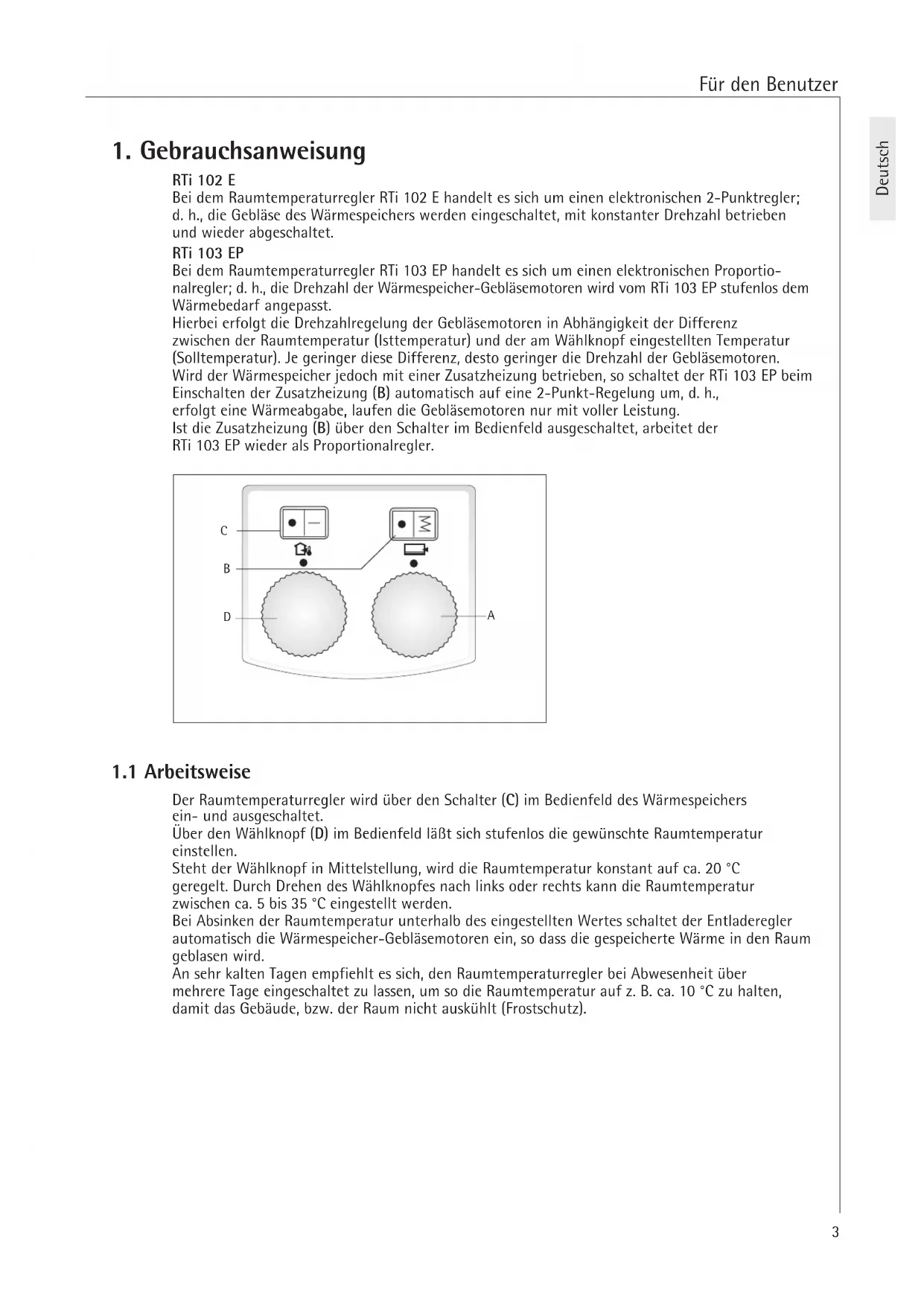 Bei dem Raumtemperaturregler RTi 103 EP handelt es sich um einen elektronischen Proportionalregler; d. h., die Drehzahl der Wärmespeicher-Geblasemotoren wird vom RTi 103 EP stufenlos dem Wärmebedarf angepasst.