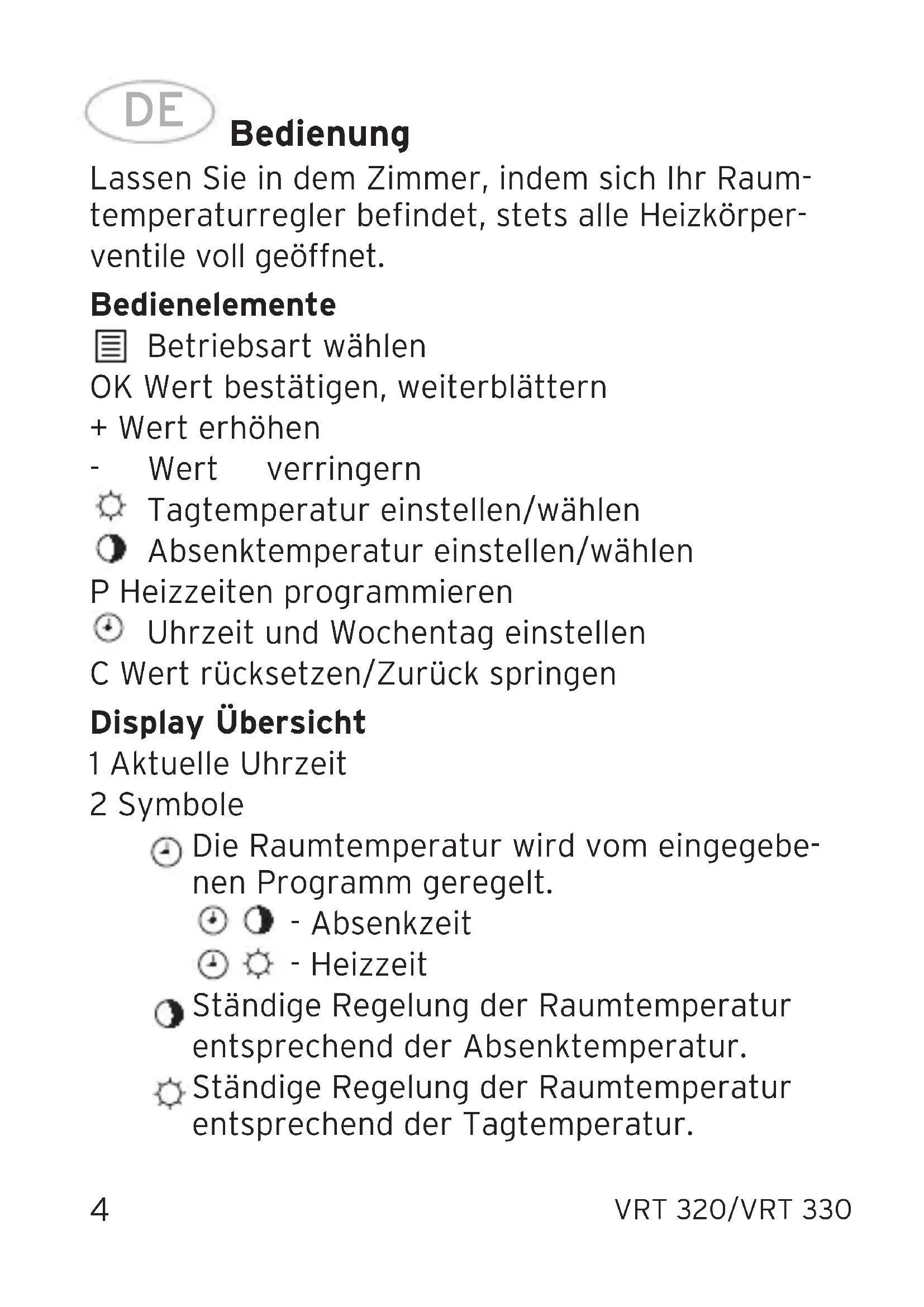 = Heizzeit ein) 5 VRT 330 Wochentage (1 = Mo, 2 = Di, 3 = Mi, 4 = Do, 5 = Fr, 6 = Sa, 7 = So) 6 VRT 330 Markierung des aktuellen Wochentags Beschreibung des Gerätes VRT 320 Der VRT 320 ist ein Raumtemperaturregler mit Tages-Heizprogramm. Er verfügt über ein einstell- bares Programm. Werkseinstellung: Heizzeit: 6:00-22:00 Uhr Beschreibung des Gerätes VRT 330 Der VRT 330 ist ein Raumtemperaturregler mit Wochen-Heizprogramm. Er verfügt über 2 Grund- programme P1 und P2, ein veränderbares Blockpro- gramm P3 und ein individuell einstellbares Pro- gramm Pi. DEVRT 320/VRT 330