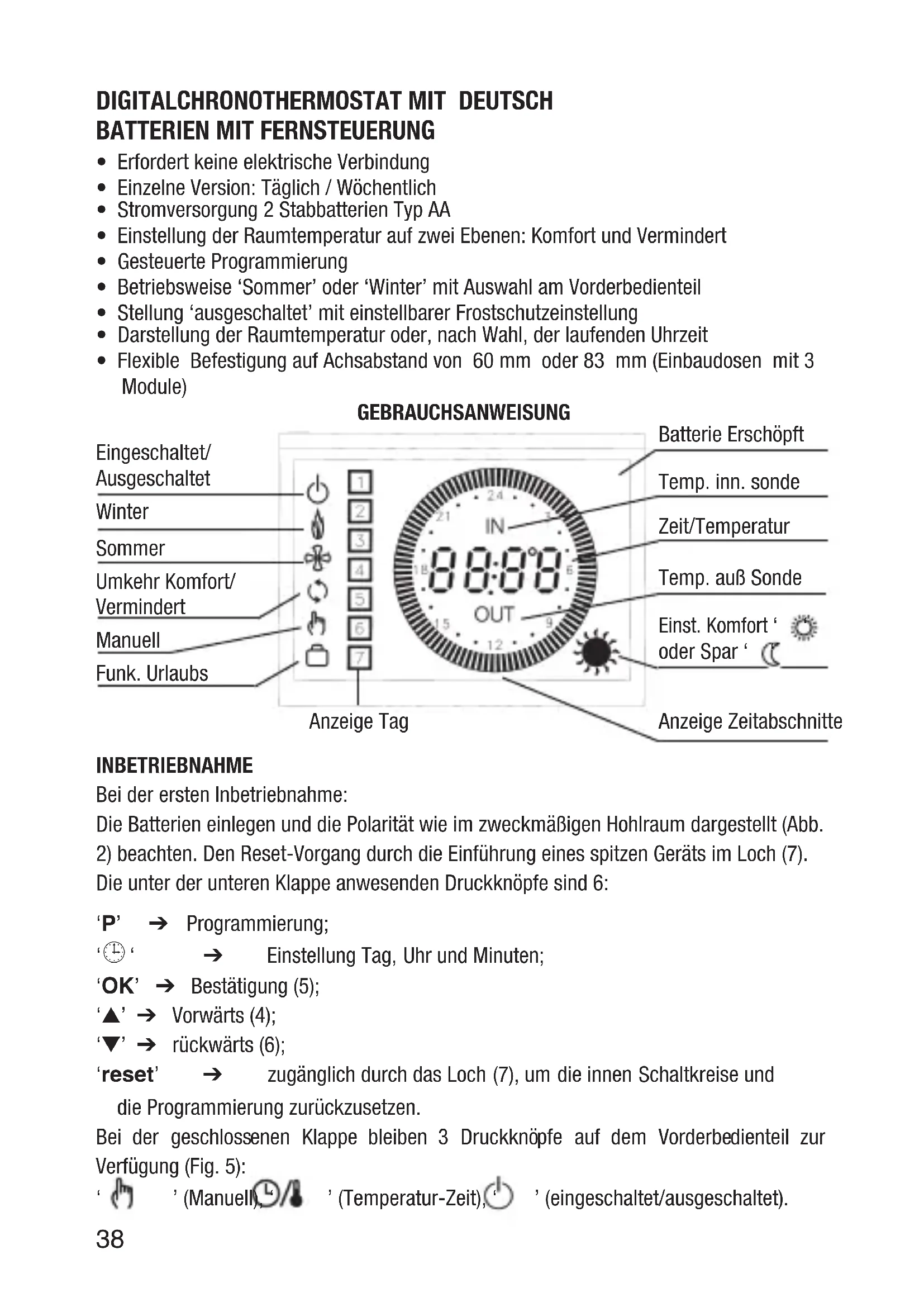 - Darstellung der Raumtemperatur oder, nach Wahl, der laufenden Uhrzeit
