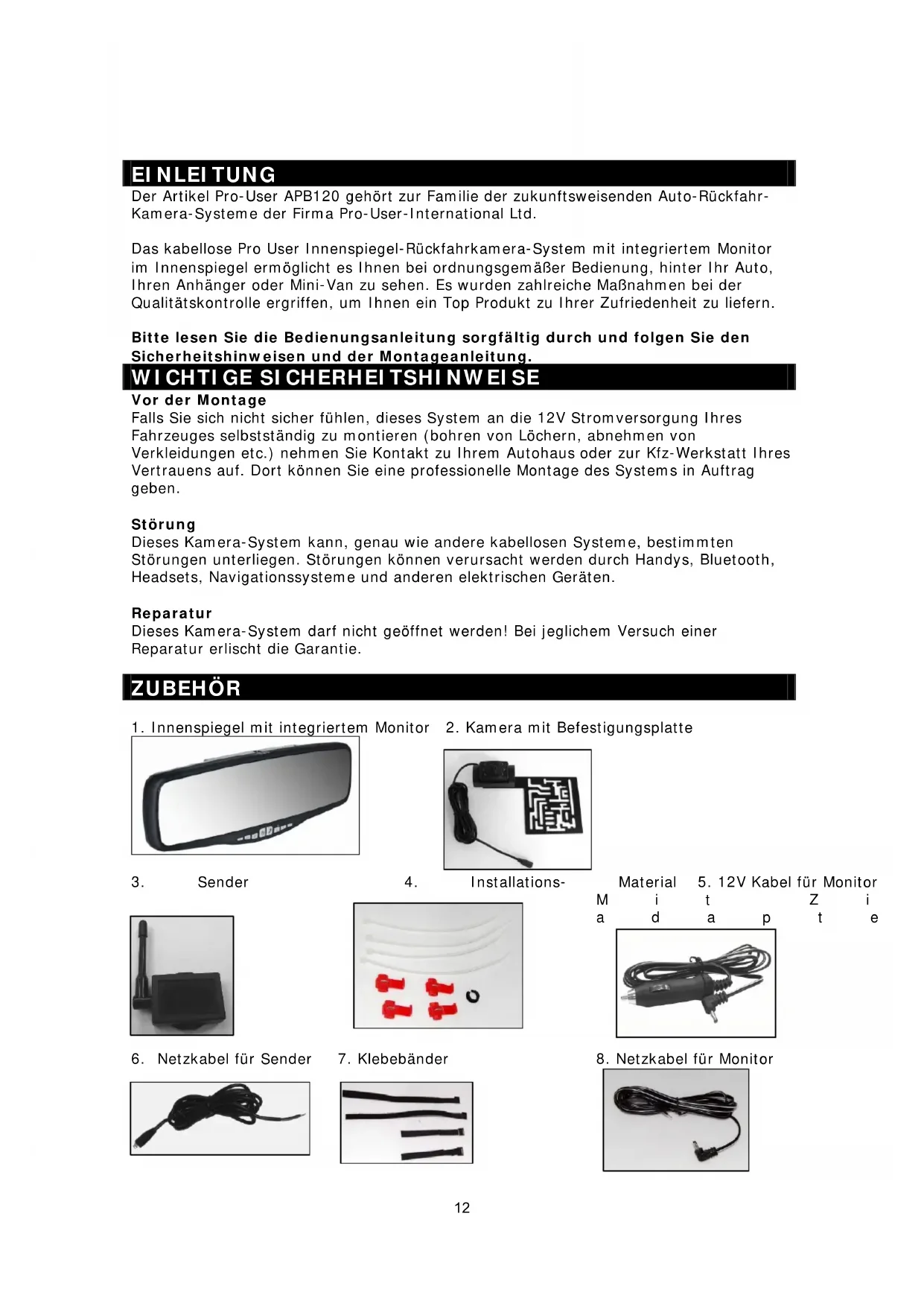 Laden Sie die Anleitung für Ihr Rückfahrkamera kostenlos im PDF-Format! Finden Sie Ihr Handbuch APB120 - Pro-User und nehmen Sie Ihr elektronisches Gerät wieder in die Hand. Auf dieser Seite sind alle Dokumente veröffentlicht, die für die Verwendung Ihres Geräts notwendig sind. APB120 von der Marke Pro-User.