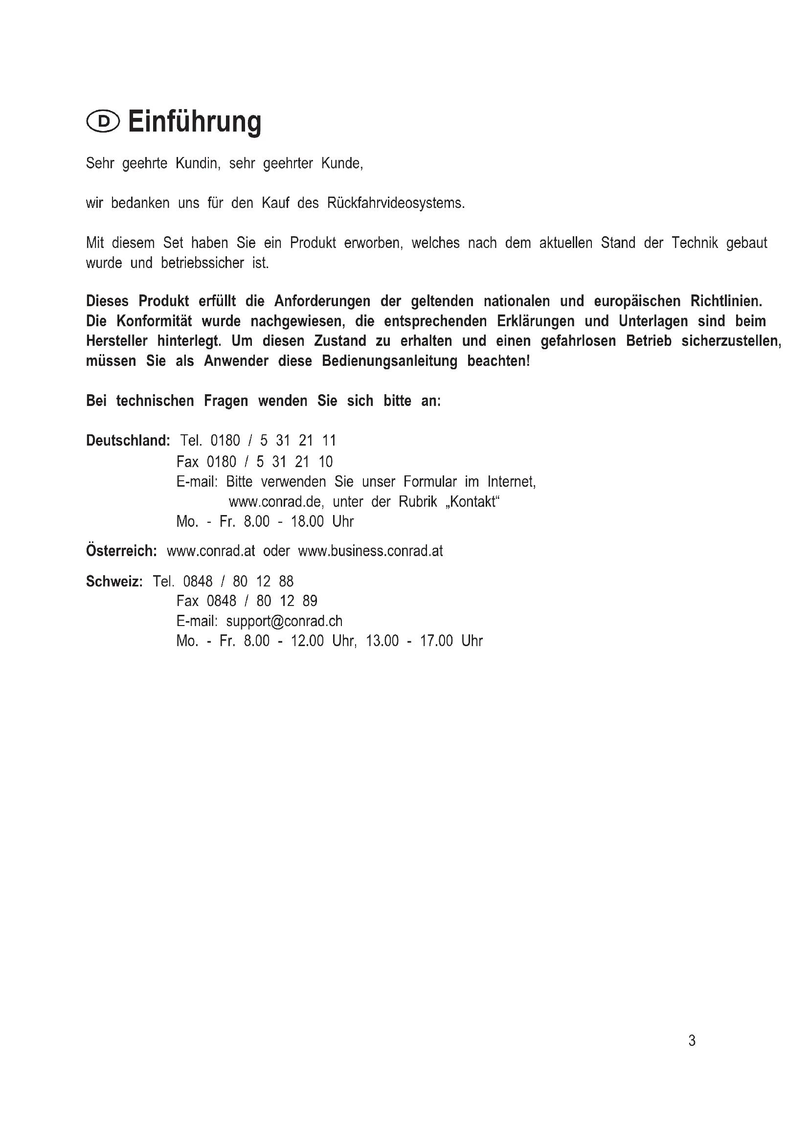 Einführung Sehr geehrte Kundin, sehr geehrter Kunde, wir bedanken uns für den Kauf des Rückfahrvideosystems. Mit diesem Set haben Sie ein Produkt erworben, welches nach dem aktuellen Stand der Technik gebaut wurde und betriebssicher ist. Dieses Produkt erfüllt die Anforderungen der geltenden nationalen und europäischen Richtlinien. Die Konformität wurde nachgewiesen, die entsprechenden Erklärungen und Unterlagen sind beim Hersteller hinterlegt. Um diesen Zustand zu erhalten und einen gefahrlosen Betrieb sicherzustellen, müssen Sie als Anwender diese Bedienungsanleitung beachten! Bei technischen Fragen wenden Sie sich bitte an: Deutschland: Tel. 0180 / 5 31 21 11 Fax 0180 / 5 31 21 10 E-mail: Bitte verwenden Sie unser Formular im Internet, www.conrad.de, unter der Rubrik „Kontakt“ Mo. - Fr. 8.00 - 18.00 Uhr Österreich: www.conrad.at oder www.business.conrad.at Schweiz: Tel. 0848 / 80 12 88 Fax 0848 / 80 12 89 E-mail: support@conrad.ch Mo. - Fr. 8.00 - 12.00 Uhr, 13.00 - 17.00 Uhr4 Bestimmungsgemäße Verwendung Das Rückfahrvideosystem dient dazu, beim Parken oder Rückwärtsfahren mit einem Kfz, Hindernisse anzuzeigen. Es arbeitet mit Ultraschallsensoren und einer Rückfahrkamera mit IR-Beleuchtung. Das Rückfahrbild und der Abstand zu möglichen Hindernissen wird im TFT-Farbmonitor, der im Rückspiegel integriert ist, dargestellt. Hindernisse werden zusätzlich akustisch durch einen Piepton angezeigt. Dieses Produkt ist nur für den Anschluss an ein 12V DC-Bordnetz mit Minuspol der Autobatterie an der Karosserie zugelassen und darf nur in Pkws und Lkws mit dieser Bordspannungsart eingebaut und in Betrieb genommen werden. Der integrierte Monitor (Bilddiagonale ca. 8,5 cm (3,5“)) im Rückspiegel ist nur bei der Rückwärtsfahrt zum Einparken zulässig. Durch die Klemmhalterungen kann der TFT-Rückspiegel ohne großen Aufwand am fahrzeugeigenen Rückspiegel befestigt werden. Durch die Art des Einbaus ist vom Benutzer sicherzustellen, dass die Steuerelektronik, der Signalgeber und die Anschlussbox vor Feuchtigkeit und Nässe geschützt werden. Eine andere Verwendung als zuvor beschrieben, führt zur Beschädigung dieses Produktes, darüber hinaus ist dies mit Gefahren, wie z.B. Kurzschluss, Brand, elektrischer Schlag etc. verbunden. Das gesamte Produkt darf nicht geändert bzw. umgebaut werden!
