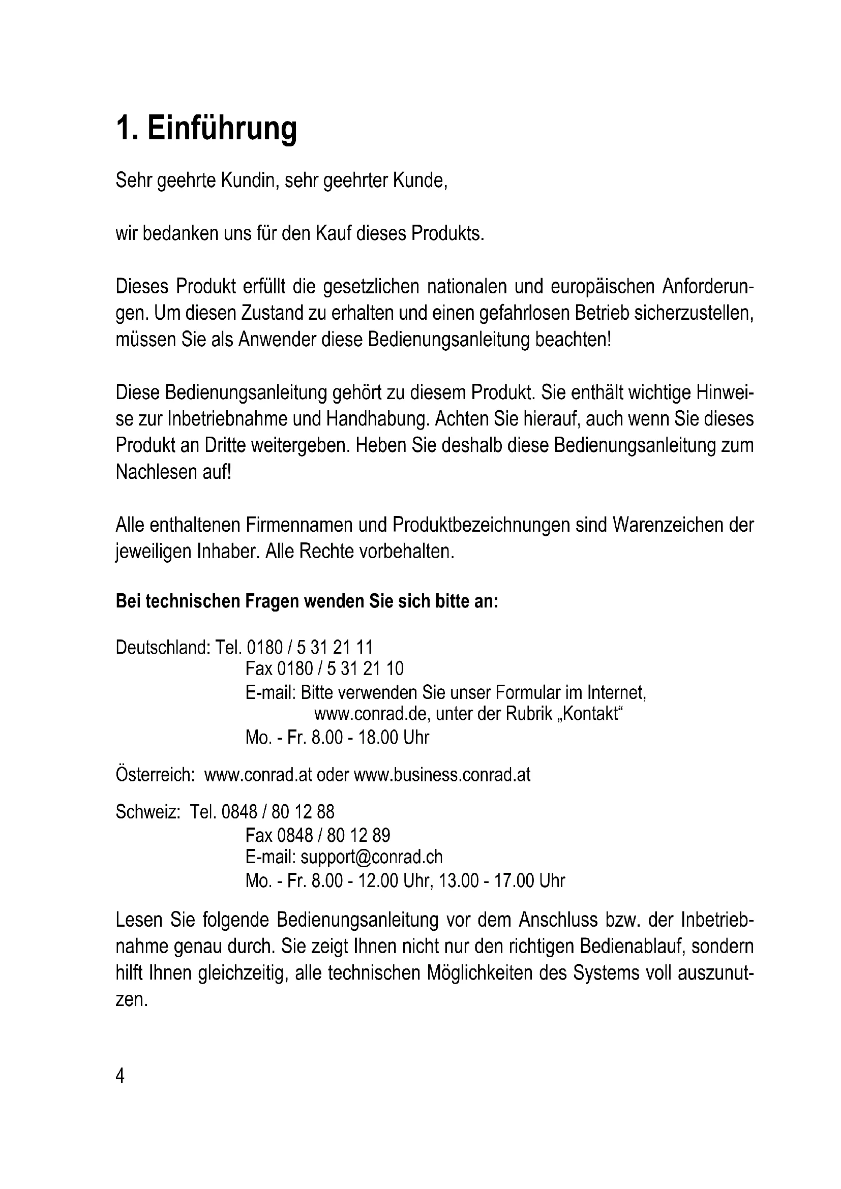 Sehr geehrte Kundin, sehr geehrter Kunde, wir bedanken uns für den Kauf dieses Produkts. Dieses Produkt erfüllt die gesetzlichen nationalen und europäischen Anforderun- gen. Um diesen Zustand zu erhalten und einen gefahrlosen Betrieb sicherzustellen, müssen Sie als Anwender diese Bedienungsanleitung beachten! Diese Bedienungsanleitung gehört zu diesem Produkt. Sie enthält wichtige Hinwei- se zur Inbetriebnahme und Handhabung. Achten Sie hierauf, auch wenn Sie dieses Produkt an Dritte weitergeben. Heben Sie deshalb diese Bedienungsanleitung zum Nachlesen auf! Alle enthaltenen Firmennamen und Produktbezeichnungen sind Warenzeichen der jeweiligen Inhaber. Alle Rechte vorbehalten. Bei technischen Fragen wenden Sie sich bitte an: Deutschland: Tel. 0180 / 5 31 21 11 Fax 0180 / 5 31 21 10 E-mail: Bitte verwenden Sie unser Formular im Internet, www.conrad.de, unter der Rubrik „Kontakt“ Mo. - Fr. 8.00 - 18.00 Uhr Österreich: www.conrad.at oder www.business.conrad.at Schweiz: Tel. 0848 / 80 12 88 Fax 0848 / 80 12 89 E-mail: support@conrad.ch Mo. - Fr. 8.00 - 12.00 Uhr, 13.00 - 17.00 Uhr Lesen Sie folgende Bedienungsanleitung vor dem Anschluss bzw. der Inbetrieb- nahme genau durch. Sie zeigt Ihnen nicht nur den richtigen Bedienablauf, sondern hilft Ihnen gleichzeitig, alle technischen Möglichkeiten des Systems voll auszunut- zen.