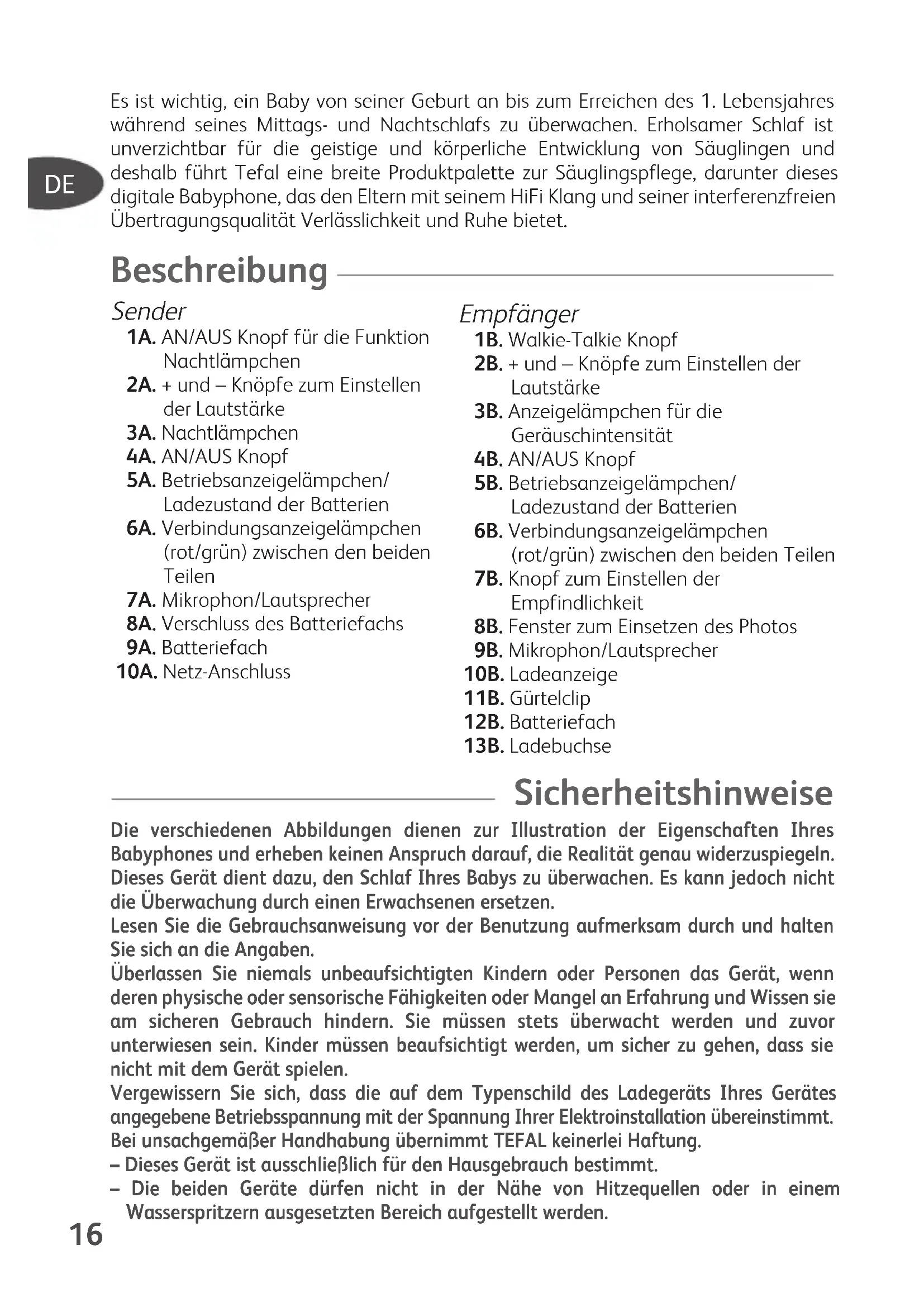 Es ist wichtig, ein Baby von seiner Geburt an bis zum Erreichen des 1. Lebensjahres während seines Mittags- und Nachtschlafs zu überwachen. Erholsamer Schlaf ist unverzichtbar für die geistige und körperliche Entwicklung von Säuglingen und deshalb führt Tefal eine breite Produktpalette zur Säuglingspflege, darunter dieses digitale Babyphone, das den Eltern mit seinem HiFi Klang und seiner interferenzfreien Übertragungsqualität Verlässlichkeit und Ruhe bietet. Beschreibung Sender 1A. AN/AUS Knopf für die Funktion Nachtlämpchen 2A. + und – Knöpfe zum Einstellen der Lautstärke 3A. Nachtlämpchen 4A. AN/AUS Knopf 5A. Betriebsanzeigelämpchen/ Ladezustand der Batterien 6A. Verbindungsanzeigelämpchen (rot/grün) zwischen den beiden Teilen 7A. Mikrophon/Lautsprecher 8A. Verschluss des Batteriefachs 9A. Batteriefach 10A. Netz-Anschluss Sicherheitshinweise Die verschiedenen Abbildungen dienen zur Illustration der Eigenschaften Ihres Babyphones und erheben keinen Anspruch darauf, die Realität genau widerzuspiegeln. Dieses Gerät dient dazu, den Schlaf Ihres Babys zu überwachen. Es kann jedoch nicht die Überwachung durch einen Erwachsenen ersetzen. Lesen Sie die Gebrauchsanweisung vor der Benutzung aufmerksam durch und halten Sie sich an die Angaben. Überlassen Sie niemals unbeaufsichtigten Kindern oder Personen das Gerät, wenn deren physische oder sensorische Fähigkeiten oder Mangel an Erfahrung und Wissen sie am sicheren Gebrauch hindern. Sie müssen stets überwacht werden und zuvor unterwiesen sein. Kinder müssen beaufsichtigt werden, um sicher zu gehen, dass sie nicht mit dem Gerät spielen. Vergewissern Sie sich, dass die auf dem Typenschild des Ladegeräts Ihres Gerätes angegebene Betriebsspannung mit der Spannung Ihrer Elektroinstallation übereinstimmt. Bei unsachgemäßer Handhabung übernimmt TEFAL keinerlei Haftung. – Dieses Gerät ist ausschließlich für den Hausgebrauch bestimmt. – Die beiden Geräte dürfen nicht in der Nähe von Hitzequellen oder in einem Wasserspritzern ausgesetzten Bereich aufgestellt werden. Empfänger 1B. Walkie-Talkie Knopf 2B. + und – Knöpfe zum Einstellen der Lautstärke 3B. Anzeigelämpchen für die Geräuschintensität 4B. AN/AUS Knopf 5B. Betriebsanzeigelämpchen/ Ladezustand der Batterien 6B. Verbindungsanzeigelämpchen (rot/grün) zwischen den beiden Teilen 7B. Knopf zum Einstellen der Empfindlichkeit 8B. Fenster zum Einsetzen des Photos 9B. Mikrophon/Lautsprecher 10B. Ladeanzeige 11B. Gürtelclip 12B. Batteriefach 13B. Ladebuchse TefDis-VB Numer 03-11 28/03/11 15:30 Page 16– Bewahren Sie den Sender und den Empfänger nicht in Reichweite von Kindern auf. – Das Gerät darf nur in Verbindung mit den im Lieferumfang enthaltenen Adaptern betrieben werden. Verwenden Sie das Ladeteil nicht zu anderen Zwecken Das Anschließen des Geräts an eine anders ausgelegte Stromversorgung kann zu Schäden am elektronischen Schaltkreis führen. – Stellen Sie die Geräte und die Adapter frei stehend auf, um eine korrekte Belüftung zu gewährleisten. – Wenn Sie das Gerät längere Zeit nicht benutzen, müssen die Geräte und die Adapter ausgesteckt und die Akkus / Batterien aus den Geräten herausgenommen werden. – Die Garantiezeit für die Akkus beträgt 6 Monate. Wenn die Batterien oder Akkus leer sind und nicht mehr aufgeladen werden können, müssen sie allesamt ausgetauscht werden. Die Batterien und Akkus entsprechen dem Standard und sind im Handel oder in Ihrer autorisierten Kundendienstwerkstatt erhältlich. – Stellen Sie den Sender nicht in das Bett oder den Spielbereich des Kindes. – Benutzen Sie keine Verlängerungskabel. – Wenn das Ladegerät oder das Kabel des Ladegeräts Beschädigungen aufweisen, darf das Ladegerät nicht geöffnet werden. Bitte wenden Sie sich hierfür an das nächstgelegene zugelassene Kundendienstcenter. – Ziehen Sie das Ladeteil nicht am Kabel aus der Steckdose – Nehmen Sie die Geräte nicht auseinander. Wenden Sie sich bei Pannen oder Betriebsstörungen stets an ein autorisiertes Kundendienstzentrum von TEFAL. Dieses Gerät ist mit NiMh Akkus ausgestattet, die aus Sicherheitsgründen nur professionellen Reparaturfachleuten zugänglich sind. Wenn die Batterie nicht mehr aufgeladen werden kann, muss der NiMh Batterie-Block herausgenommen werden. Bitte wenden Sie sich zum Austauschen der Akkus an das nächstgelegene autorisierte Kundendienstcenter. Anstelle des Batterie-Blocks mit wieder aufladbaren Batterien dürfen keine nicht wieder aufladbaren Batterien eingelegt werden. Ziehen Sie das Ladeteil aus der Steckdose bevor Sie die Batterien entnehmen Die Batterien sind ausschließlich für den Betrieb in geschlossenen Räumen bestimmt. Tauchen Sie die Batterien nicht ins Wasser. Gehen Sie pfleglich mit den Batterien um. Nehmen Sie die Batterien nicht in den Mund. Bringen Sie die Batterien nicht mit anderen Gegenständen aus Metall in Berührung (Ringe, Nägel, Schrauben...). Vermeiden Sie es, Kurzschlüsse in den Batterien hervorzurufen, indem Sie Gegenstände aus Metall mit ihren Enden in Kontakt bringen. Im Falle eines Kurzschlusses kann die Temperatur der Batterien gefährlich hoch steigen und ernsthafte Verbrennungen hervorrufen; die Batterien können sogar Feuer fangen. Auslaufende Batterien dürfen nicht mit den Augen und Schleimhäuten in Berührung gebracht werden. Waschen Sie sich die Hände und spülen Sie die Augen mit klarem Wasser aus. Wenn Sie weiterhin Beschwerden haben, muss ein Arzt aufgesucht werden. Technische Angaben Frequenzbereich: 1,88 – 1,9 GHz Entspricht der Europäischen Richtlinie (RTTE) 1999/5/EC vom 9. März 1999. Entspricht den Richtlinien: EN 301 489–1, EN 301 489–3, EN 301 357–1 und EN 301 357–2.