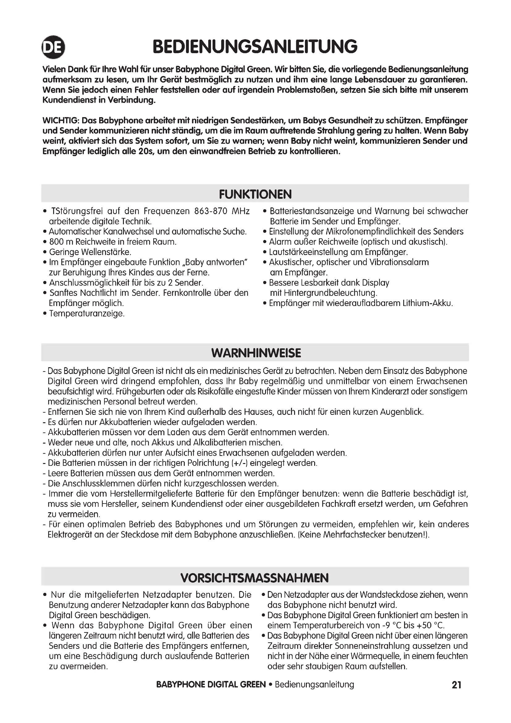 - Empfänger mit wiederaufladbarem Lithium-Akku. BABYPHONE DIGITAL GREEN • Bedienungsanleitung BEDIENUNGSANLEITUNG WARNHINWEISE - Das Babyphone Digital Green ist nicht als ein medizinisches Gerät zu betrachten. Neben dem Einsatz des Babyphone Digital Green wird dringend empfohlen, dass Ihr Baby regelmäßig und unmittelbar von einem Erwachsenen beaufsichtigt wird. Frühgeburten oder als Risikofälle eingestufte Kinder müssen von Ihrem Kinderarzt oder sonstigem medizinischen Personal betreut werden. - Entfernen Sie sich nie von Ihrem Kind außerhalb des Hauses, auch nicht für einen kurzen Augenblick. - Es dürfen nur Akkubatterien wieder aufgeladen werden. - Akkubatterien müssen vor dem Laden aus dem Gerät entnommen werden. - Weder neue und alte, noch Akkus und Alkalibatterien mischen. - Akkubatterien dürfen nur unter Aufsicht eines Erwachsenen aufgeladen werden. - Die Batterien müssen in der richtigen Polrichtung (+/-) eingelegt werden. - Leere Batterien müssen aus dem Gerät entnommen werden. - Die Anschlussklemmen dürfen nicht kurzgeschlossen werden. - Immer die vom Herstellermitgelieferte Batterie für den Empfänger benutzen: wenn die Batterie beschädigt ist, muss sie vom Hersteller, seinem Kundendienst oder einer ausgebildeten Fachkraft ersetzt werden, um Gefahren zu vermeiden. - Für einen optimalen Betrieb des Babyphones und um Störungen zu vermeiden, empfehlen wir, kein anderes Elektrogerät an der Steckdose mit dem Babyphone anzuschließen. (Keine Mehrfachstecker benutzen!).