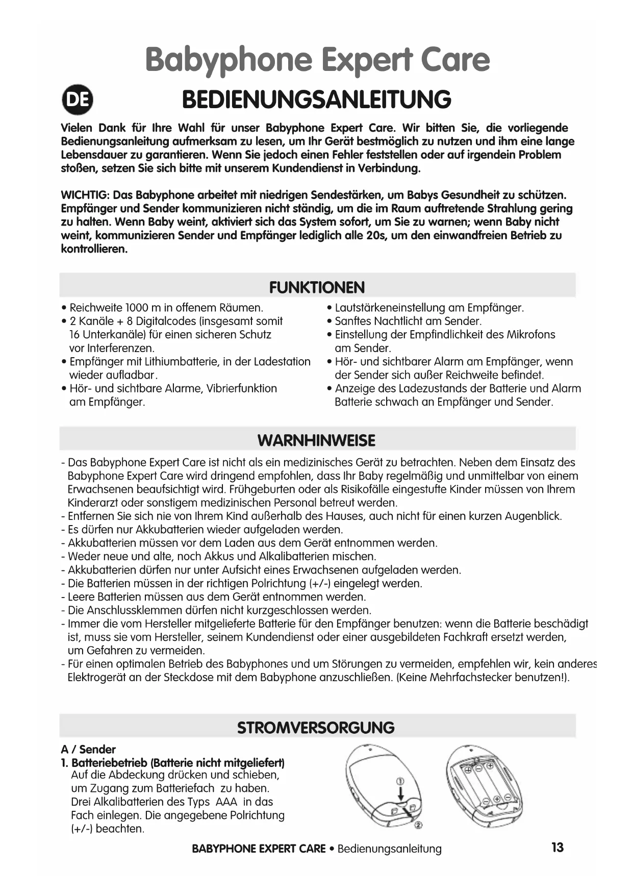 - Hör- und sichtbare Alarme, Vibrierfunktionam Empfänger.• Lautstärkeneinstellung am Empfänger.• Sanftes Nachtlicht am Sender.• Einstellung der Empfindlichkeit des Mikrofonsam Sender.• Hör- und sichtbarer Alarm am Empfänger, wennder Sender sich außer Reichweite befindet.• Anzeige des Ladezustands der Batterie und AlarmBatterie schwach an Empfänger und Sender.BABYPHONE EXPERT CARE • Bedienungsanleitung BEDIENUNGSANLEITUNG WARNHINWEISE - Das Babyphone Expert Care ist nicht als ein medizinisches Gerät zu betrachten. Neben dem Einsatz desBabyphone Expert Care wird dringend empfohlen, dass Ihr Baby regelmäßig und unmittelbar von einemErwachsenen beaufsichtigt wird. Frühgeburten oder als Risikofälle eingestufte Kinder müssen von IhremKinderarzt oder sonstigem medizinischen Personal betreut werden.- Entfernen Sie sich nie von Ihrem Kind außerhalb des Hauses, auch nicht für einen kurzen Augenblick.- Es dürfen nur Akkubatterien wieder aufgeladen werden.- Akkubatterien müssen vor dem Laden aus dem Gerät entnommen werden.- Weder neue und alte, noch Akkus und Alkalibatterien mischen.- Akkubatterien dürfen nur unter Aufsicht eines Erwachsenen aufgeladen werden.- Die Batterien müssen in der richtigen Polrichtung (+/-) eingelegt werden.- Leere Batterien müssen aus dem Gerät entnommen werden.- Die Anschlussklemmen dürfen nicht kurzgeschlossen werden.- Immer die vom Hersteller mitgelieferte Batterie für den Empfänger benutzen: wenn die Batterie beschädigtist, muss sie vom Hersteller, seinem Kundendienst oder einer ausgebildeten Fachkraft ersetzt werden,um Gefahren zu vermeiden.- Für einen optimalen Betrieb des Babyphones und um Störungen zu vermeiden, empfehlen wir, kein anderesElektrogerät an der Steckdose mit dem Babyphone anzuschließen. (Keine Mehrfachstecker benutzen!). STROMVERSORGUNG A / Sender1. Batteriebetrieb (Batterie nicht mitgeliefert)Auf die Abdeckung drücken und schieben,um Zugang zum Batteriefach zu haben.Drei Alkalibatterien des Typs AAA in dasFach einlegen. Die angegebene Polrichtung(+/-) beachten. Babyphone Expert Care
