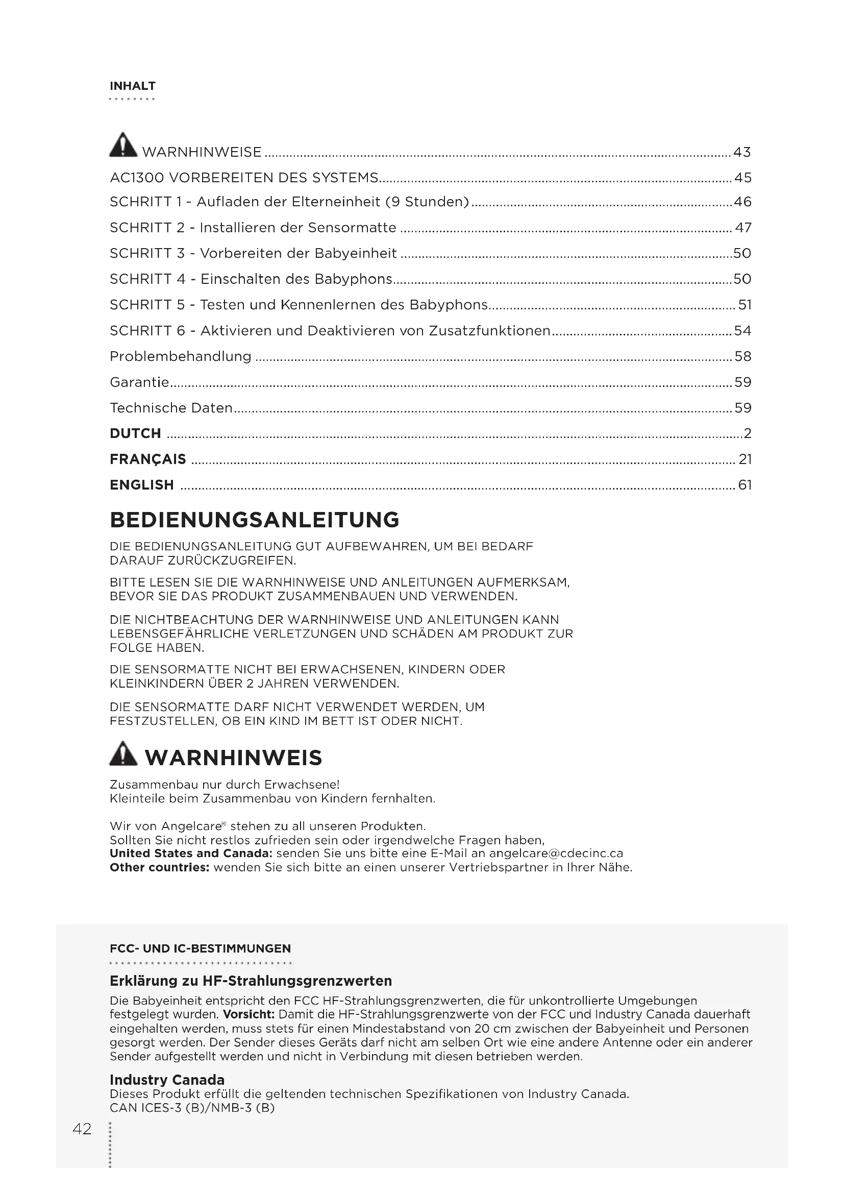 03mf3_Manuel_AC1300_BELGIQUE_12301.indd 42 2016-10-11 9:40 AM1. DIESES PRODUKT KANN EINE VERANTWORTUNGSVOLLE BEAUFSICHTIGUNG DURCH ERWACHSENE NICHT ERSETZEN. Das Produkt soll Sie bei der Überwachung Ihres Kindes lediglich unterstützen. Auch bei Verwendung des Babyphons müssen Sie Ihr Kind im notwendigen Maße beaufsichtigen, um seine Sicherheit zu gewährleisten. Die Überwachung von Frühgeborenen oder Risikokindern sollte immer unter Aufsicht einer medizinischen Fachkraft erfolgen. Dieses Babyphon DARF NICHT als medizinisches Gerät verwendet werden, auch nicht als Gerät zur Vermeidung von plötzlichem Kindstod (SIDS).2. WARNHINWEISE: Strangulationsgefahr – es hat bereits Fälle gegeben, in denen sich Kinder mit Kabeln STRANGULIERT haben. Kabel jeglicher Art mindestens 1 m von Kindern entfernt halten. NIEMALS die Sensormatte(n) ohne die schützenden Kabelabdeckungen verwenden. Die schützenden Kabelabdeckungen vor jeder Verwendung kontrollieren. Die Verwendung der Sensormatte(n) sofort einstellen, wenn die Schutzabdeckung beschädigt ist.3. Niemals Verlängerungskabel in Verbindung mit Netzteilen verwenden. NUR die mitgelieferten Netzteile verwenden.4. Nach Verbindung eines Netzteils mit der Steckdose, NIEMALS das blanke Kabelende berühren.5. IMMER sicherstellen, dass Sender und Empfänger einwandfrei funktionieren und in Reichweite zueinander sind. Das Babyphon vor der erstmaligen Verwendung, danach in regelmäßigen Abständen und immer dann testen, wenn die Babyeinheit an einem anderen Ort aufgestellt wird.6. IMMER sofort nach dem Baby sehen, wenn ein Alarm ertönt.7. Das Babyphon NIEMALS in der Nähe von Wasser (Badewanne, Spüle usw.) verwenden. VORSICHT STROMSCHLAGGEFAHR NICHT ÖFFNENNIEMALS REGEN ODER FEUCHTIGKEIT AUSSETZEN8. Das Babyphon von Wärmequellen (Öfen, Heizkörpern usw.) FERNHALTEN.9. Die Babyeinheit und die Elterneinheit IMMER aufrecht auf eine ebene Fläche stellen und für ausreichende Luftzufuhr sorgen. KEINESFALLS auf Sofas, Kissen, Betten usw. stellen – dadurch kann die Luftzufuhr behindert werden.10. Dieses Babyphon verwendet für die Signalübertragung öffentliche Funkfrequenzen. Die Elterneinheit kann Signale oder Störungen von anderen Babyphonen in Ihrer Nähe empfangen. Umgekehrt kann auch Ihr Babyphon von entsprechenden Systemen in der Nachbarschaft empfangen werden. Zum Schutz Ihrer Privatsphäre sollten Sie darauf achten, dass beide Geräte bei Nichtverwendung AUSGESCHALTET bleiben. Sollten Funkstörungen auftreten, ändern Sie bitte an der Babyeinheit und an der Elterneinheit den Kanal.11. Dieses Produkt ist KEIN Spielzeug. KEINESFALLS Kinder damit spielen lassen.12. Dieses Produkt enthält Kleinteile. Zusammenbau nur durch Erwachsene! Beim Auspacken und Zusammenbauen des Produkts vorsichtig sein und Kleinteile von Kindern fernhalten.13. Bei Verwendung des Babyphons sollte die Raumtemperatur zwischen 10 °C und 40 °C liegen. WARNHINWEIS ZU BATTERIEN 14. Explosionsgefahr bei falsch eingelegten Batterien. Bei dem Akku der Elterneinheit handelt es sich um einen austauschbaren Lithium-Ionen-Akku. Nur den von Angelcare empfohlenen Ersatzakku verwenden. In beiden Einheiten NIEMALS alte und neue Batterien mischen. NIEMALS Alkalibatterien, Standardbatterien oder wiederaufladbare Batterien (Akkus) mischen. Beim Einlegen der Batterien auf richtige Polarität achten. Die Stromanschlüsse NIEMALS kurzschließen. AUSSCHLIESSLICH die empfohlenen Batterien oder gleichwertige Produkte (in Bezug auf Spannung und Größe) und das vorgeschriebene Netzteil verwenden. Die Batterien aus beiden Einheiten herausnehmen, wenn das Produkt für längere Zeit gelagert werden soll oder die Batterien erschöpft sind. Erschöpfte Batterien vorschriftsmäßig entsorgen. Batterien jeglicher Art von Kindern fernhalten.15. WICHTIGE SICHERHEITSHINWEISE15.1 Alle Warnhinweise beachten – Alle Warnhinweise auf dem Produkt selbst und in der Bedienungsanleitung müssen strikt eingehalten werden.15.2 Alle Anleitungen genau befolgen – Sämtliche Anleitungen zur Bedienung und Verwendung des Systems müssen genau befolgt werden.15.3 Wasser und Feuchtigkeit – Dieses Gerät KEINESFALLS in der Nähe von Wasser benutzen. Das System darf beispielsweise nicht in der Nähe von Badewannen, Waschwannen, Spülen, Wäschebottichen, nassen Räumen jeder Art oder Schwimmbecken benutzt werden. Darauf achten, dass keine Gegenstände auf die Einheiten fallen und keine Flüssigkeiten über die Gehäuseöffnungen in die Einheiten oder die Sensormatte gelangen.15.4 Reinigung – Alle Einheiten vor der Reinigung von der Stromversorgung trennen. Das Babyphon KEINESFALLS in Wasser eintauchen, auch nicht teilweise. Zur Reinigung nur ein trockenes Tuch verwenden.15.5 Luftzufuhr – KEINESFALLS die Lüftungsschlitze blockieren. Bei Verwendung der Geräte für ausreichende Lüftung sorgen. KEINESFALLS die Babyeinheit oder die Elterneinheit mit einer Decke oder einem sonstigen Gegenstand zudecken. KEINESFALLS das Gerät in einer Schublade oder an einem anderen Ort WARNHINWEISE