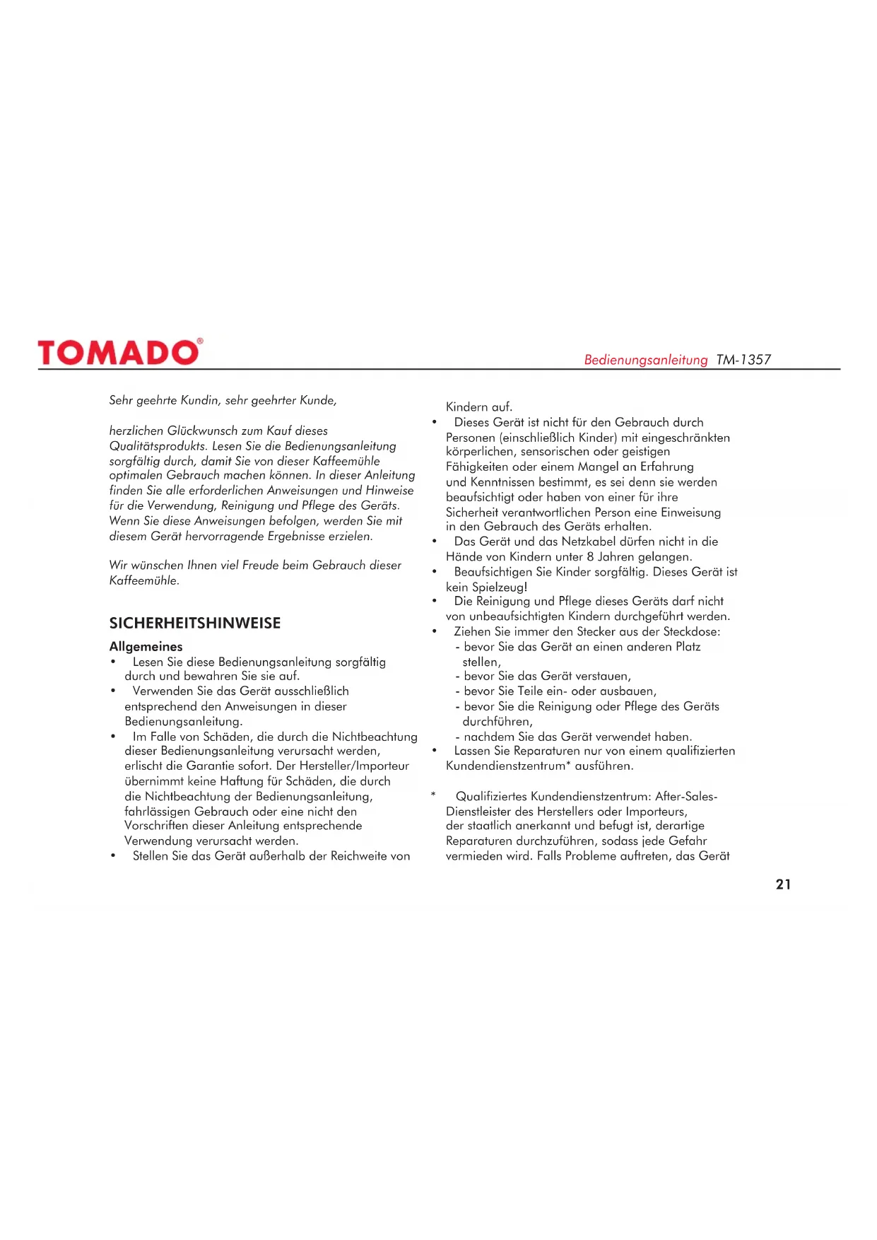 TM1357 - Kaffeemühle Tomado - Kostenlose Bedienungsanleitung