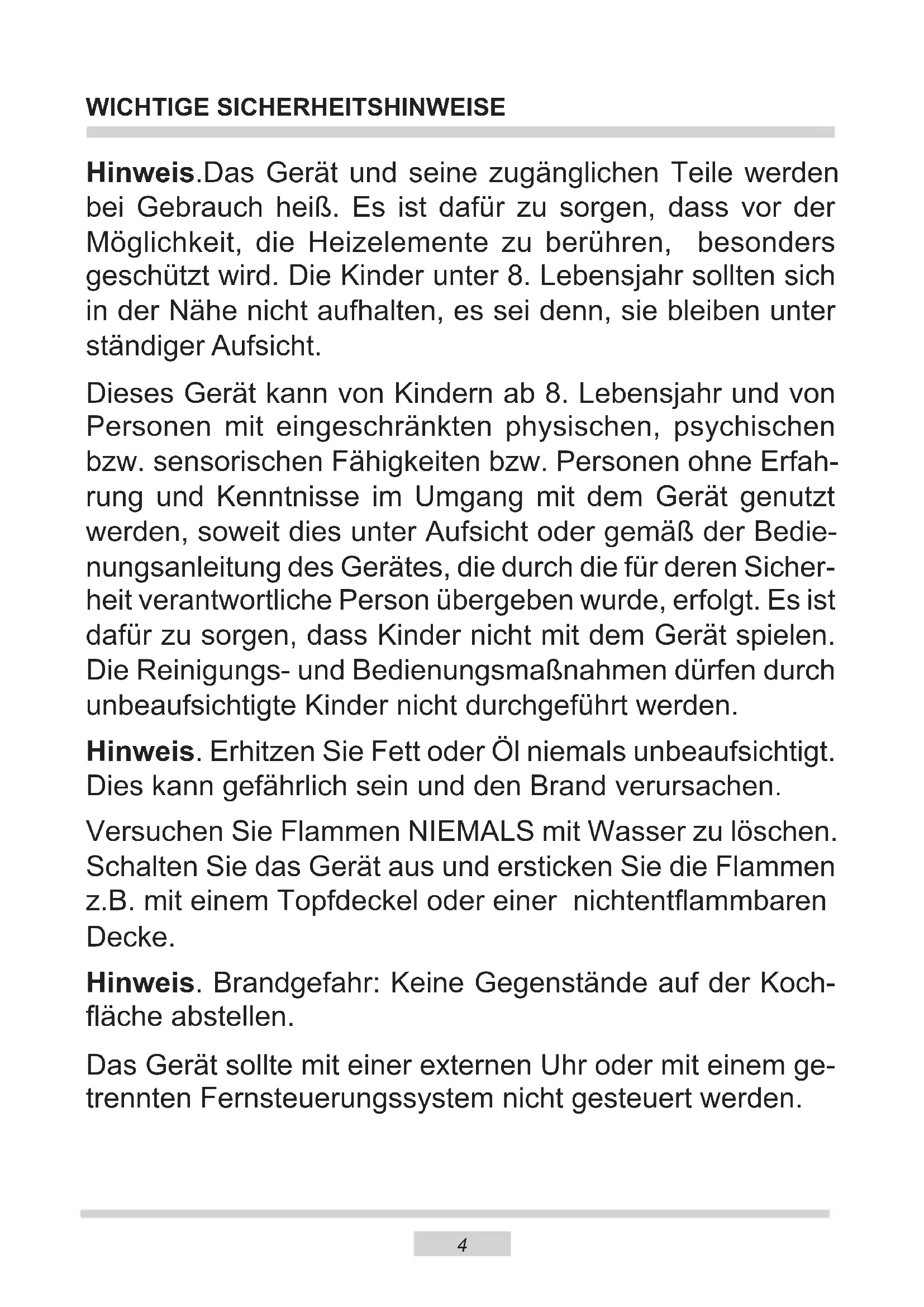 - Vorgehen in Notsituationen WICHTIGE SICHERHEITSHINWEISE Hinweis.Das Gerät und seine zugänglichen Teile werden bei Gebrauch heiß. Es ist dafür zu sorgen, dass vor der Möglichkeit, die Heizelemente zu berühren, besonders geschützt wird. Die Kinder unter 8. Lebensjahr sollten sich in der Nähe nicht aufhalten, es sei denn, sie bleiben unter ständiger Aufsicht. Dieses Gerät kann von Kindern ab 8. Lebensjahr und von Personen mit eingeschränkten physischen, psychischen bzw. sensorischen Fähigkeiten bzw. Personen ohne Erfah- rung und Kenntnisse im Umgang mit dem Gerät genutzt werden, soweit dies unter Aufsicht oder gemäß der Bedie- nungsanleitung des Gerätes, die durch die für deren Sicher- heit verantwortliche Person übergeben wurde, erfolgt. Es ist dafür zu sorgen, dass Kinder nicht mit dem Gerät spielen. Die Reinigungs- und Bedienungsmaßnahmen dürfen durch unbeaufsichtigte Kinder nicht durchgeführt werden. Hinweis. Erhitzen Sie Fett oder Öl niemals unbeaufsichtigt. Dies kann gefährlich sein und den Brand verursachen. Versuchen Sie Flammen NIEMALS mit Wasser zu löschen. Schalten Sie das Gerät aus und ersticken Sie die Flammen z.B. mit einem Topfdeckel oder einer nichtentammbaren Decke. Hinweis. Brandgefahr: Keine Gegenstände auf der Koch- äche abstellen. Das Gerät sollte mit einer externen Uhr oder mit einem ge- trennten Fernsteuerungssystem nicht gesteuert werden.5 WICHTIGE SICHERHEITSHINWEISE Zur Reinigung des Kochfeldes dürfen keine Dampfreiniger verwendet werden. ● Das Gerät sollte nach geltenden Vorschriften installiert und nur in einem entsprechend gelüfteten Raum genutzt werden. Vor Inbetriebnahme und Gebrauch lesen Sie bitte die Bedienungsanleitung aufmerksam durch. ● Es ist dafür zu sorgen, dass Kinder nicht mit dem Gerät spielen. Besonders heiße Oberächenbrenner, Roste, Kochgeschirr mit heißen Flüssigkeiten können zur Verbrennung Ihres Kindes führen. ● Achten Sie darauf, dass elektrische Anschlussleitungen von mechanischen Küchengeräten keine heißen Teile des Kochfeldes berühren. ● Der Stecker der Anschlussleitung sollte nach der Installation des Kochfeldes zugänglich sein. ● Es ist verboten, das Kochfeld in der Nähe der Kühl- oder Gefrieranlagen einzubauen. ● Beim Braten das Kochfeld nicht ohne Aufsicht lassen! Öle und Fette können sich infolge von Überhitzung entzünden. ● Auf den Siedemoment achten, um ein Überlaufen auf den Brenner zu vermeiden. ● Bei Betriebsstörungen darf der Herd erst nach der Beseitigung des Schadens durch eine Fachkraft in Betrieb genommen werden. ● Den Gasanschlusshahn oder das Gasaschenventil nicht öffnen, ohne überprüft zu haben, dass alle Hähne zu sind. ● Vermeiden Sie ein Überlaufen und die Verschmutzung der Brenner. Bei Verschmutzung sofort nach dem Abkühlen reinigen und trocknen. ● Kochgeschirr nicht direkt auf den Brennern abstellen. ● Auf dem Rost über einem Brenner kein Kochgeschirr, das schwerer als 5 kg ist, abstellen. Auf dem gesamten Rost darf kein Kochgeschirr abstellt werden, dessen Gesamtgewicht 25 kg übersteigt. Es ist nicht zulässig, einen Kochtopf auf zwei Brenner gleichzeitig zu stellen. ● Nicht gegen die Drehknöpfe und Brenner schlagen. ● Verboten ist die Durchführung von Umbau- und Instandsetzungsarbeiten am Kochfeld durch unqualizierte Personen. ● Es ist verboten die Gashähne am Herd aufzudrehen, wenn kein angezündetes Streichholz oder sonstiges Gaszündgerät bereitgehalten wird. ● Es ist verboten die Gasamme durch Ausblasen zu löschen. ● Es ist verboten, das Kochfeld willkürlich auf eine andere Gassorte umzustellen, an einen andern Platz zu stellen oder Veränderungen an der Gas- und Elektroinstallation vorzunehmen. Diese Maßnahmen dürfen nur durch einen qualizierten Installateur durchgeführt werden. ● Kleinkinder und Personen, die nicht mit Bedienungsanleitung des Herdes vertraut sind, nicht an den Herd lassen.6 SICHERHEITSHINWEISE ● BEI VERDACHT, DASS GAS ENTWEICHT, IST ES VERBOTEN: Streichhölzer anzuzünden, zu rauchen, elektrische Stromverbraucher ein- oder auszuschalten (Klingel oder Lichtschalter) und andere elektrische und mechanische Geräte, die Funkenbildung verursachen können, zu gebrauchen. In solch einem Fall ist das Ventil der Gasasche beziehungsweise das Absperrhahn der Gasanschlussleitung sofort zu schließen und der Raum zu lüften, anschließend ist eine befugte Fachkraft zur Beseitigung der Störungsursache hinzuzuziehen. ● Bei Betriebsstörungen infolge technischer Mängel muss unbedingt die Stromzufuhr unterbrochen (Vorgehensweise wie oben) und eine Reparatur veranlasst werden. ● An die Gasinstallation dürfen keine Antennenleitungen,z. B. Radios, angeschlossen werden. ● Falls es zu einer Entzündung des entweichenden Gases aus einer undichten Installation kommt, ist die Gaszufuhr sofort am Absperrhahn zu schließen. ● Falls es zu einer Entzündung des entweichenden Gases aus einem undichten Gasaschenventil kommt, ist wie folgt vorzugehen: die Gasasche mit einer nassen Decke verdecken, um die Gasasche abzukühlen, das Gasaschenventil schließen. Nach dem Abkühlen die Gasasche ins Freie bringen. Die Wiederverwendung von beschädigten Gasaschen ist untersagt. ● Wird das Kochfeld für einige Tage nicht genutzt, das Haupthahn der Gasinstallation schließen. Falls Gasaschen verwendet werden, das Gasventil nach jeder Nutzung schließen. ● Hinweis! Sollte das nicht trennbare Netzanschlusskabel beschädigt werden, sollte dieses beim Hersteller oder in einer Fachwerkstatt durch eine qualizierte Person zur Vermeidung der Gefahr neu besorgt werden. ● Beim Kochen und Braten werden Wärme und Feuchtigkeit im Raum, in dem dieses Gerät installiert ist, erzeugt. Man sollte sich vergewissern, ob der Küchenraum entsprechend gelüftet wird. Öffnungen für natürliche Lüftung müssen geöffnet sein oder andere Systeme mechanischer Lüftung eingebaut werden (mechanischer Dunstabzug). ● Sollte das Ger