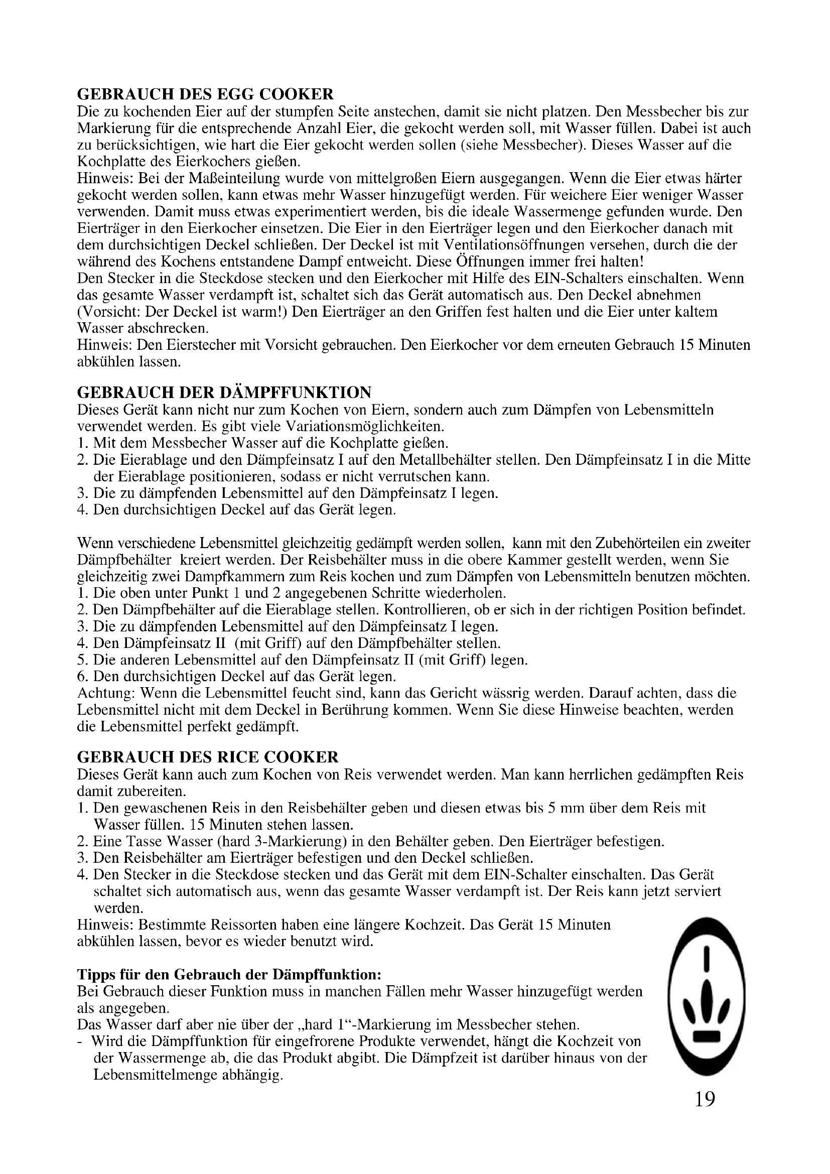 Die zu kochenden Eier auf der stumpfen Seite anstechen, damit sie nicht platzen. Den Messbecher bis zur Markierung für die entsprechende Anzahl Eier, die gekocht werden soll, mit Wasser füllen. Dabei ist auch zu berücksichtigen, wie hart die Eier gekocht werden sollen (siehe Messbecher). Dieses Wasser auf die Kochplatte des Eierkochers gießen. Hinweis: Bei der Maßeinteilung wurde von mittelgroßen Eiern ausgegangen. Wenn die Eier etwas härter gekocht werden sollen, kann etwas mehr Wasser hinzugefügt werden. Für weichere Eier weniger Wasser verwenden. Damit muss etwas experimentiert werden, bis die ideale Wassermenge gefunden wurde. Den Eierträger in den Eierkocher einsetzen. Die Eier in den Eierträger legen und den Eierkocher danach mit dem durchsichtigen Deckel schließen. Der Deckel ist mit Ventilationsöffnungen versehen, durch die der während des Kochens entstandene Dampf entweicht. Diese Öffnungen immer frei halten! Den Stecker in die Steckdose stecken und den Eierkocher mit Hilfe des EIN-Schalters einschalten. Wenn das gesamte Wasser verdampft ist, schaltet sich das Gerät automatisch aus. Den Deckel abnehmen (Vorsicht: Der Deckel ist warm!) Den Eierträger an den Griffen fest halten und die Eier unter kaltem Wasser abschrecken. Hinweis: Den Eierstecher mit Vorsicht gebrauchen. Den Eierkocher vor dem erneuten Gebrauch 15 Minuten abkühlen lassen.