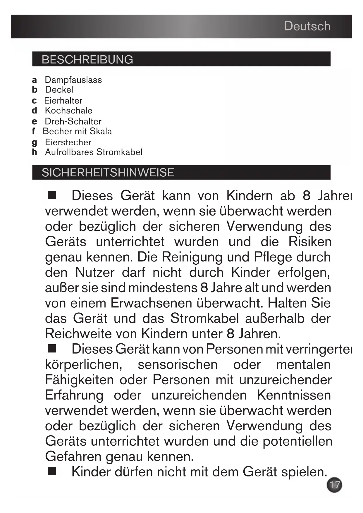 Fill the lower part of the appliance with cold water depending on the cooking method selected. Use the water jug for the quantity of water required (1 to 2). Place the egg holder on the lower part of the appliance (place the egg holder in the right way - 3). Turn the water jug and position it so it is flat with the egg piercing spike uppermost. Take each egg and place it on the Egg piercing spike so that the shell is pierced, to prevent the egg from cracking during cooking. (4). Position the eggs evenly around the egg holder. (5). Make sure to place the eggs in such a way that the opening is at the top. (If you want to cook less than seven eggs, place them along the edge of the holder). Place the lid correctly on the egg holder. (6). Unwind the power cord completely and plug in. Turn the knob to the right to the " " setting. (7). The indicator light comes on and the appliance starts operating. (7). During cooking some hot steam will escape through the small opening on the top of the lid, this is completely normal. (8). Do not place hands over this opening in the lid during cooking. Clean the appliance (unplugged) and its accessories using a damp cloth and dry. END OF COOKING: When the water has evaporated, a beep sounds to advise that cooking has ended. Turn the knob to the O setting. (9). The indicator light goes out and the appliance stops operating. The eggs are ready.16 English DESCALING PROTECTING THE ENVIRONMENT! The appliance must be descaled from time to time, preferably once a month, depending on how often it is used and more frequently if the water has a high calcium content. To descale your appliance. Use: – 20 g of commercially available white vinegar added to a jug of water; – Place the liquid in the lower part of the appliance; – Allow to heat for 10 mins without a lid; – Stop the appliance, unplug and empty out the liquid; – Rinse the cooking bowl using a damp sponge; – Leave the appliance to cool; – Allow the appliance to cool down completely before storing. Your appliance contains valuable materials which can be recovered or recycled. Leave it at a local civic waste collection point or an approved service centre. CLEANING AND MAINTENANCE: KEEPING HARD BOILED EGGS WARM: Before any cleaning or maintenance, unplug and leave the appliance to cool. The lid and egg holder are cleaned using water and washing up liquid. Wipe the appliance exterior and the cord using a damp cloth. Leave to dry. Do this regularly, ideally after each use. You can keep hard boiled eggs warm by placing the egg holder and its lid on the lower part of the cooker without water. Turn the knob to the center to the setting. The indicator light comes on. The appliance starts working and keeps the eggs warm. (13). Remove the lid using oven gloves as the appliance is still hot and hot steam escapes through the opening on the lid. (10). Grab the egg holder by the handle (using oven gloves if necessary). (11). Remove the egg holder from the appliance and run under cold water to cool the eggs. (12).17 Deutsch BESCHREIBUNG SICHERHEITSHINWEISE a Dampfauslass b Deckel c Eierhalter d Kochschale e Dreh-Schalter f Becher mit Skala g Eierstecher h Aufrollbares Stromkabel Dieses Gerät kann von Kindern ab 8 Jahren verwendet werden, wenn sie überwacht werden oder bezüglich der sicheren Verwendung des Geräts unterrichtet wurden und die Risiken genau kennen. Die Reinigung und Pflege durch den Nutzer darf nicht durch Kinder erfolgen, außer sie sind mindestens 8 Jahre alt und werden von einem Erwachsenen überwacht. Halten Sie das Gerät und das Stromkabel außerhalb der Reichweite von Kindern unter 8 Jahren. Dieses Gerät kann von Personen mit verringerten körperlichen, sensorischen oder mentalen Fähigkeiten oder Personen mit unzureichender Erfahrung oder unzureichenden Kenntnissen verwendet werden, wenn sie überwacht werden oder bezüglich der sicheren Verwendung des Geräts unterrichtet wurden und die potentiellen Gefahren genau kennen. Kinder dürfen nicht mit dem Gerät spielen.18 Deutsch Ihr Gerät ist ausschließlich für den Hausgebrauch bestimmt. Dieses Gerät darf nicht von Personen (inbegriffen Kindern) mit eingeschränkten körperlichen, sensorischen oder geistigen Fähigkeiten benutzt werden. Das Gleiche gilt für Personen, die keine Erfahrung mit dem Gerät besitzen oder sich mit ihm nicht auskennen, außer wenn sie von einer für ihre Sicherheit verantwortlichen Person beaufsichtigt werden oder von dieser mit dem Gebrauch des Gerät vertraut gemacht wurden. Kinder müssen beaufsichtigt werden, damit sie nicht mit dem Gerät spielen. Es wurde nicht entwickelt, um in folgenden, nicht von der Garantie gedeckten Fällen verwendet zu werden: – in Küchen für Mitarbeiter, in Läden, Büros und anderen gewerblichen Bereichen, – in landwirtschaftlichen Anwesen, – von Kunden in Hotels, Motels und anderen Wohneinrichtungen, – in Frühstückspensionen. Um Unfälle zu vermeiden, muss eine beschädigte Zuleitung des Gerätes durch einen autorisierten Servicepartner oder eine ähnlich qualifizierte Person ersetzt werden. Achten Sie darauf, dass Sie sich nicht am Eierstecher verletzen.19 Deutsch Vorsicht: Die Oberfläche des Heizelements ist auch nach dem Gebrauch noch heiß. Vorsicht: Verletzungsgefahr bei falscher Benutzung des Gerätes. Reinigen Sie das Zubehör und die Teile, die mit Lebensmitteln in Berührung kommen, mit einem feuchten Tuch oder Schwamm mit etwas Geschirrspülmittel. Mit einem feuchten Tuch oder Schwamm abwischen. Zubehör und die Teile, die mit Lebensmitteln in Berührung kommen, mit einem trockenen Tuch abtrocknen. Um Ihre Sicherheit zu gewährleisten, entspricht dieses Gerät den gültigen Normen und Vorschriften (Richtlinien zur Niederspannung, elektromagnetischen Verträglichkeit, Lebensmittelechtheit von Materialien, Umweltverträglichkeit,...). Lesen Sie bitte die Gebrauchsanleitung sorgfältig durch und bewahren Sie diese griffbereit auf. Die Gebrauchsanleitung ist