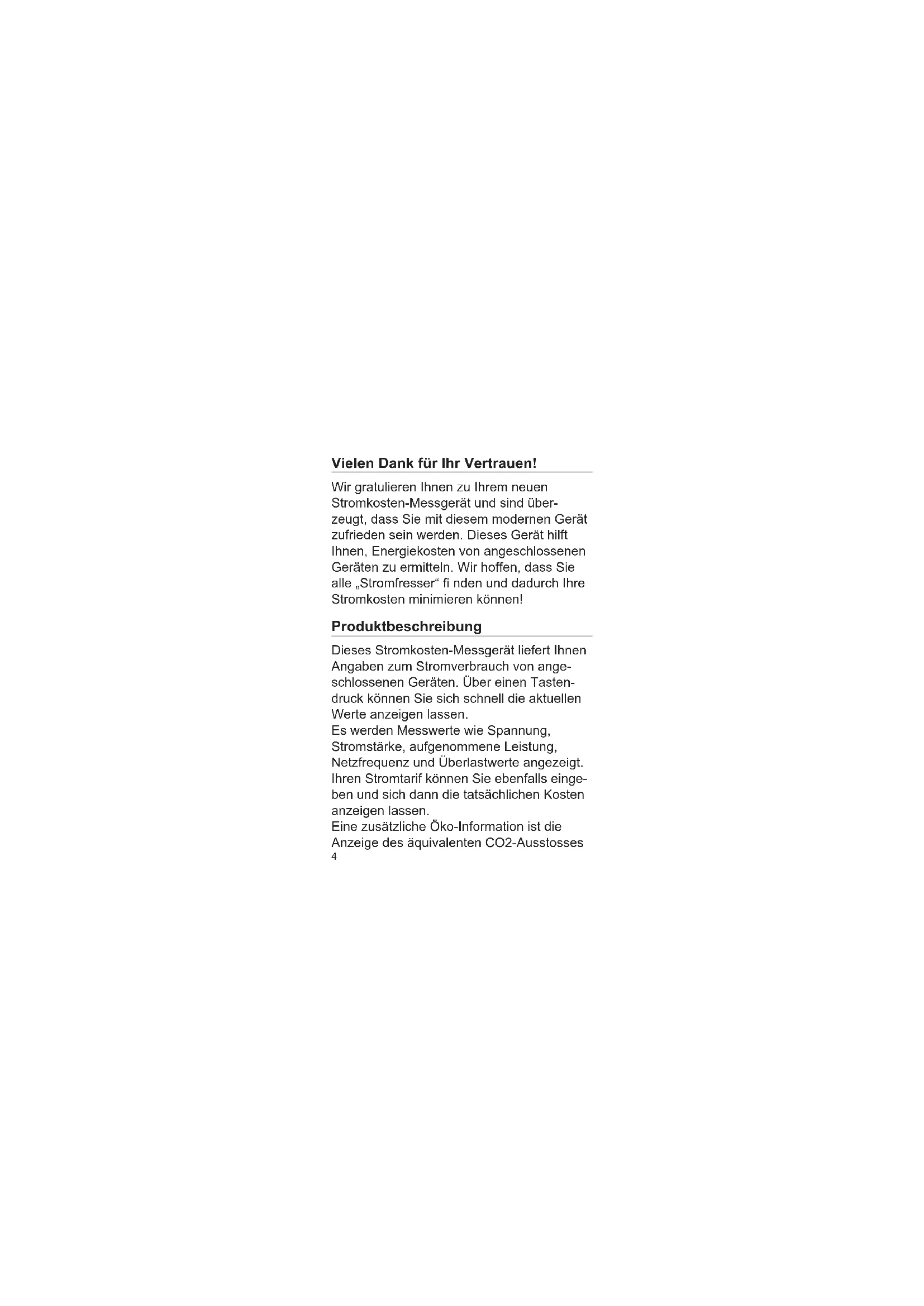 - Garantie Vielen Dank für Ihr Vertrauen! Wir gratulieren Ihnen zu Ihrem neuen Stromkosten-Messgerät und sind über- zeugt, dass Sie mit diesem modernen Gerät zufrieden sein werden. Dieses Gerät hilft Ihnen, Energiekosten von angeschlossenen Geräten zu ermitteln. Wir hoffen, dass Sie alle „Stromfresser“ Þ nden und dadurch Ihre Stromkosten minimieren können! Produktbeschreibung Dieses Stromkosten-Messgerät liefert Ihnen Angaben zum Stromverbrauch von ange- schlossenen Geräten. Über einen Tasten- druck können Sie sich schnell die aktuellen Werte anzeigen lassen. Es werden Messwerte wie Spannung, Stromstärke, aufgenommene Leistung, Netzfrequenz und Überlastwerte angezeigt. Ihren Stromtarif können Sie ebenfalls einge- ben und sich dann die tatsächlichen Kosten anzeigen lassen. Eine zusätzliche Öko-Information ist die Anzeige des äquivalenten CO2-Ausstosses5 in kg. Ferner zeigt Ihnen das Messgerät den Gesamtverbrauch in einer Messperiode bis zu sieben Monaten, sowie die dazugehörige Betriebsdauer an. Bevor Sie das Gerät benutzen Prüfen Sie nach dem Auspacken sowie vor jedem Gebrauch, ob der Artikel Schäden aufweist. Sollte dies der Fall sein, benutzen Sie den Artikel nicht, sondern benachrichti- gen Sie bitte Ihren Händler. Die Bedienungsanleitung basiert auf den in der Europäischen Union gültigen Normen und Regeln. Beachten Sie im Ausland auch landesspeziÞ sche Richtlinien und Gesetze! Bevor Sie Ihr Gerät benutzen, lesen Sie bitte zuerst die Bedienungsanleitung und die Sicherheitshinweise aufmerksam durch. Nur so können Sie alle Funktionen sicher und zuverlässig nutzen. Bewahren Sie die Bedienungsanleitung sowie den Kassenbon und nach Möglichkeit auch die Verpackung gut auf. Wenn Sie das Gerät verleihen, verschenken6 oder verkaufen, geben Sie auch die Bedie- nungsanleitung mit. Bestimmungsgemäßer Gebrauch Das Gerät dient zur Ermittlung des Strom- verbrauchs angeschlossener Verbraucher sowie der resultierenden Kosten. Der Artikel ist nur für den Privatgebrauch und nicht für die gewerbliche Nutzung bestimmt. Verwenden Sie den Artikel nur wie in dieser Bedienungsanleitung beschrie- ben. Jede andere Verwendung gilt als nicht bestimmungsgemäß und kann zu Sachschä- den oder sogar zu Personenschäden führen. Der Hersteller übernimmt keine Haftung für Schäden, die durch nicht bestimmungsge- mäßen Gebrauch entstanden sind. Sicherheitshinweise Bevor Sie Ihr Stromkosten-Mess- gerät in Betrieb nehmen, beachten Sie folgende Punkte: Fehlerhafte Elektroinstallation oder zu •7 hohe Netzspannung kann zu elektri- schem Stromschlag führen. Das Gerät ist ausschl. für 220-240 • V / 50 Hz Wechselspannung geeignet für eine maximale Leistungserfassung bis 2300 Watt. Beachten Sie bitte hierzu die technischen Daten, siehe Inhaltsver- zeichnis. Schließen Sie das Gerät nur an einer • ordnungsgemäß installierten und abge- sicherten 230 V Schutzkontaktsteckdo- se an. Betreiben Sie das Gerät nicht, wenn es • sichtbare Schäden aufweist oder der Netzstecker defekt ist. Öffnen Sie das Gehäuse nicht, son-• dern überlassen Sie die Reparatur Fachkräften. Wenden Sie sich dazu an eine Fachwerkstatt. Bei eigenständig durchgeführten Reparaturen, unsach- gemäßem Anschluss oder falscher Bedienung sind Haftungs- und Garan- tieansprüche ausgeschlossen. Verwenden Sie das Gerät nur in trocke-•8 nen Innenräumen. Betreiben Sie es nie in Feuchträumen oder im Freien. Das Gerät darf nicht mit Tropf- oder • Spritzwasser bzw. anderen Flüssigkei- ten in Berührung kommen. Halten Sie einen Mindestabstand zu • Feuchtquellen wie Waschbecken o. ä. von einem Meter ein. Fassen Sie das Gerät niemals mit • feuchten Händen an. Greifen Sie niemals nach einem Elek-• trogerät, wenn es ins Wasser gefallen ist. Trennen Sie das Gerät in so einem Fall sofort vom Netz. Nehmen Sie keine Änderungen am • Gerät vor. Stecken Sie nicht mehrere Stromkos-• ten-Messgeräte hintereinander bzw. verbinden Sie das Gerät nicht mit ähnli- chen Geräten. Decken Sie das Gerät nicht ab, es • besteht Überhitzungsgefahr. Wenn Sie das Gerät nicht benutzen • oder wenn eine Störung auftritt, ziehen Sie es aus der Steckdose.9 Die Steckdose dient als Trennvorrich-• tung zum Netz und muss ohne Schwie- rigkeiten zugänglich sein. Gefahren für Kinder! Kinder erkennen Gefahren häuÞ g nicht oder unterschätzen sie. Halten Sie Verpackungsbeutel und • –folien von Babys und Kleinkindern fern. Es besteht Erstickungsgefahr! Dieses Gerät ist nicht dafür bestimmt, • durch Personen (einschließlich Kinder) mit eingeschränkten physischen, senso- rischen, oder geistigen Fähigkeiten oder mangels Erfahrung und/oder mangels Wissen benutzt zu werden. Es sei denn, sie werden durch eine für ihre Sicher- heit zuständige Person beaufsichtigt oder erhalten von ihr Anweisungen, wie das Gerät zu benutzen ist. Beaufsichtigen Sie Kinder und bewah-• ren Sie das Gerät außerhalb deren Reichweite auf, um sicherzustellen, dass sie nicht mit dem Gerät spielen. Unsachgemäßer Gebrauch bedeutet Stromschlaggefahr!10 Hinweise zur Batterie Das Stromkosten-Messgerät wird mit 2 Batterien (Knopfzellen) des Typs LR44 bzw. AG13 bestückt (diese Batterien sind im Lieferumfang enthalten). Verwenden Sie nur den hier ange- gebenen Batterietyp, um Gefahren durch Brand und Explosion zu vermeiden. Niemals versuchen, Batterien aufzula-• den. Batterien nicht ins Feuer werfen, nicht • kurzschließen oder auseinander neh- men! Es besteht Explosionsgefahr! Batterien von Kindern fernhalten. Sofort • einen Arzt aufsuchen, wenn eine Batte- rie verschluckt wurde. Erschöpfte Batterien umgehend aus • dem Gerät entfernen! Erhöhte Auslauf- gefahr! Batterien keinen extremen Bedingungen • aussetzen, z. B. auf Heizkörpern oder in direkter Sonnenstrahlung! Es besteht dann erhöhte Auslaufgefahr!11 Kontakt mit Haut, Augen und Schleim-• häuten vermeiden. Bei Kontakt mit Bat- teriesäure die betroffen