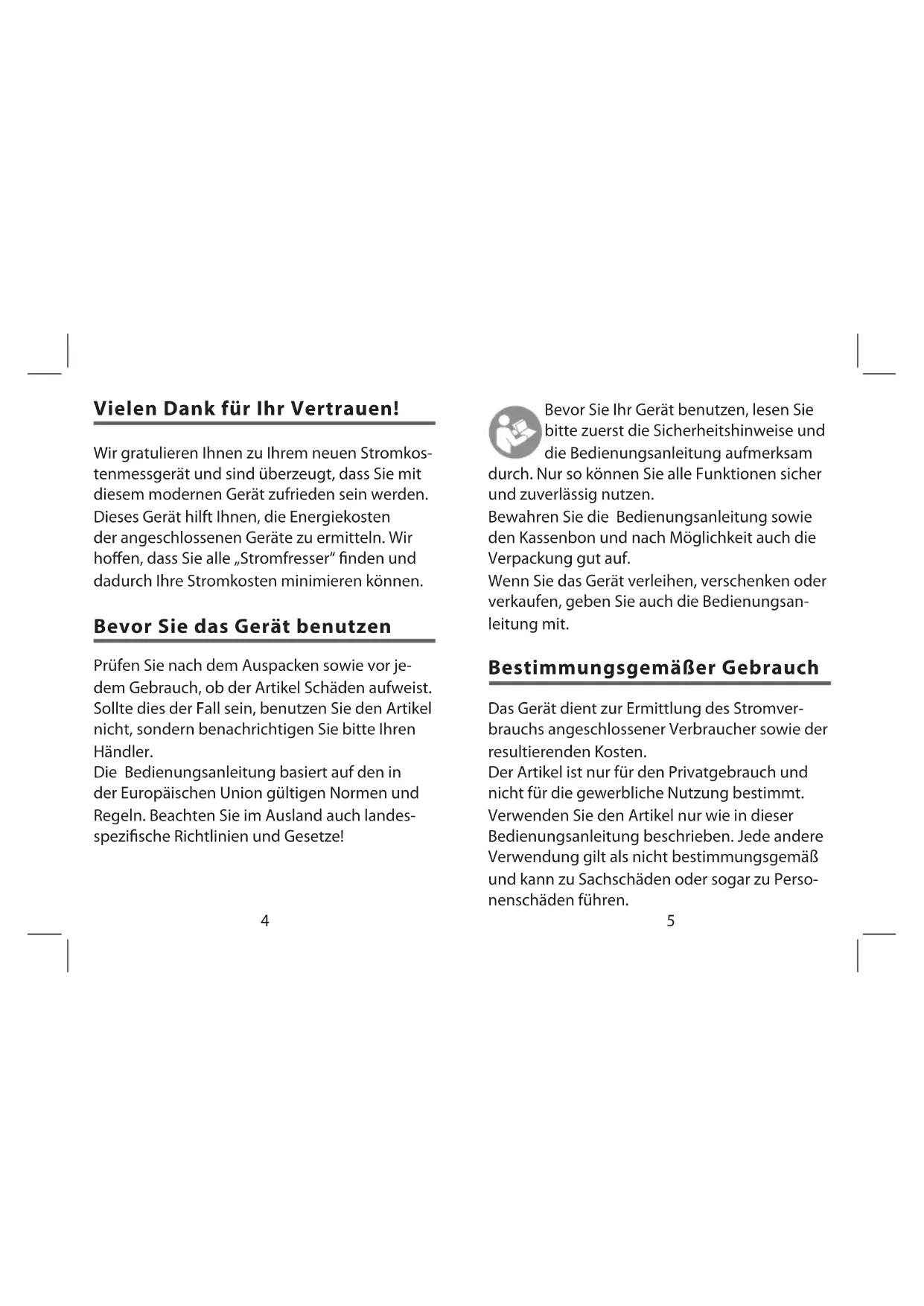 Vielen Dank für Ihr Vertrauen! Wir gratulieren Ihnen zu Ihrem neuen Stromkos- tenmessgerät und sind überzeugt, dass Sie mit diesem modernen Gerät zufrieden sein werden. Dieses Gerät hilft Ihnen, die Energiekosten der angeschlossenen Geräte zu ermitteln. Wir hoffen, dass Sie alle „Stromfresser“ finden und dadurch Ihre Stromkosten minimieren können. Bevor Sie das Gerät benutzen Prüfen Sie nach dem Auspacken sowie vor je- dem Gebrauch, ob der Artikel Schäden aufweist. Sollte dies der Fall sein, benutzen Sie den Artikel nicht, sondern benachrichtigen Sie bitte Ihren Händler. Die Bedienungsanleitung basiert auf den in der Europäischen Union gültigen Normen und Regeln. Beachten Sie im Ausland auch landes- spezifische Richtlinien und Gesetze! Bevor Sie Ihr Gerät benutzen, lesen Sie bitte zuerst die Sicherheitshinweise und die Bedienungsanleitung aufmerksam durch. Nur so können Sie alle Funktionen sicher und zuverlässig nutzen. Bewahren Sie die Bedienungsanleitung sowie den Kassenbon und nach Möglichkeit auch die Verpackung gut auf. Wenn Sie das Gerät verleihen, verschenken oder verkaufen, geben Sie auch die Bedienungsan- leitung mit. Bestimmungsgemäßer Gebrauch Das Gerät dient zur Ermittlung des Stromver- brauchs angeschlossener Verbraucher sowie der resultierenden Kosten. Der Artikel ist nur für den Privatgebrauch und nicht für die gewerbliche Nutzung bestimmt. Verwenden Sie den Artikel nur wie in dieser Bedienungsanleitung beschrieben. Jede andere Verwendung gilt als nicht bestimmungsgemäß und kann zu Sachschäden oder sogar zu Perso- nenschäden führen.6