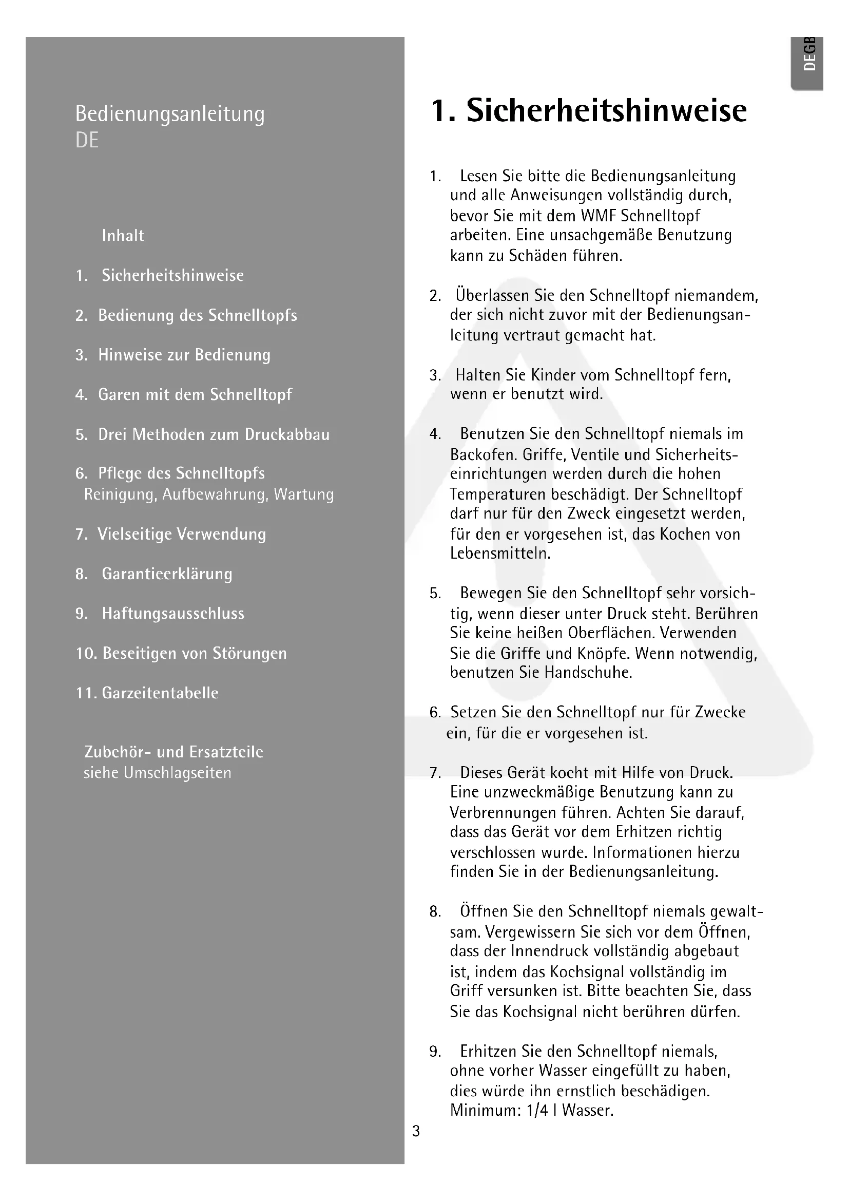 4.1. Allgemeines Im Schnelltopf garen die Speisen unter Druck, d.h. mit Temperaturen über 100 °C. Dadurch verkürzen sich die Garzeiten bis zu 70 %, eine deutliche Energieeinsparung. Durch das kurze Garen im Dampf bleiben Aroma, Ge- schmack und Vitamine weitgehend erhalten. 4.2. Garen mit Einsätzen Je nach Größe des Schnelltopfs können Sie mit Einsätzen (12) und Steg (13) garen. Einsatz und Steg erhalten Sie als Zubehör im Fachhandel (siehe »Zubehör und Ersatzteile« im Umschlag). 4.3. Aufheizen Verschlossenen, gefüllten Topf auf Heizquelle setzen und auf höchste Energiezufuhr ein- stellen. Über die Ankochautomatik (9), die zugleich Sicherheitsventil ist, entweicht in der Ankochphase so lange Luft, bis das Ventil hörbar schließt und sich Druck aufbauen kann. Das Kochsignal (1) steigt an, der gelbe Druck- ring und die beiden orangefarbenen Kochringe werden sichtbar (J). Verringern Sie die Energiezufuhr rechtzeitig und ausreichend, so dass der im Rezept empfohlene orangefarbene Kochring gerade noch sichtbar bleibt. 4.4. Garzeiten Die Garzeit beginnt erst dann, wenn der im Rezept empfohlene Kochring ganz sichtbar ist. Achten Sie darauf, dass die Ringposition stabil bleibt. Regulieren Sie die Energiezufuhr entsprechend. Sinkt das Kochsignal (1) unter den gewünschten orangefarbenen Kochring, müssen Sie die Heizquelle wieder höher stellen. Die Garzeit verlängert sich dadurch etwas. Steigt das Kochsignal (1) über den zweiten orangefarbenen Kochring hinaus, entsteht zu hoher Dampfdruck, der über das Hauptventil (3) am Deckelgriff hörbar entweicht. Den Topf von der Kochstelle nehmen, warten bis sich das Kochsignal auf den zweiten oran- gefarbenen Kochring gesenkt hat und Energie- zufuhr zurückschalten. Die kurzen Garzeiten sind beim Schnellkochen deshalb möglich, weil durch den Dampfdruck im Topf höhere Temperaturen herrschen: Erster Ring, ca. 110°C für empfindliche Speisen wie Fisch oder Kompott. (45 kPa Betriebsdruck, 130 kPa Regeldruck) Zweiter Ring, ca. 119 °C für alle übrigen Speisen. (95 kPa Betriebsdruck, 130 kPa Regeldruck) Energiebewusste schalten die Heizquelle bereits vor Beendigung der Garzeit aus, da die im Topf gespeicherte Wärme ausreicht, den Garprozess zu beenden. Garzeiten können bei demselben Gargut unterschiedlich sein, da Menge, Form und Beschaffenheit des Lebensmittels variieren. 4.5. Öffnen des Topfes Nach Ablauf der Garzeit Schnelltopf von der Heizquelle nehmen. Grundsätzlich darf der Deckel nur geöffnet und vom Topf genommen werden, wenn der Topf drucklos ist, d.h. das Kochsignal (1) muss vollkommen im Griff verschwunden sein (I).9 8 DEGBESBGDKFIFRGRITNLNOPLPTRUSESKSICZTRHUHR ungelochten Einsatz setzen und bei Bedarf zu- ckern. Beim 2. orangefarbenen Kochring garen. Je nach Obstsorte liegt die Zeit zwischen 10-20 Minuten. Topf unter flie- ßendem Wasser drucklos machen (Methode 3). Vor dem Öffnen kurz rütteln. 7.5. Sterilisieren Babyflaschen, Einmachgläser etc. können schnell sterilisiert werden. Teile mit der Öffnung nach unten in den gelochten Einsatz stellen, 1/4 l Wasser zugeben und 20 min beim 2. orangefarbenen Kochring sterilisieren. Langsam abkühlen lassen (Methode 1). 7.6. Garen mit Einsätzen Je nach Größe des Schnelltopfs können Sie mit Einsätzen und Steg garen. Einsatz und Steg erhalten Sie als Zubehör im Fachhandel. Sie können im Schnelltopf auch mehrere Gerichte gleichzeitig zubereiten. Die einzelnen Beilagen werden durch Einsätze getrennt. Das Gericht mit der längsten Garzeit wird zuerst ohne Einsatz in den Topf gefüllt. Beispiele Braten (20 min) – Topfboden Kartoffeln (8 min) – gelochter Einsatz Gemüse (8 min) – ungelochter Einsatz Den Braten zunächst 12 min garen. Dann den Topf nach Anleitung öffnen. Kartoffeln im gelochten Einsatz auf den Steg stellen, Gemüse im ungelochten Einsatz einsetzen, Topf schlie- ßen und weitere 8 min garen. Unterscheiden sich die Garzeiten nicht wesentlich, können alle Einsätze gleichzeitig in den Topf gegeben werden. Durch das Öffnen zwischendurch ent- weicht Dampf, geben Sie deshalb etwas mehr als die erforderliche Flüssigkeit in den Topf.