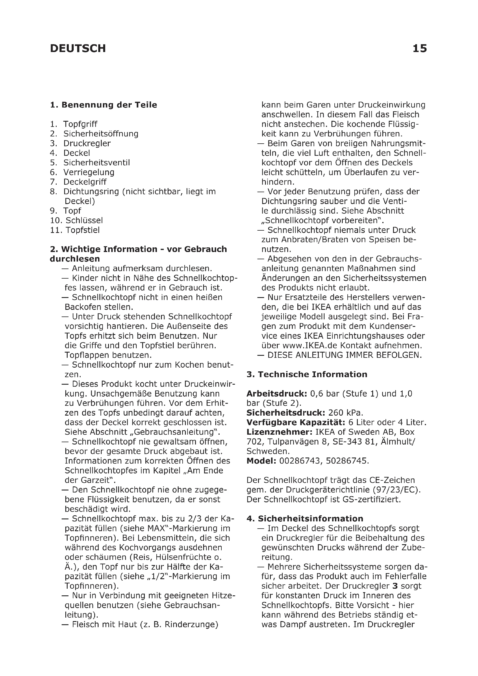 Arbeitsdruck: 0,6 bar (Stufe 1) und 1,0 bar (Stufe 2). Sicherheitsdruck: 260 kPa. Verfügbare Kapazität: 6 Liter oder 4 Liter. Lizenznehmer: IKEA of Sweden AB, Box 702, Tulpanvägen 8, SE-343 81, Älmhult/ Schweden. Model: 00286743, 50286745. Der Schnellkochtopf trägt das CE-Zeichen gem. der Druckgeräterichtlinie (97/23/EC). Der Schnellkochtopf ist GS-zertiziert.