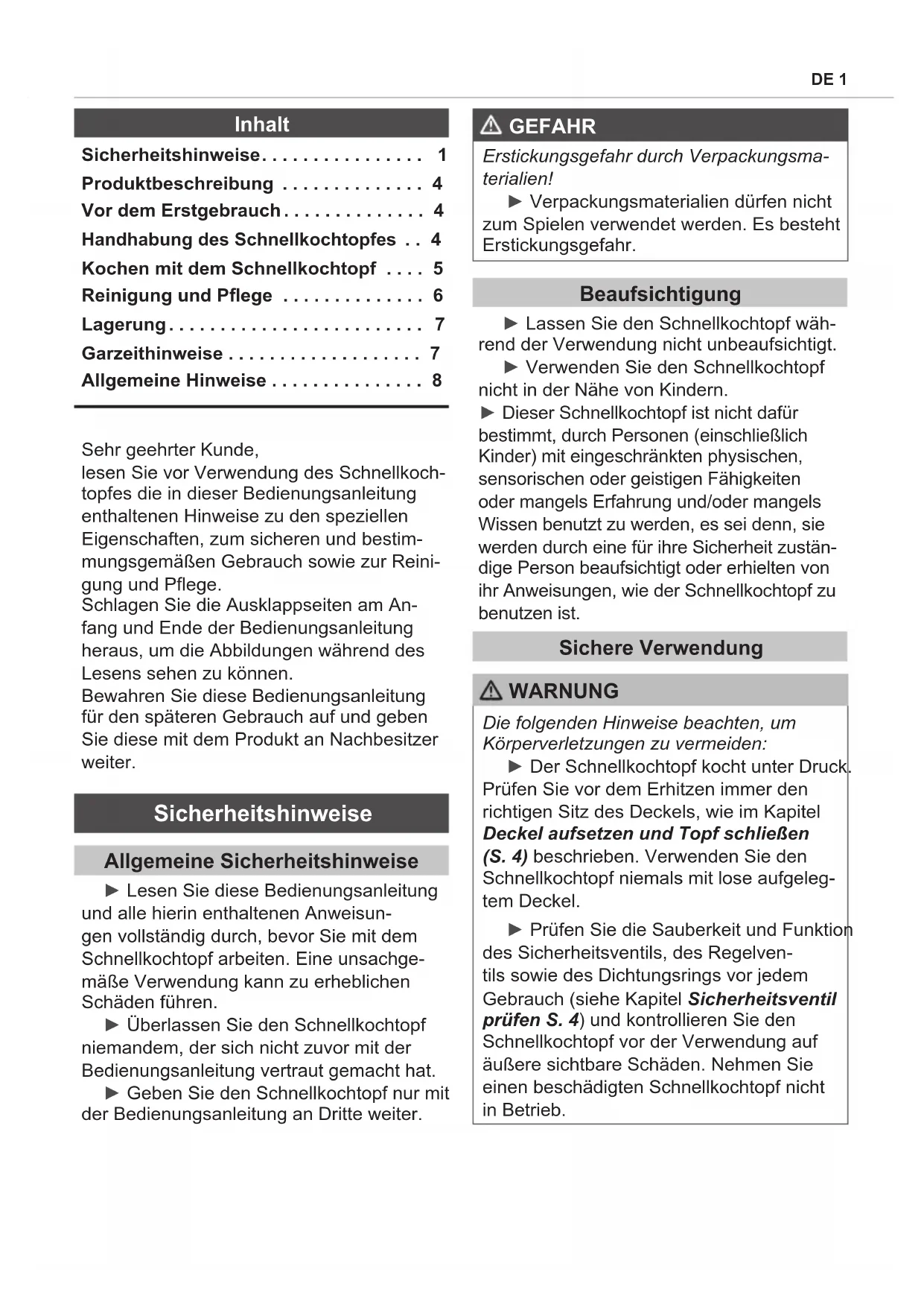 Авторское право Настоящий документ защищен авторским правом. Тиражирование или перепечатка, в том числе частичная, а также воспроиз- ведение рисунков, в том числе в изменен- ном виде, до-пускаются только с письмен- ного согласия из-готовителя.DE 1 Sehr geehrter Kunde, lesen Sie vor Verwendung des Schnellkoch- topfes die in dieser Bedienungsanleitung enthaltenen Hinweise zu den speziellen Eigenschaften, zum sicheren und bestim- mungsgemäßen Gebrauch sowie zur Reini- gung und Pege. Schlagen Sie die Ausklappseiten am An- fang und Ende der Bedienungsanleitung heraus, um die Abbildungen während des Lesens sehen zu können. Bewahren Sie diese Bedienungsanleitung für den späteren Gebrauch auf und geben Sie diese mit dem Produkt an Nachbesitzer weiter. Sicherheitshinweise Allgemeine Sicherheitshinweise ► Lesen Sie diese Bedienungsanleitung und alle hierin enthaltenen Anweisun- gen vollständig durch, bevor Sie mit dem Schnellkochtopf arbeiten. Eine unsachge- mäße Verwendung kann zu erheblichen Schäden führen. ► Überlassen Sie den Schnellkochtopf niemandem, der sich nicht zuvor mit der Bedienungsanleitung vertraut gemacht hat. ► Geben Sie den Schnellkochtopf nur mit der Bedienungsanleitung an Dritte weiter. GEFAHR Erstickungsgefahr durch Verpackungsma- terialien! ► Verpackungsmaterialien dürfen nicht zum Spielen verwendet werden. Es besteht Erstickungsgefahr. Beaufsichtigung ► Lassen Sie den Schnellkochtopf wäh- rend der Verwendung nicht unbeaufsichtigt. ► Verwenden Sie den Schnellkochtopf nicht in der Nähe von Kindern. ► Dieser Schnellkochtopf ist nicht dafür bestimmt, durch Personen (einschließlich Kinder) mit eingeschränkten physischen, sensorischen oder geistigen Fähigkeiten oder mangels Erfahrung und/oder mangels Wissen benutzt zu werden, es sei denn, sie werden durch eine für ihre Sicherheit zustän- dige Person beaufsichtigt oder erhielten von ihr Anweisungen, wie der Schnellkochtopf zu benutzen ist. Sichere Verwendung WARNUNG Die folgenden Hinweise beachten, um Körperverletzungen zu vermeiden: ► Der Schnellkochtopf kocht unter Druck. Prüfen Sie vor dem Erhitzen immer den richtigen Sitz des Deckels, wie im Kapitel Deckel aufsetzen und Topf schließen (S. 4) beschrieben. Verwenden Sie den Schnellkochtopf niemals mit lose aufgeleg- tem Deckel. ► Prüfen Sie die Sauberkeit und Funktion des Sicherheitsventils, des Regelven- tils sowie des Dichtungsrings vor jedem Gebrauch (siehe Kapitel Sicherheitsventil prüfen S. 4) und kontrollieren Sie den Schnellkochtopf vor der Verwendung auf äußere sichtbare Schäden. Nehmen Sie einen beschädigten Schnellkochtopf nicht in Betrieb. Sicherheitshinweise ................ 1 Produktbeschreibung .............. 4 Vor dem Erstgebrauch .............. 4 Handhabung des Schnellkochtopfes
