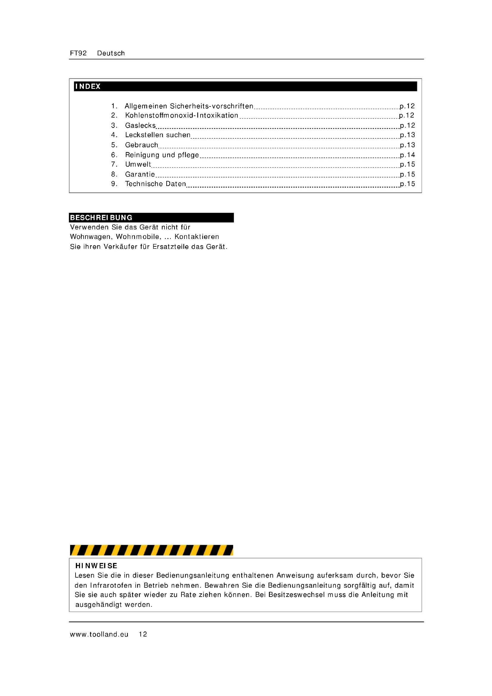 FT 92 - Heizung Toolland - Kostenlose Bedienungsanleitung