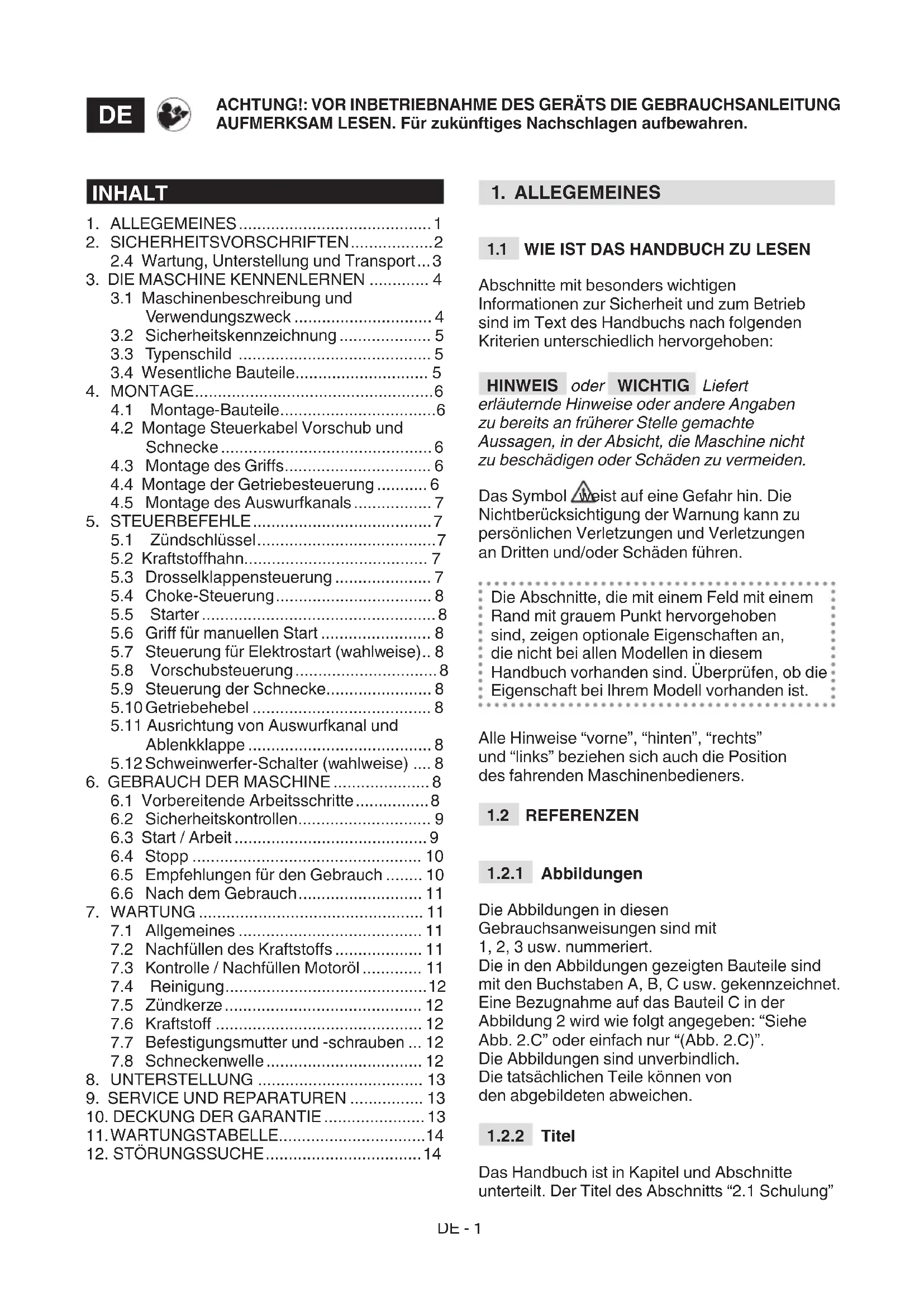 Diese Maschine wurde für Schneeräumen, Entfernung und Ausstoßung von Schnee auf Gehsteigen, Gärten, Zufahrten und anderen Flächen auf Bodenhöhe geplant und gebaut. Der Schneeräumer darf ausschließlich zum Räumen von Schnee verwendet werden.