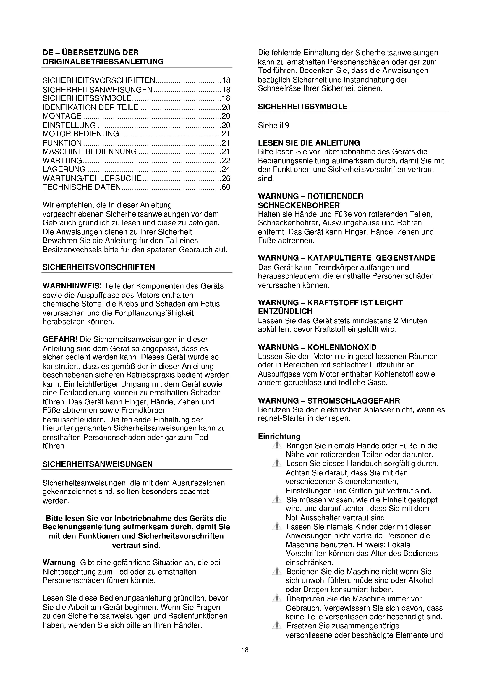 Die fehlende Einhaltung der Sicherheitsanweisungen kann zu ernsthaften Personenschäden oder gar zum Tod führen. Bedenken Sie, dass die Anweisungen bezüglich Sicherheit und Instandhaltung der Schneefräse Ihrer Sicherheit dienen.